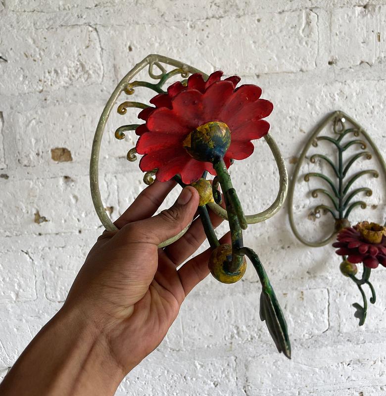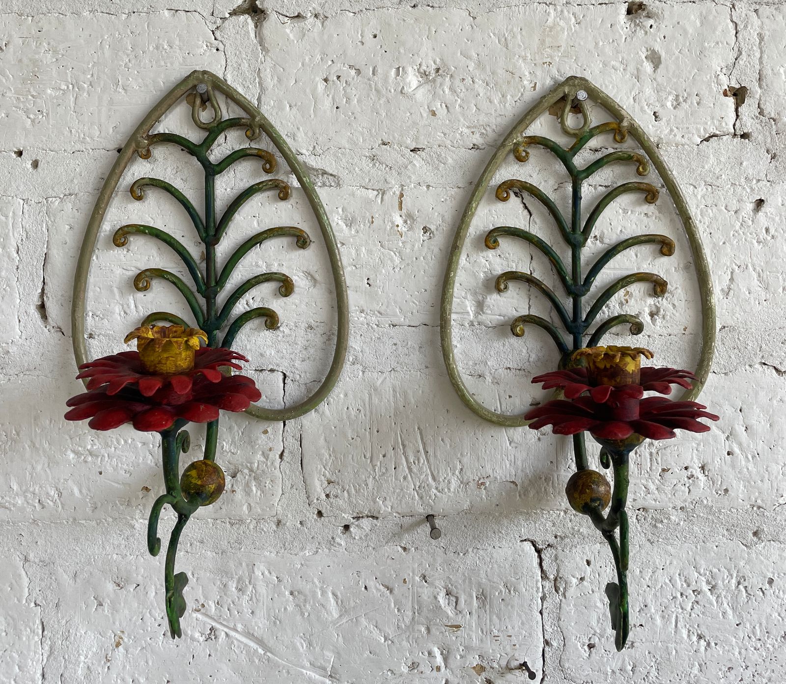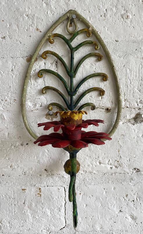 Pareja de candelabros para colgar en la pared producidos artesanalmente en en forja y decorados con pintura desgastada.