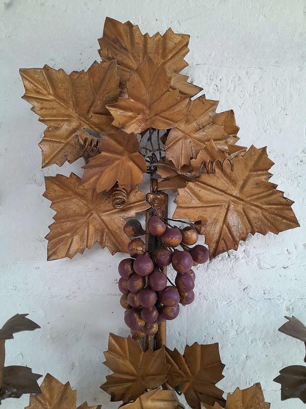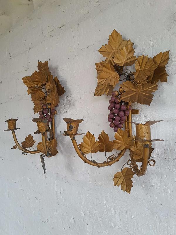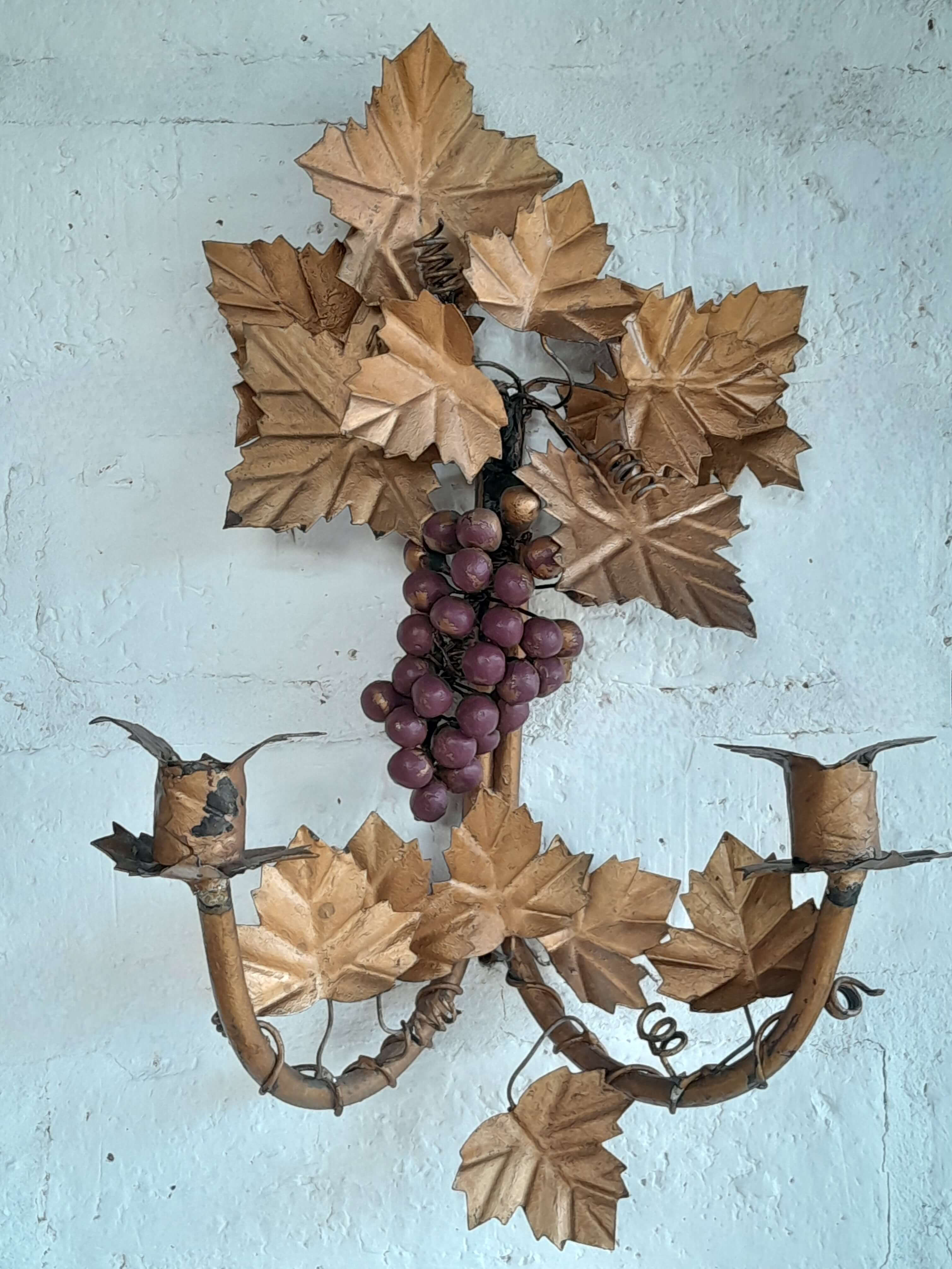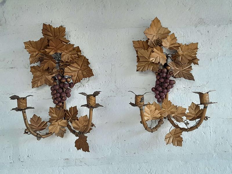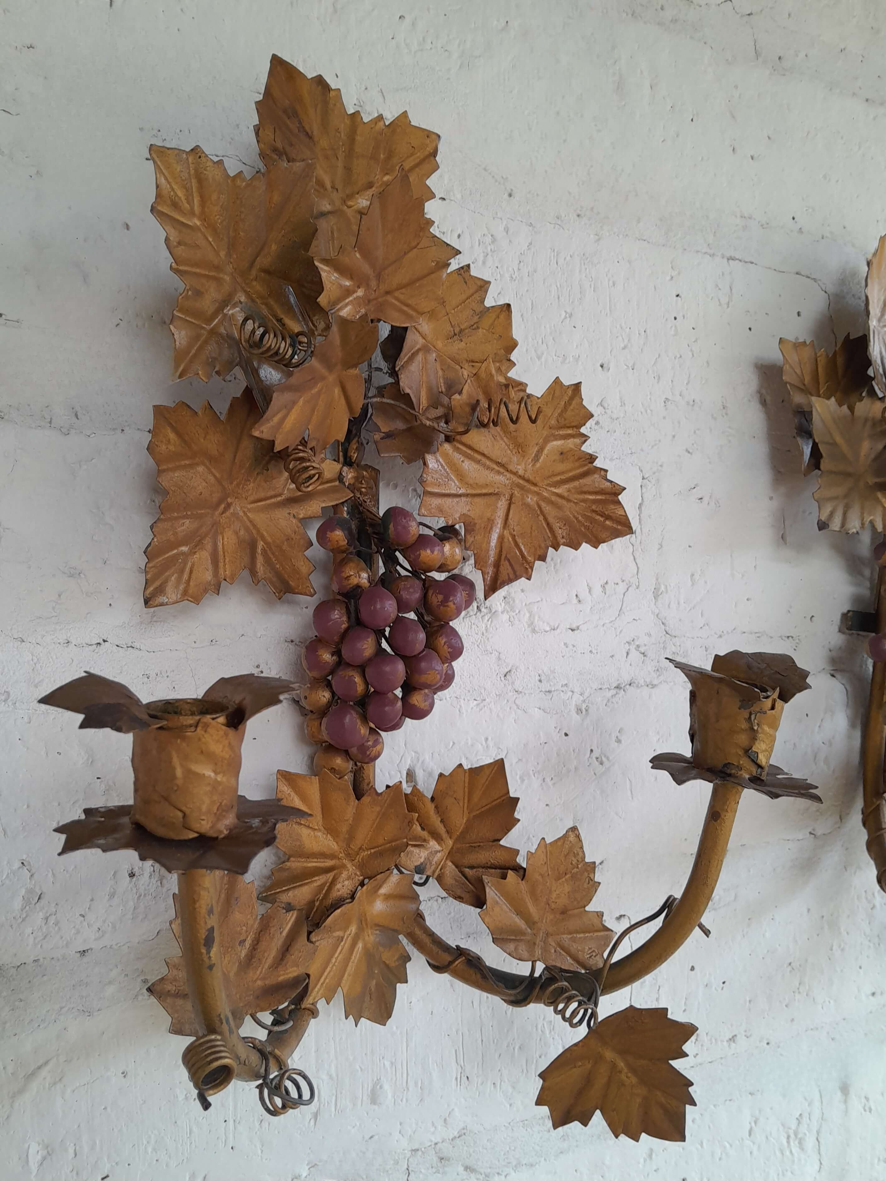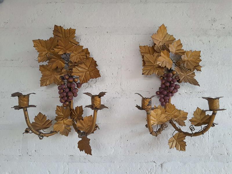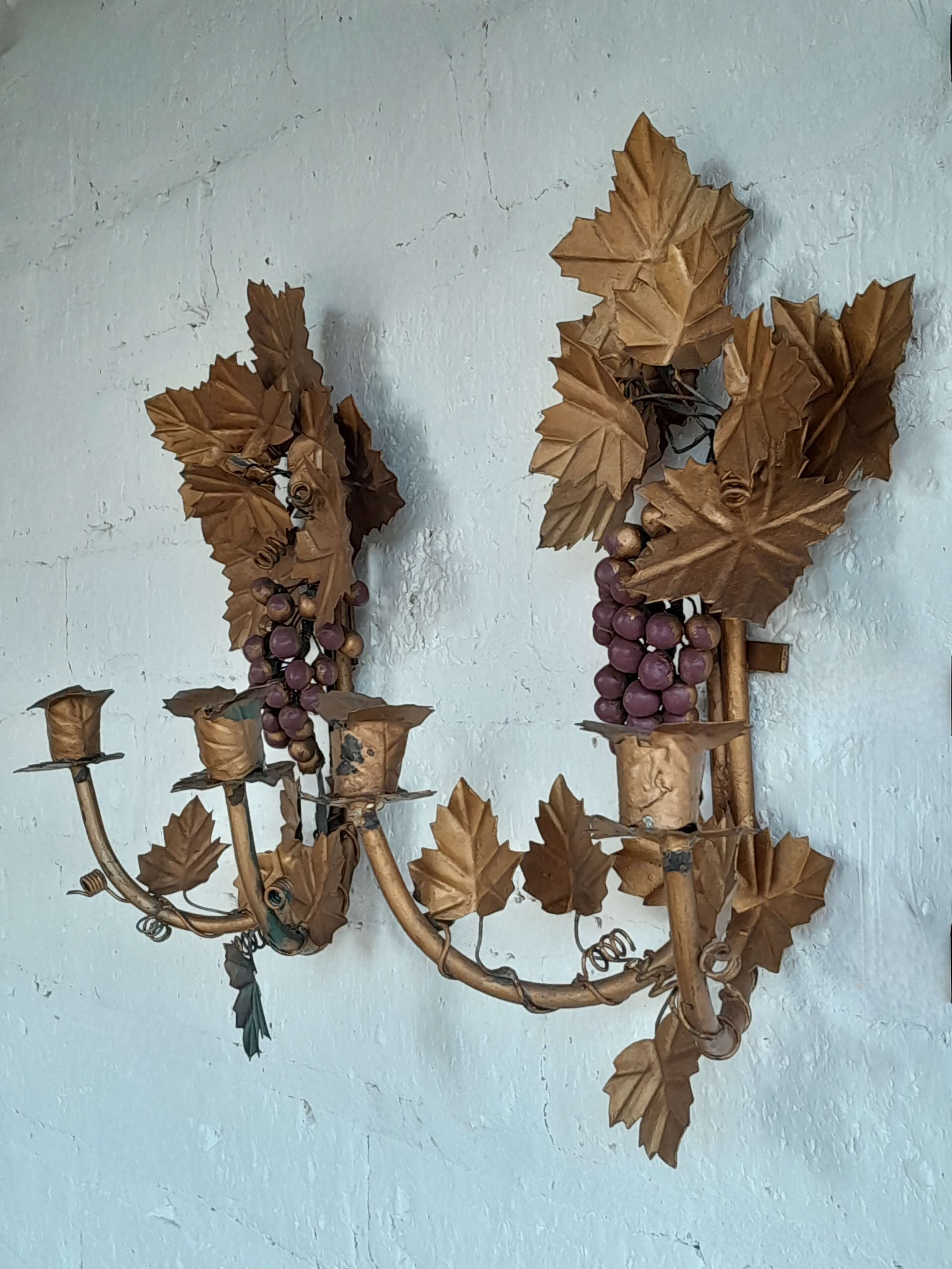 Pareja de candelabros artesanales elaborados en lámina metálica gruesa sobre un soporte de tubo de hierro decorados en pintura dorada desgastada.