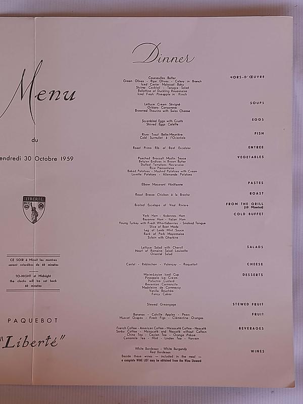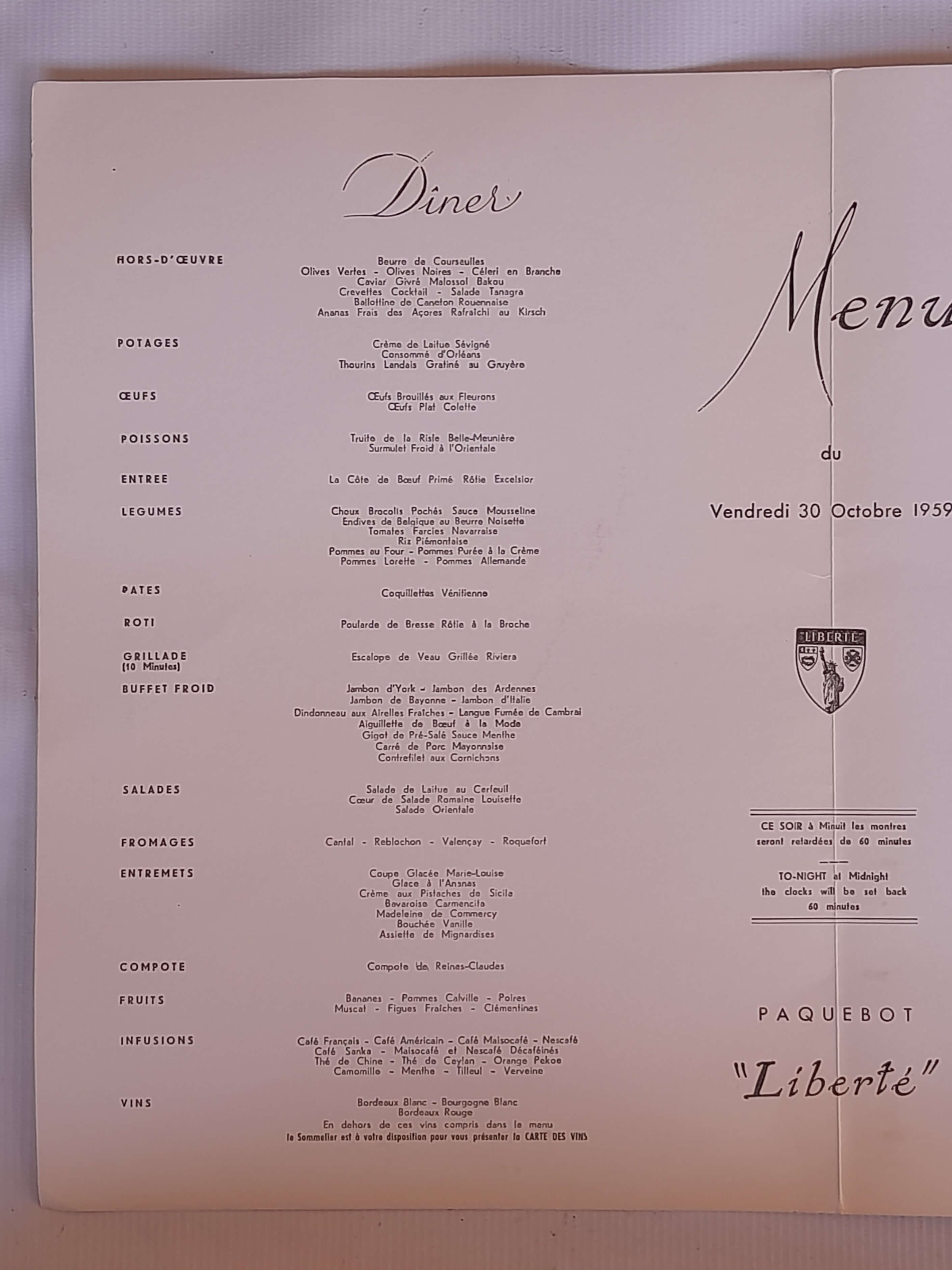Carta del variado menú servido el viernes 30 de octubre de 1959 en el restaurante de los cruceros Franceses Compagnie Générale Transatlantique. En el centro de la carta hay una nota que recuerda que a media noche los relojes se retrasarán 60 minutos. "CE SOIR á minuit les montres seront retardées de 60 minutes".