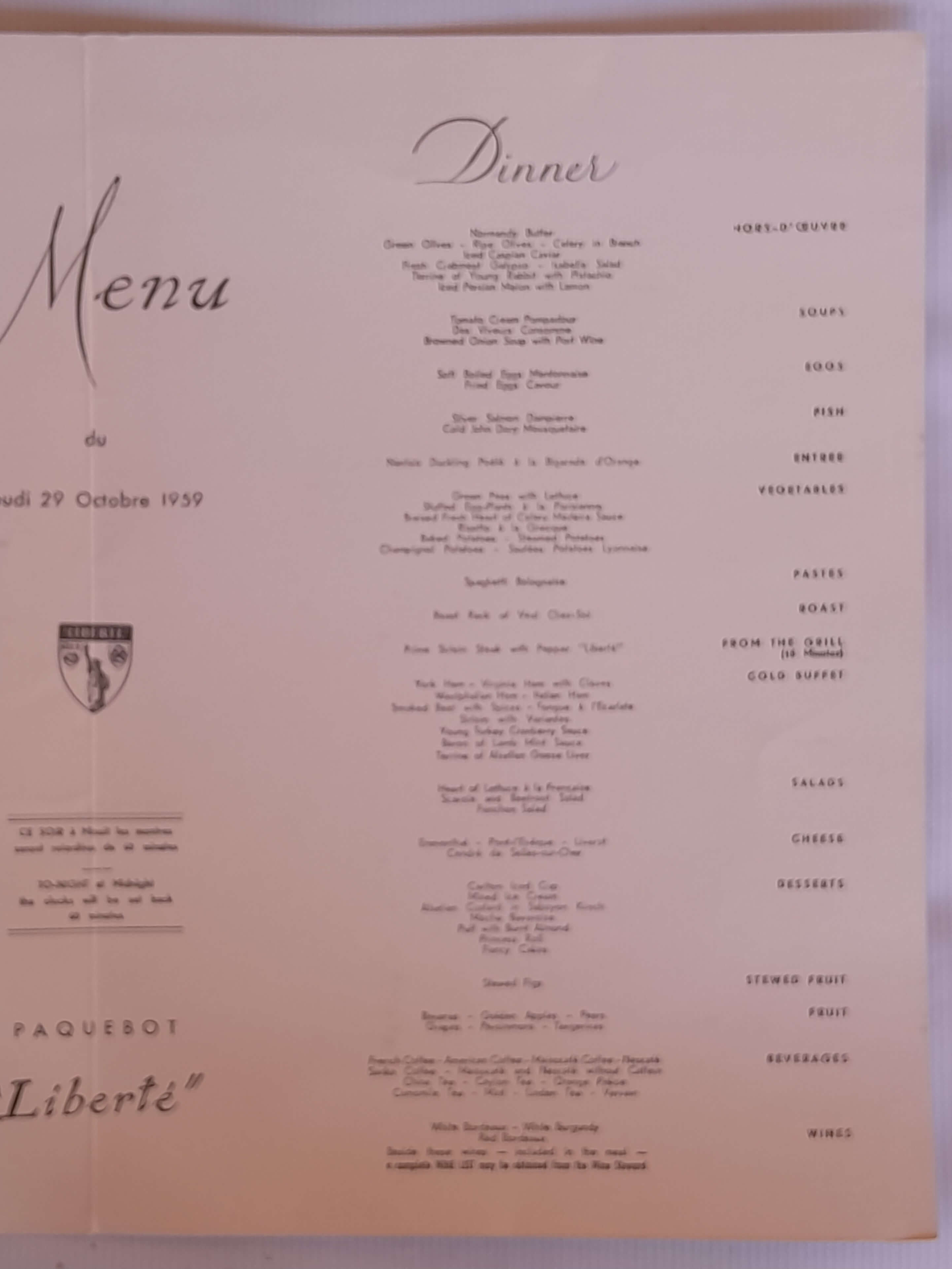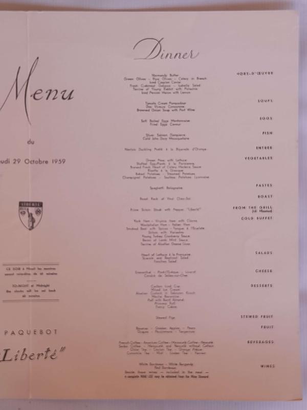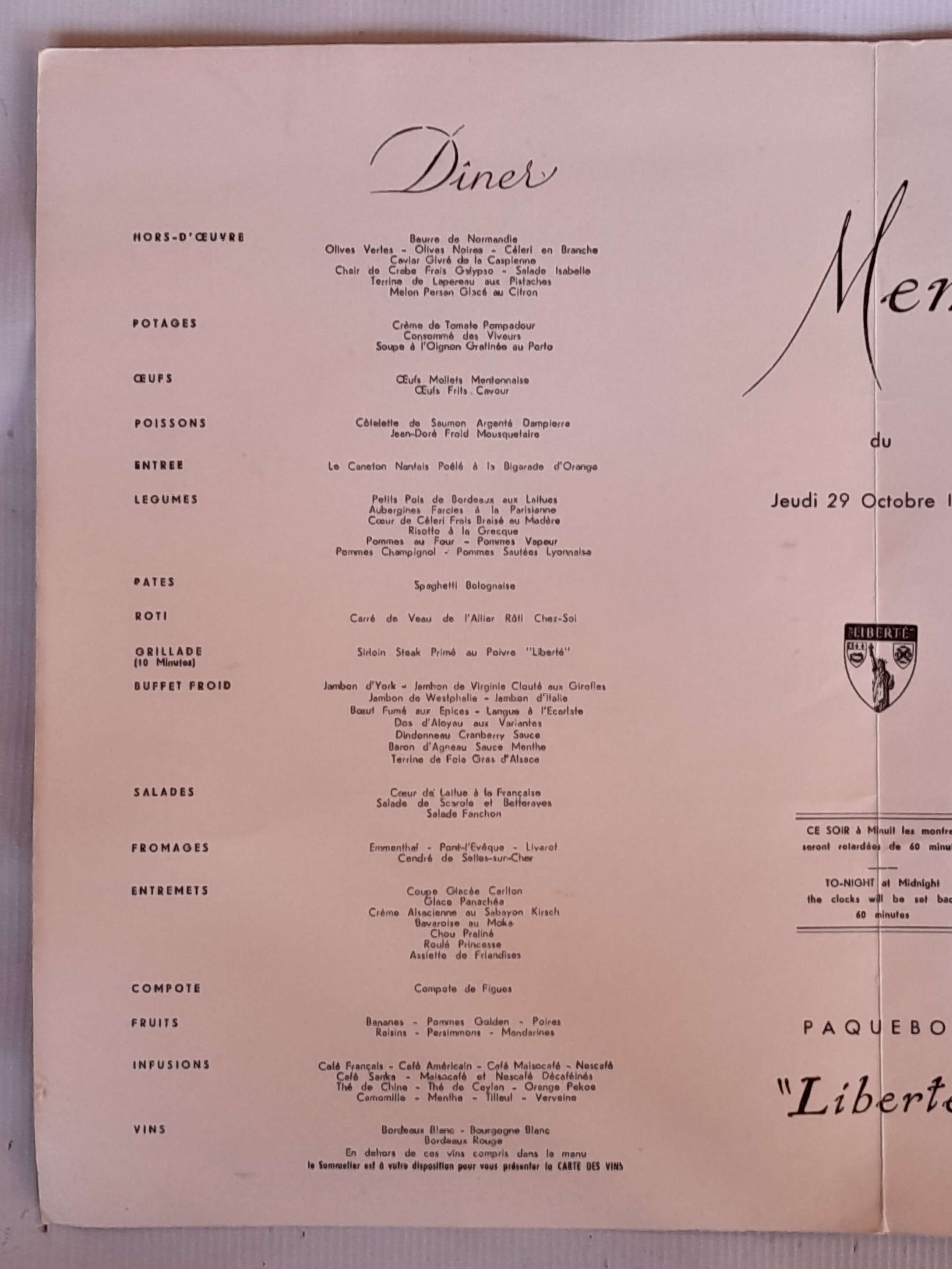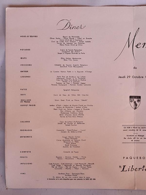 Carta del variado menú servido el 29 de octubre de 1959 en el restaurante de los cruceros Franceses Compagnie Générale Transatlantique. En el centro de la carta hay una nota que recuerda que a media noche los relojes se retrasarán 60 minutos. "CE SOIR á minuit les montres seront retardées de 60 minutes".
