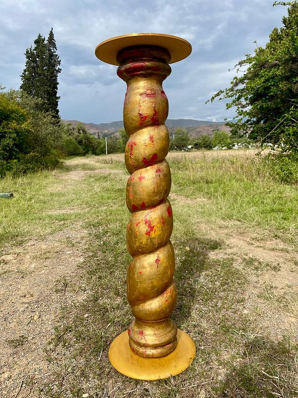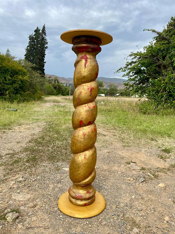 Esta columna perteneció a un altar de capilla católica de una hacienda en Boyacá, decorada en dorado con peladuras que permiten ver un color rojo. Recientemente le gregaron una tabla redonda en la base y otra en el capitel dándole mayor estabilidad.