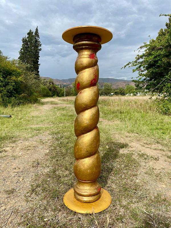 Columna de mediados del S XIX, tallada en madera de forma retorcida, este estilo de columnas se llaman Salomónico, porque imitan a las columnas helicoidales del templo de Salomón, simbolismo utilizado en la decoración de altares de iglesias coloniales en América desde del S XVI hasta el S XIX