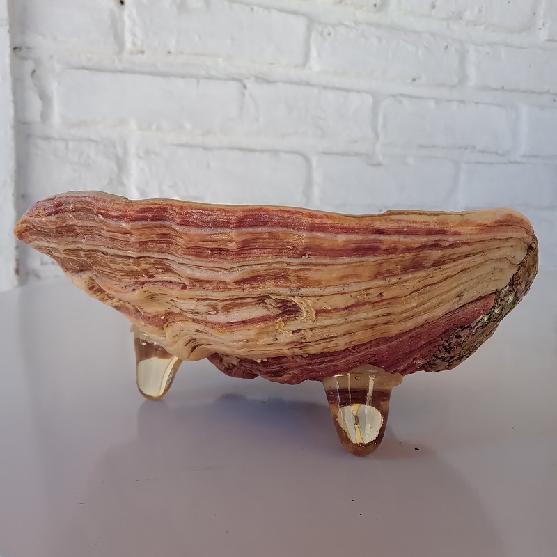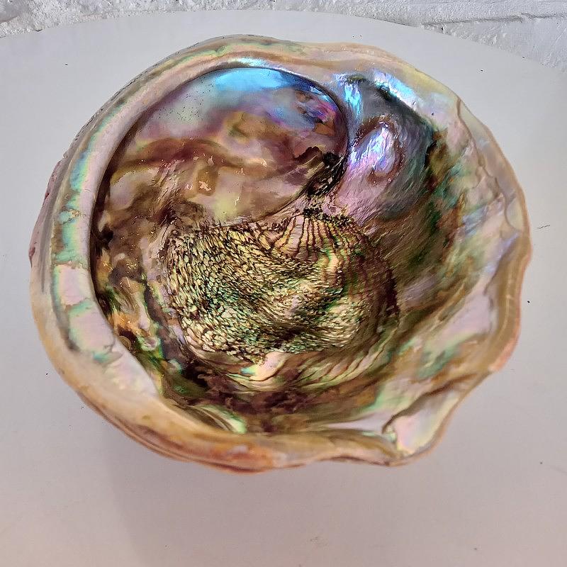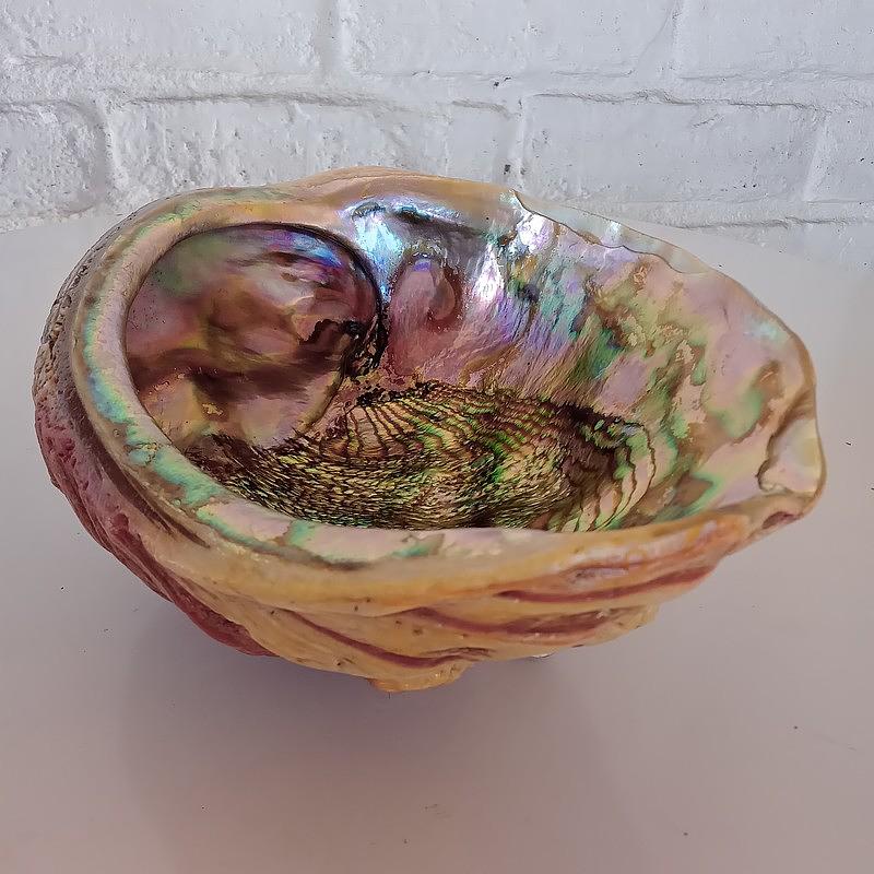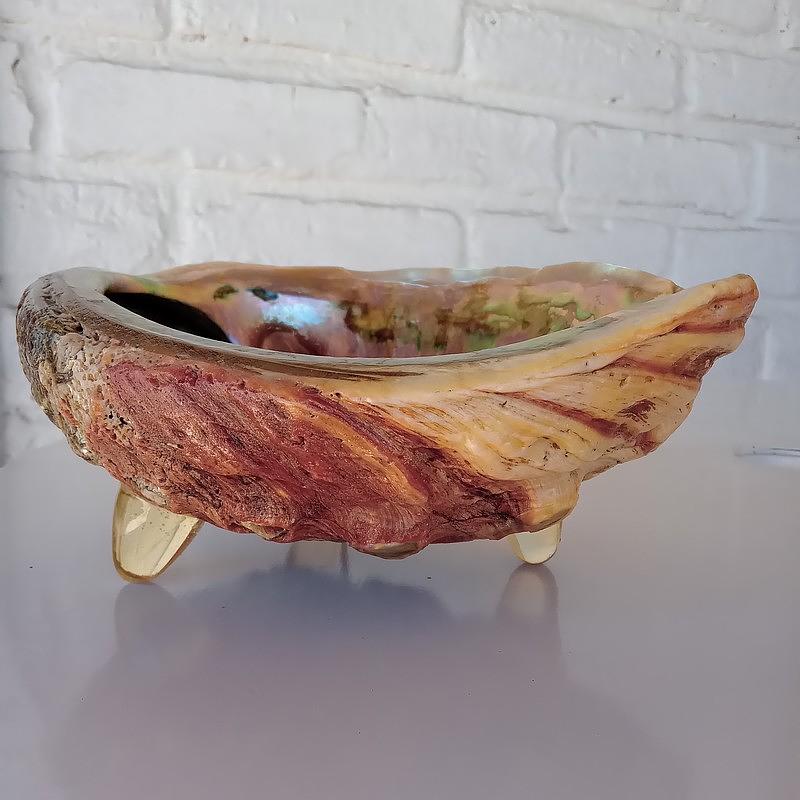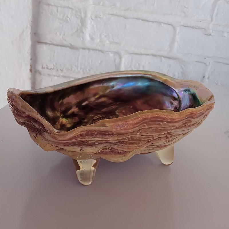 Este cuenco se ha elaborado con una concha centenaria de abulón a la que se le agregaron 3 patas de lucita. La superficie externa de la concha permite apreciar el paso de los años durante la vida del molusco en el mar, en la parte interna se aprecian las diferentes tonalidades brillantes del nácar. Puede utilizarse como joyero o pieza decorativa.