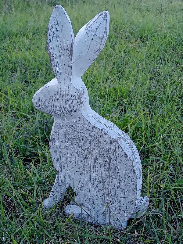 Figura de conejo en resina con apariencia de madera tallada rústica decorado con pintura blanca desgastada.