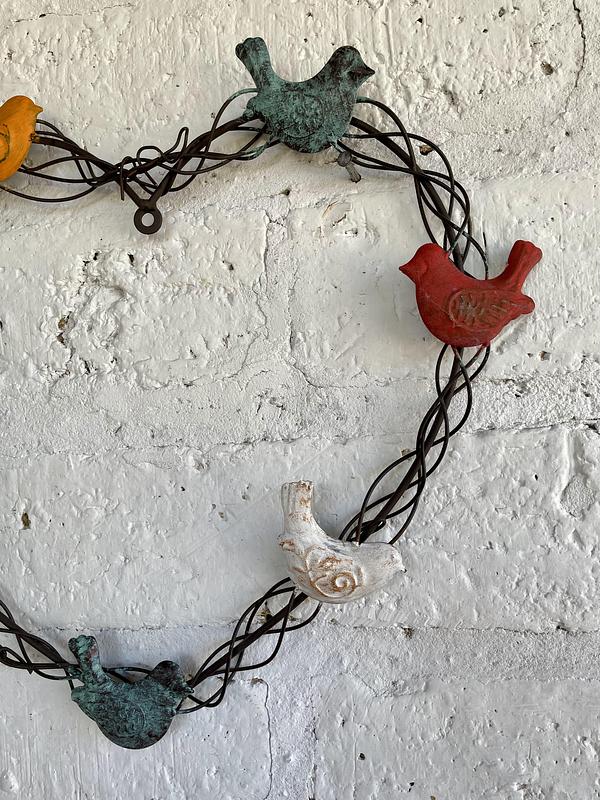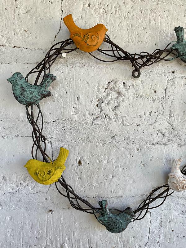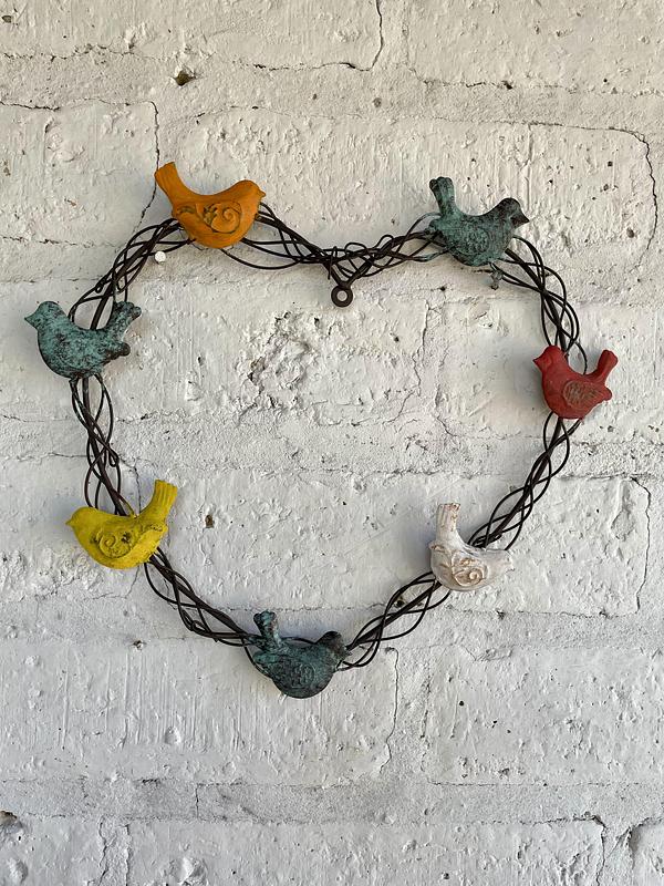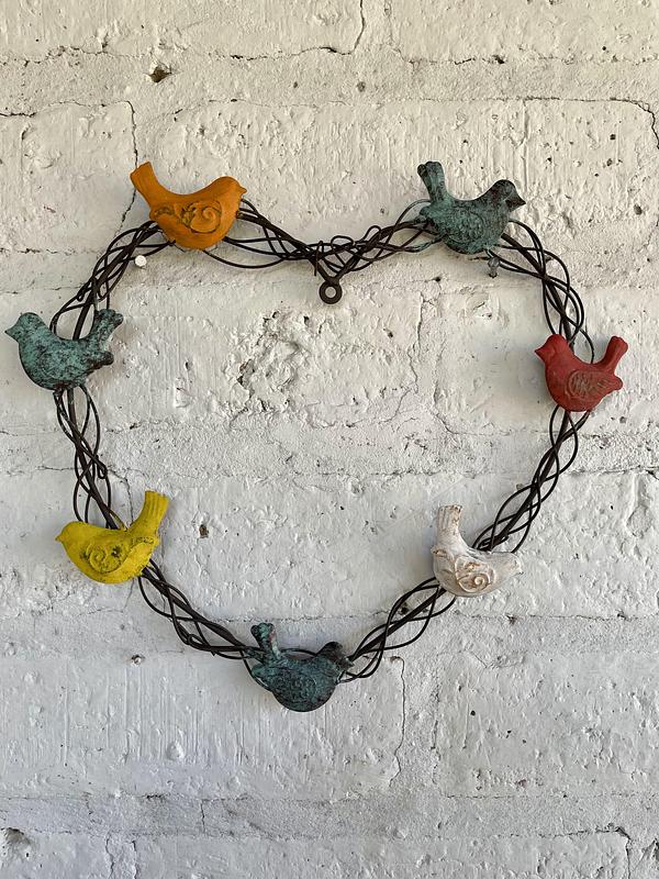 Corazón en metal semejando un bejuco retorcido con 7 pájaros de diferentes colores