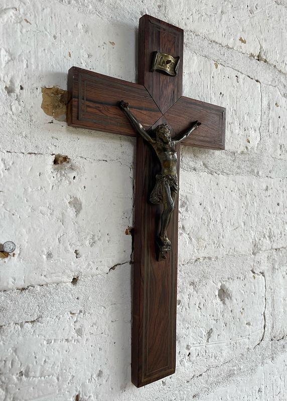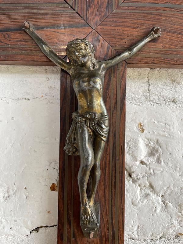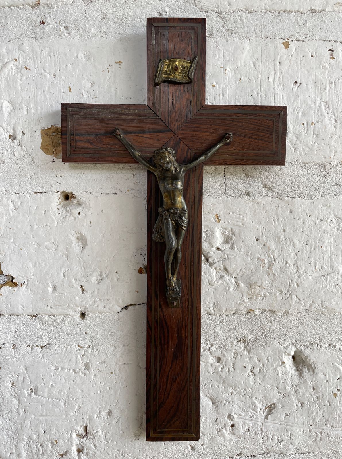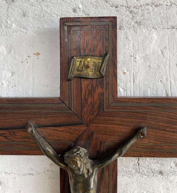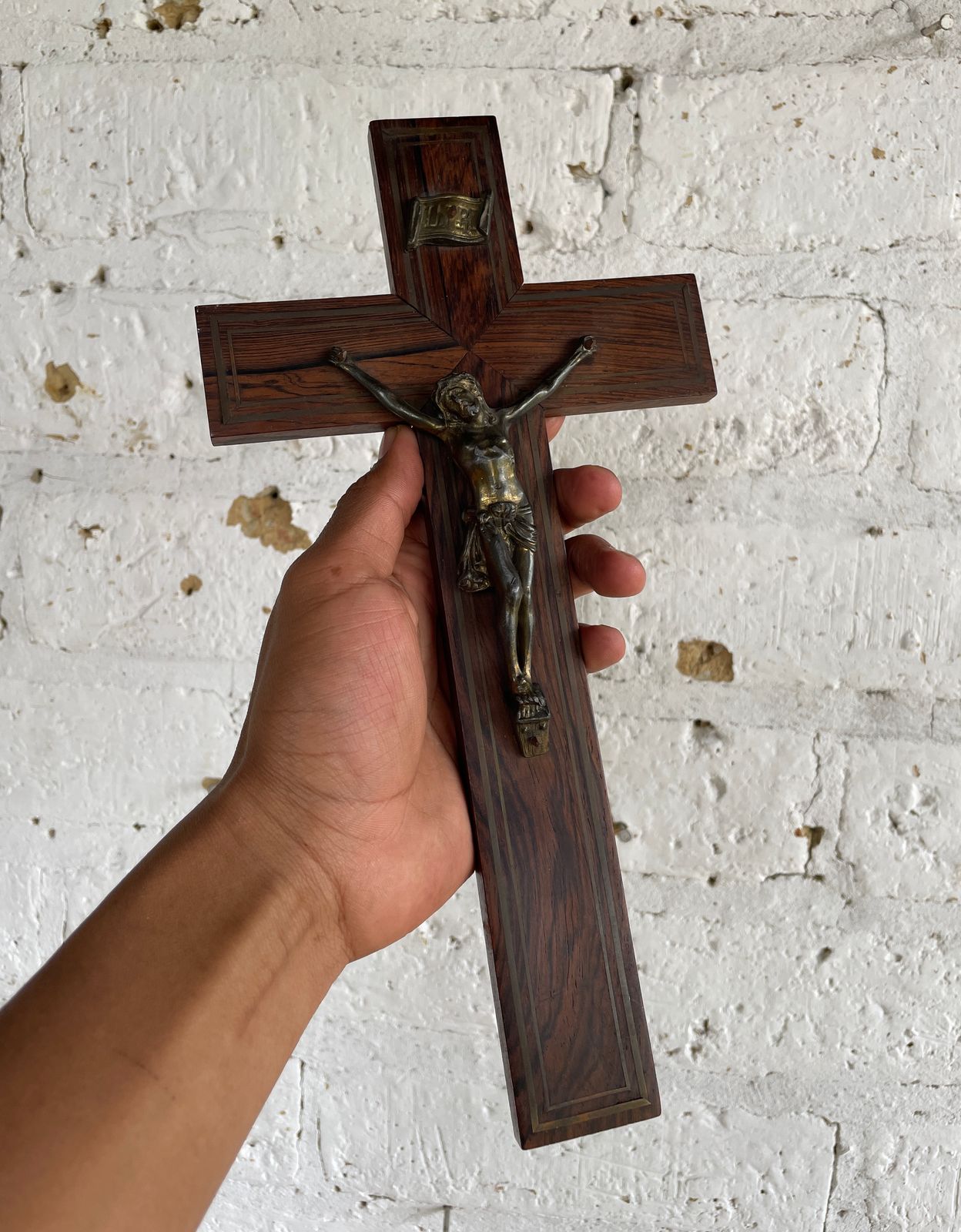 Antiguo crucifijo en bronce y cruz de madera con incrustaciones de bronce.