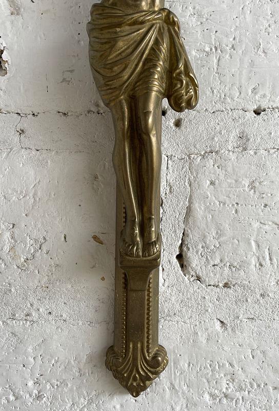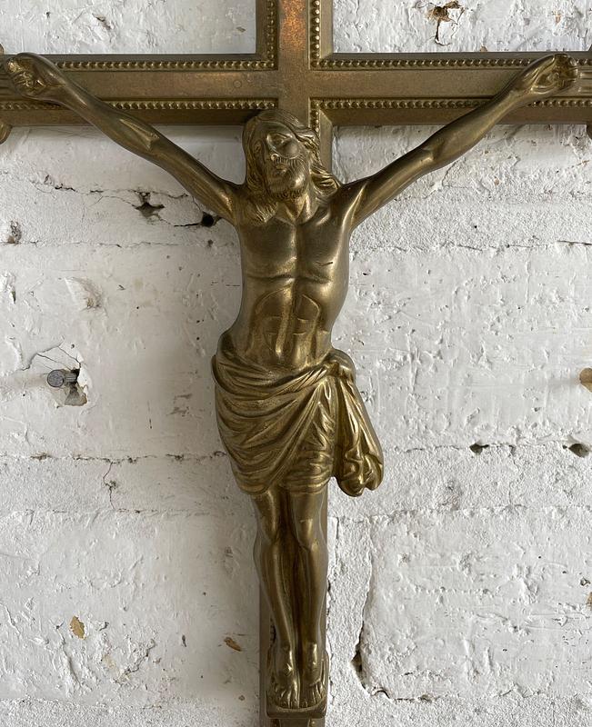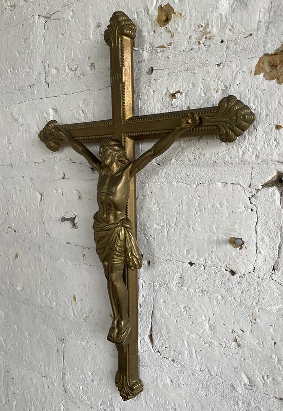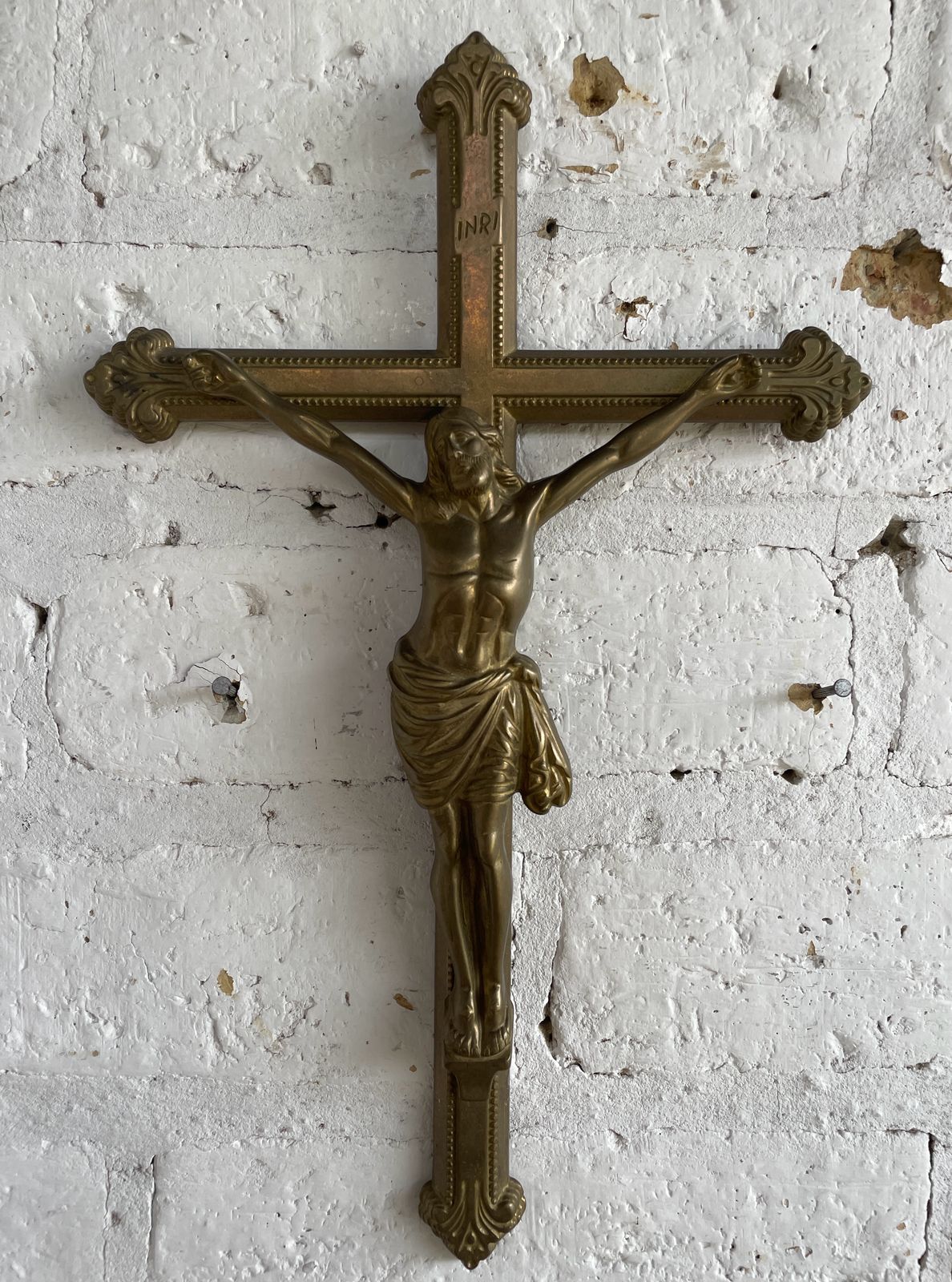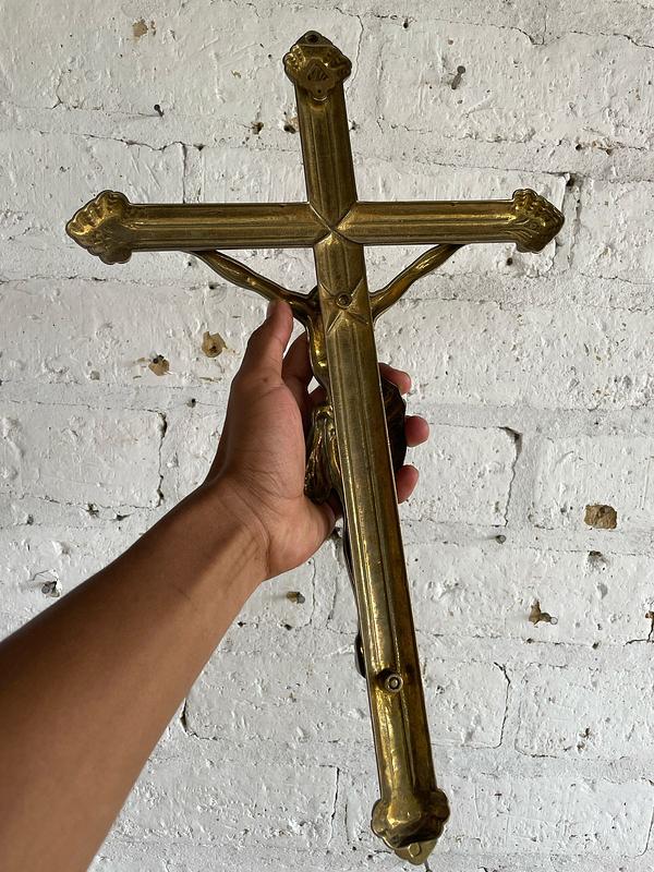 Crucifijo español de principio del S XX en lámina gruesa de brince fundido. Representa a Cristo vivo en la cruz, tiene la cabeza levantada y dirige la mirada al cielo.