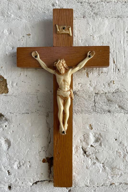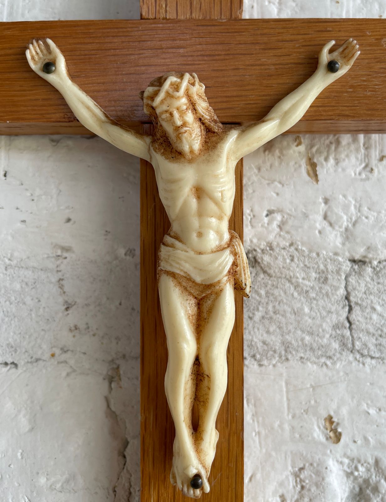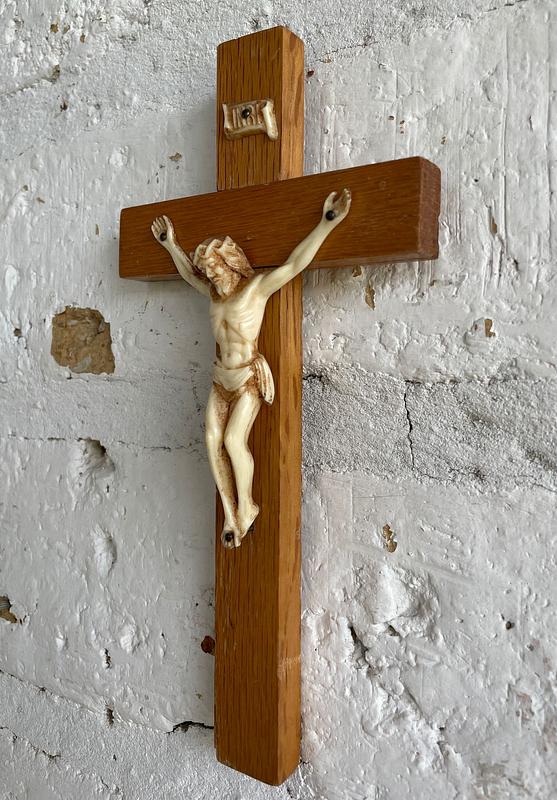 Crucifijo vintage, la cruz es de madera y el cristo de resina. Tiene un brazo partido y pegado, esta novedad es poco notoria, por este motivo tiene un descuento del 25% .