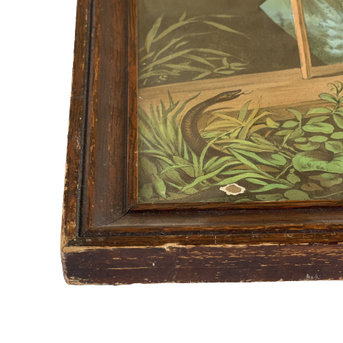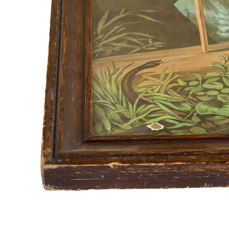 La lámina presenta rasgaduras y desgastes, el marco se encuentra en buen estado.