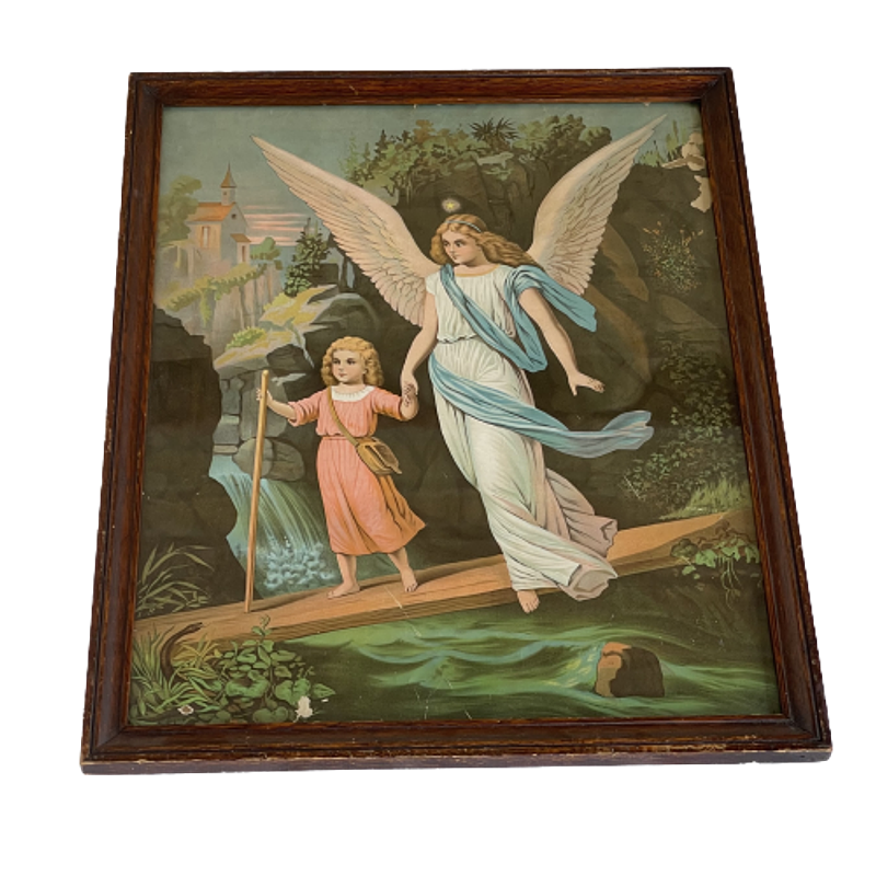 Lámina del Angel de la Guarda enmarcada con moldura de madera y vidrio originales de inicios del S XX. Por los colores de la imagen y calidad del papel se cree que la lámina es francesa. En los primeros años del S XX era costumbre tener el cuadro del Angel de la Guarda en las habitaciones de los niños.