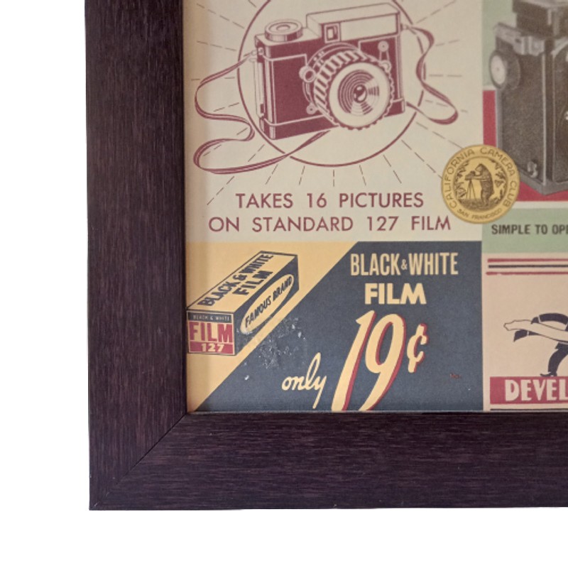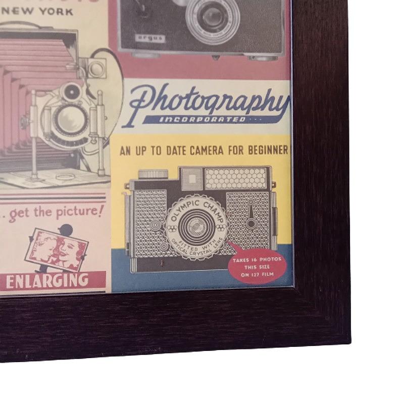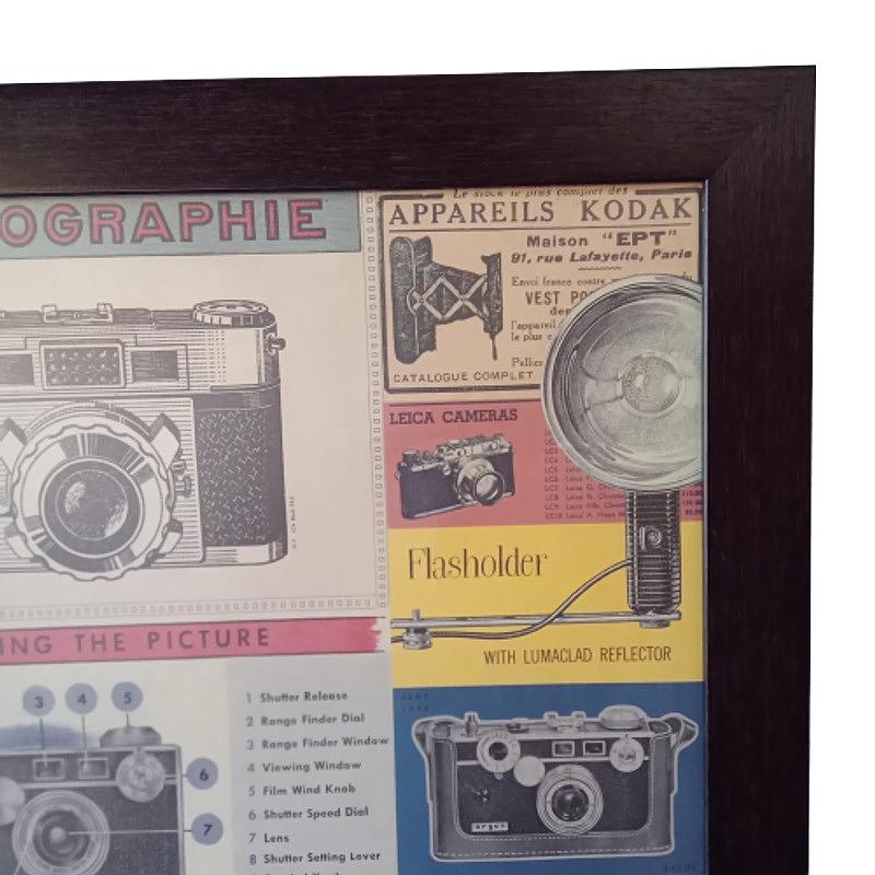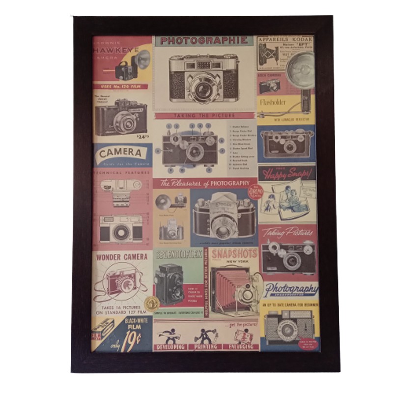 Cuadro de una lámina con imágenes de cámaras fotográficas Impresa en Korea sobre papel italiano producido por la exclusiva colección de papeles de la marca Cavallini Papers & Co, San Francisco USA. Tiene apariencia de póster antiguo con una mezcla de imágenes relacionadas con la fotografía y cámaras de fotos vintage. Enmarcado con vidrio anti reflectivo y moldura de poliuretano.