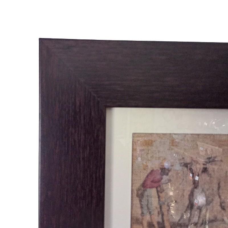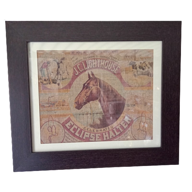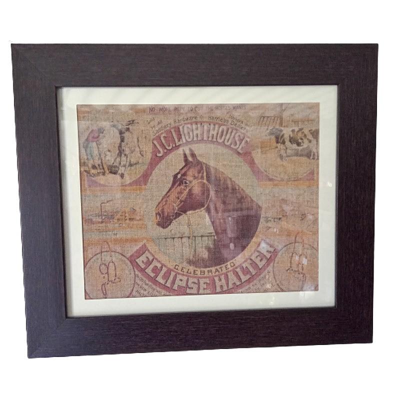 Moldura italiana en poliuretano imitación madera con vidrio y paspartú, la figura del caballo y textos están impresos sobre una fina lona hecha en USA.