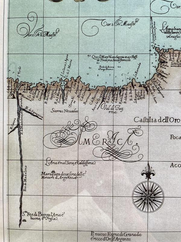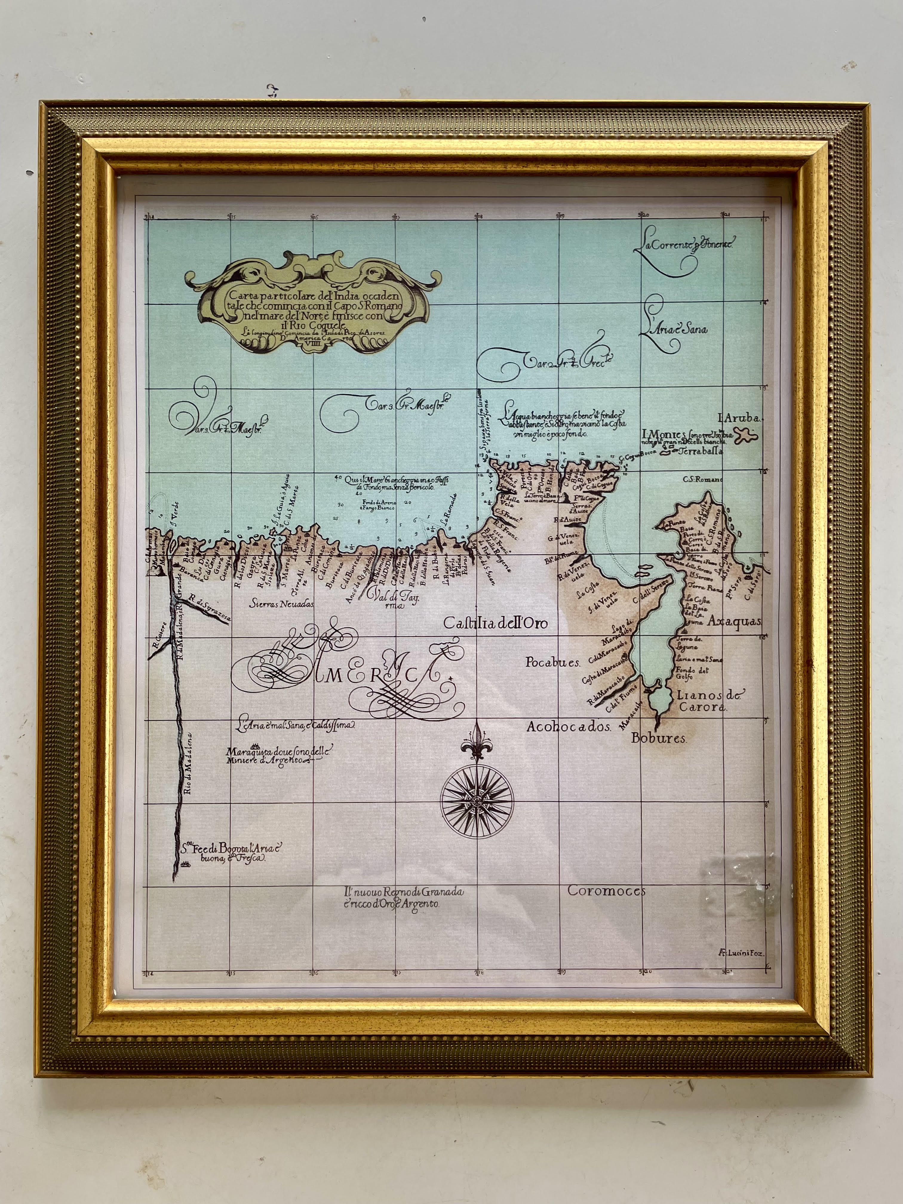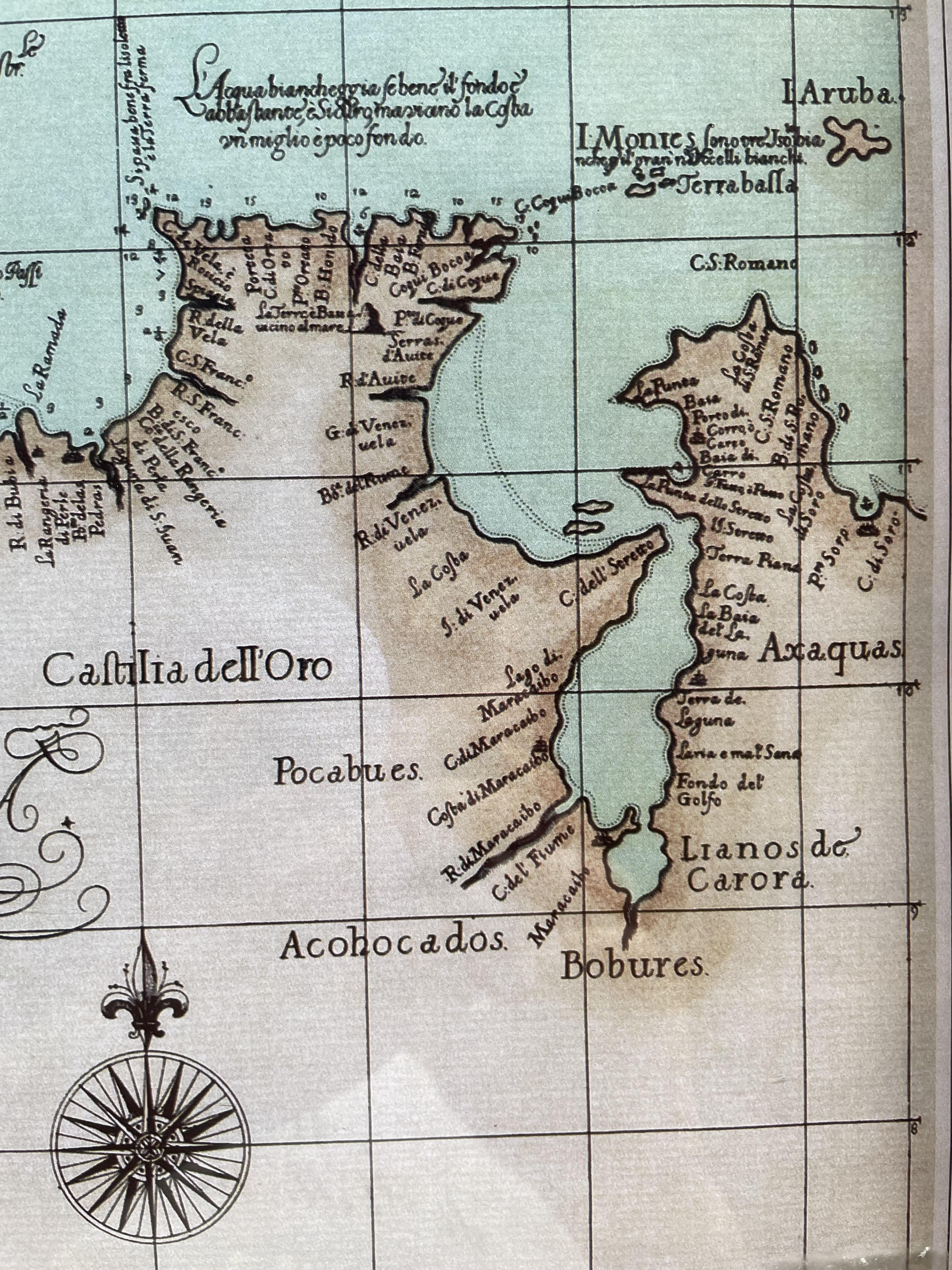 Este mapa hacía parte de un Atlas de Colombia de 1970, reproduce un antiguo mapa de la Guajira colombiana, el original se encuentra en la biblioteca pública de Boston. Carta particular de la India Occidental che comincia con il Capo S. Romano nel' mare del' norte è finisce con il' Rio Coquele. Grabado en 1605 por Lucini Antonio Francisco escrito en Italiano.
