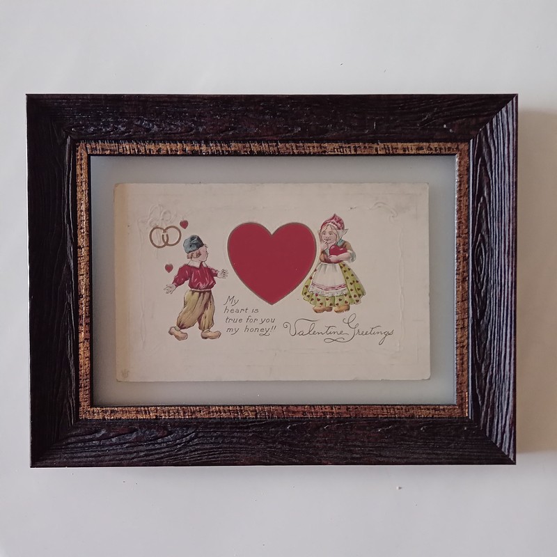 Esta curiosa postal la envía la abuela a Vern Carpenter el 12 de febrero de 1915 en Indiana USA, el costo del envío tan solo fue de 1 centavo de dólar. La postal se encuentra en buen estado. Enmarcada con moldura retro de poliuretano retro y doble vidrio que permite ser observada por ambas caras.