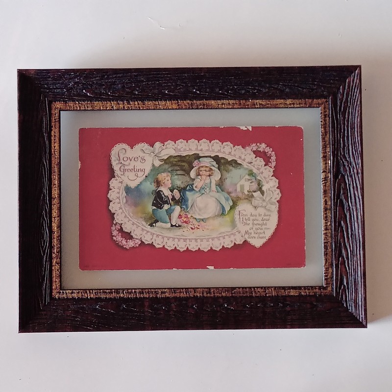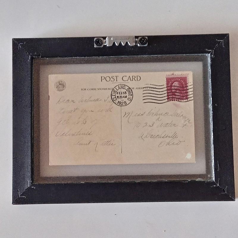 Postal escrita la mañana antes del día de San Valentín de 1928 en Clevelan Ohio. Conserva la estampilla y el sello postal con fecha febrero 13. Enmarcada con moldura retro de poliuretano y doble vidrio que permite ser observada por ambas caras. El porte costó 2 centavos de dólar.