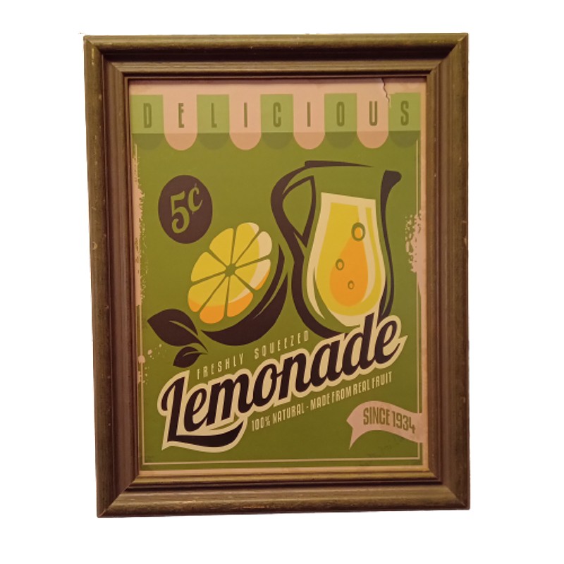 Afiche retero enmarcado con moldura de madera y vidrio antireflectivo.