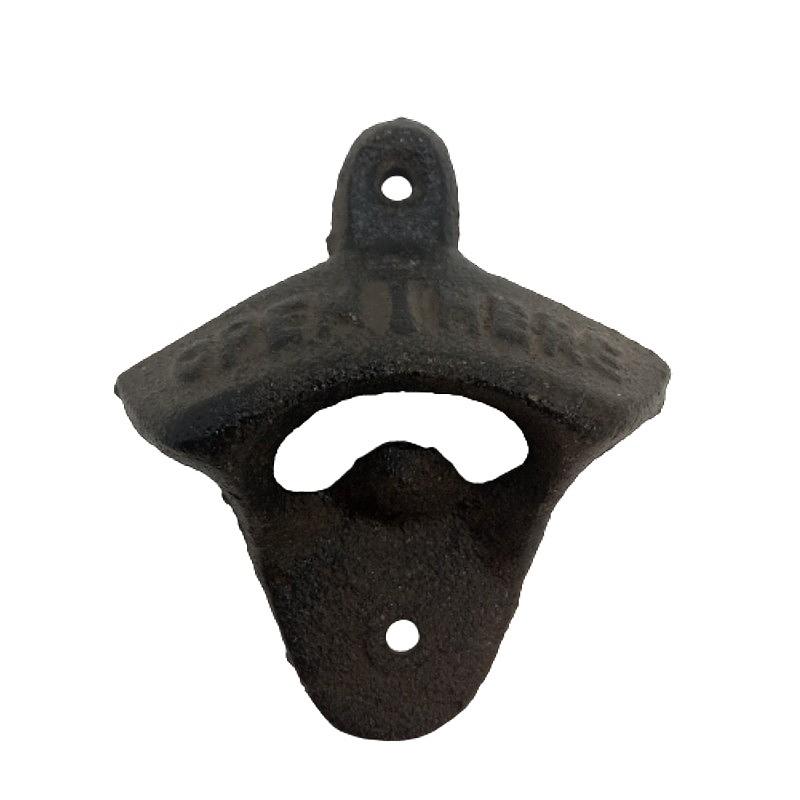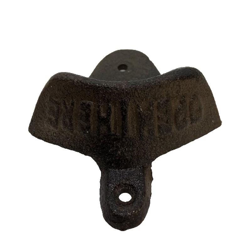 En hierro fundido, imitando los que se usaban en las tiendas para destapar gaseosas y cervezas.