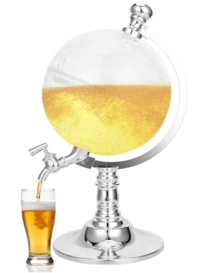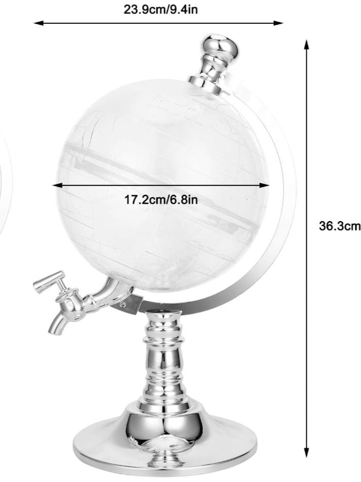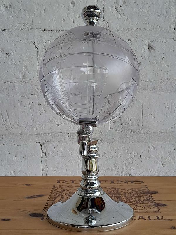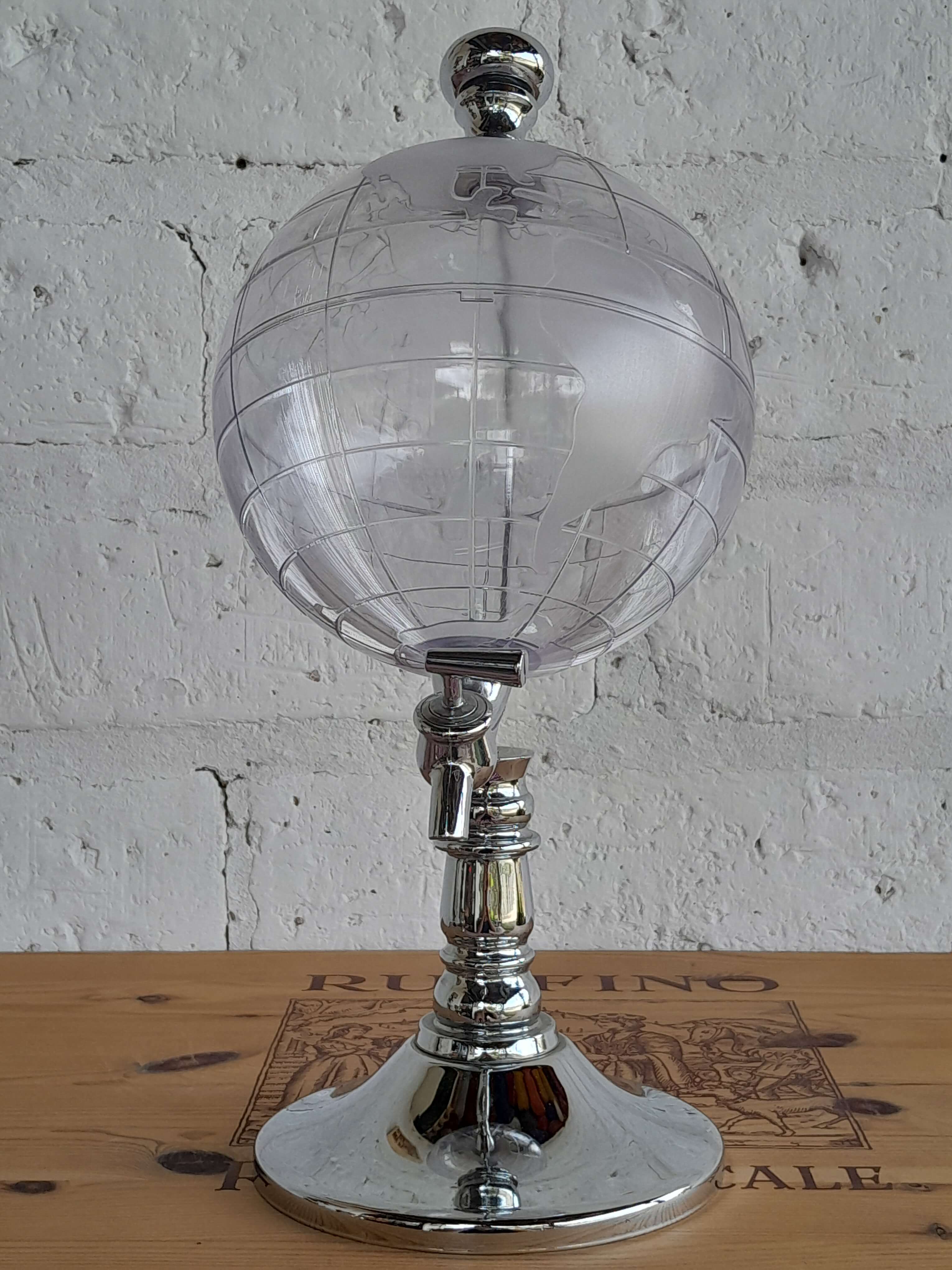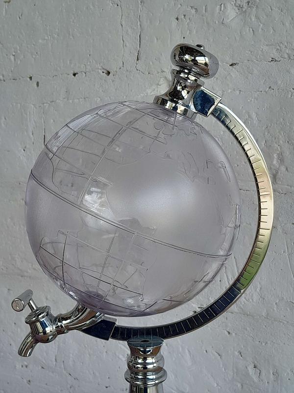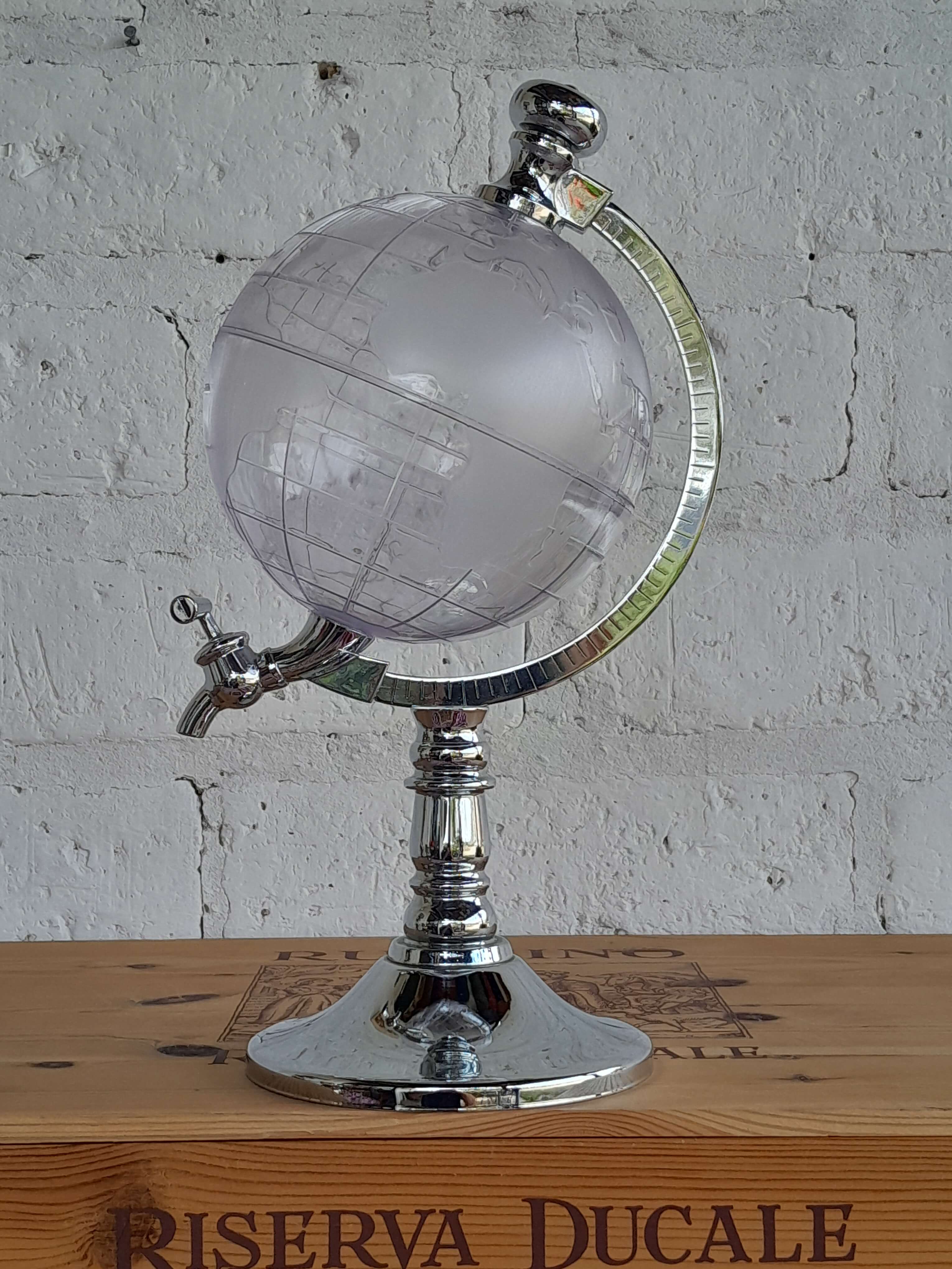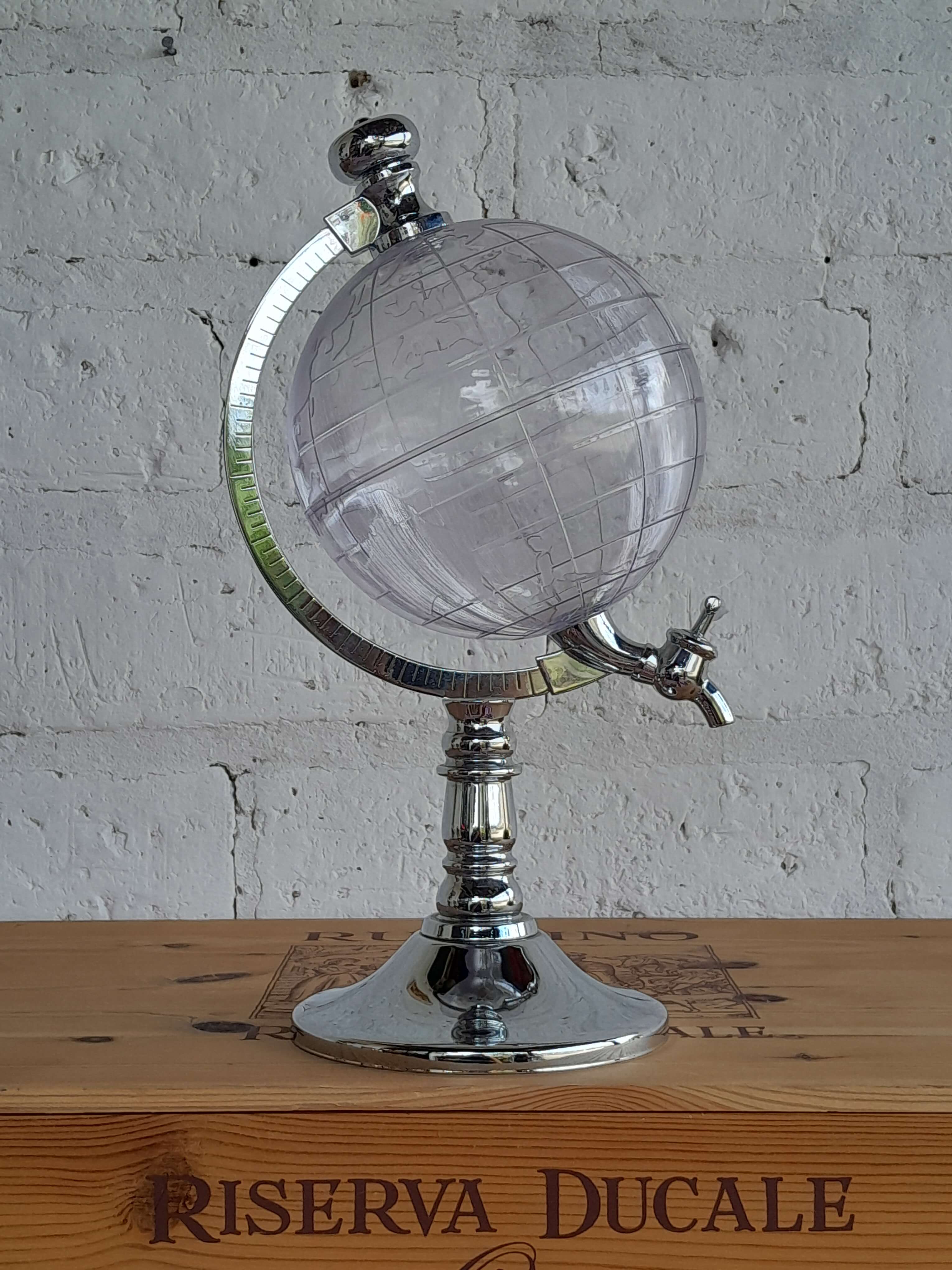 Dispensador de bebidas con forma de mapamundi transparente y base plateada. Decorativo y funcional.