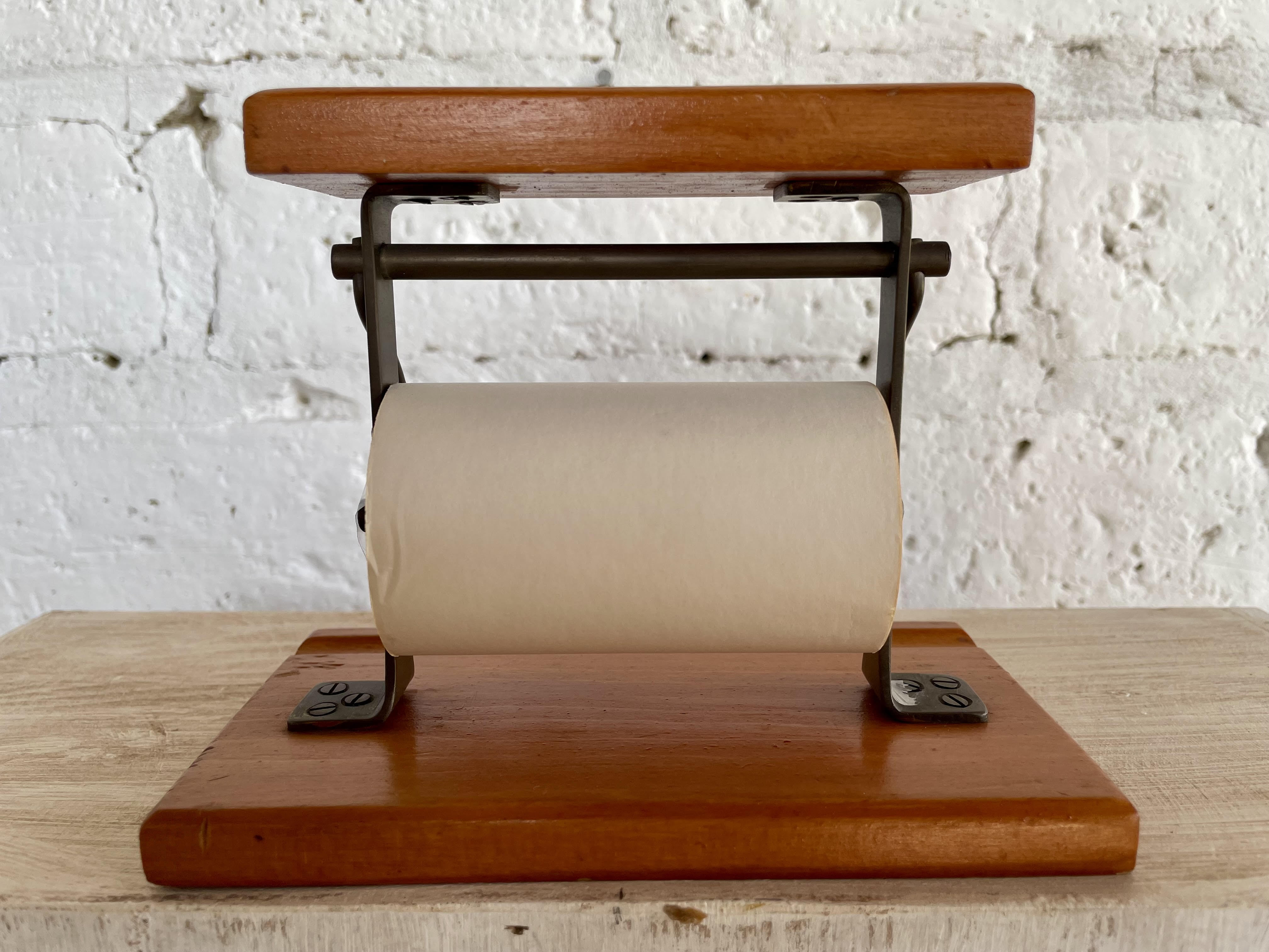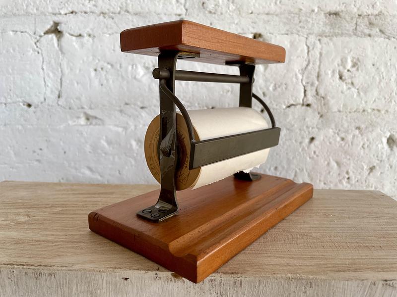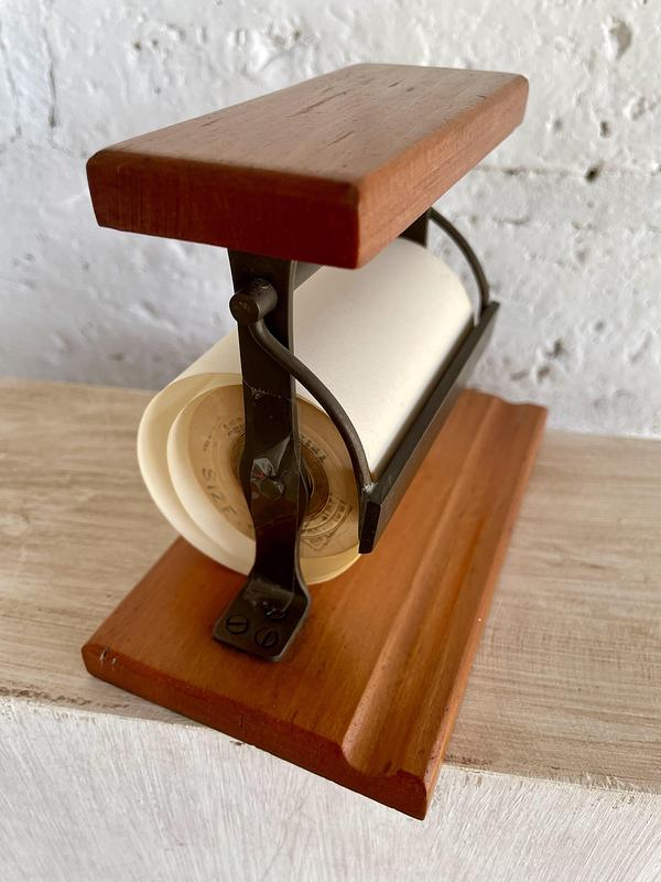 Pequeño dispensador de papel de sobreponer en escritorio, modelo a escala tomado de los antiguos dispensadores de papel de las tiendas. Base y cubierta de madera la estructura con cuchilla metálica.