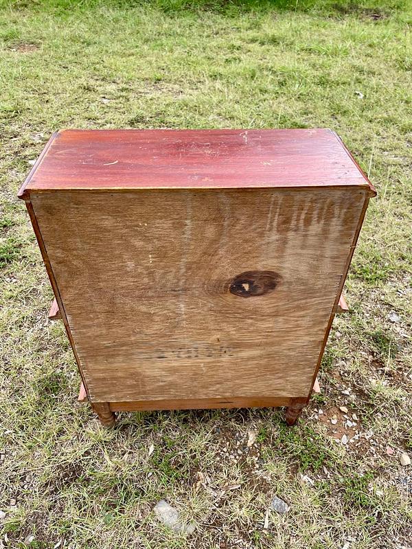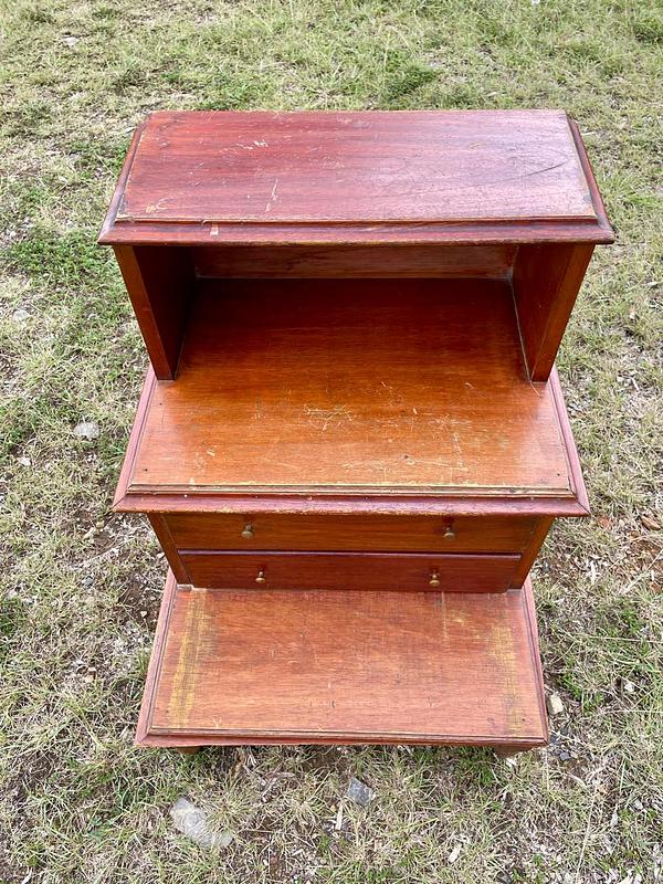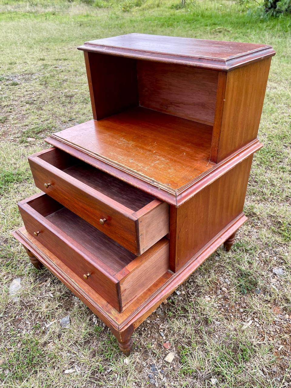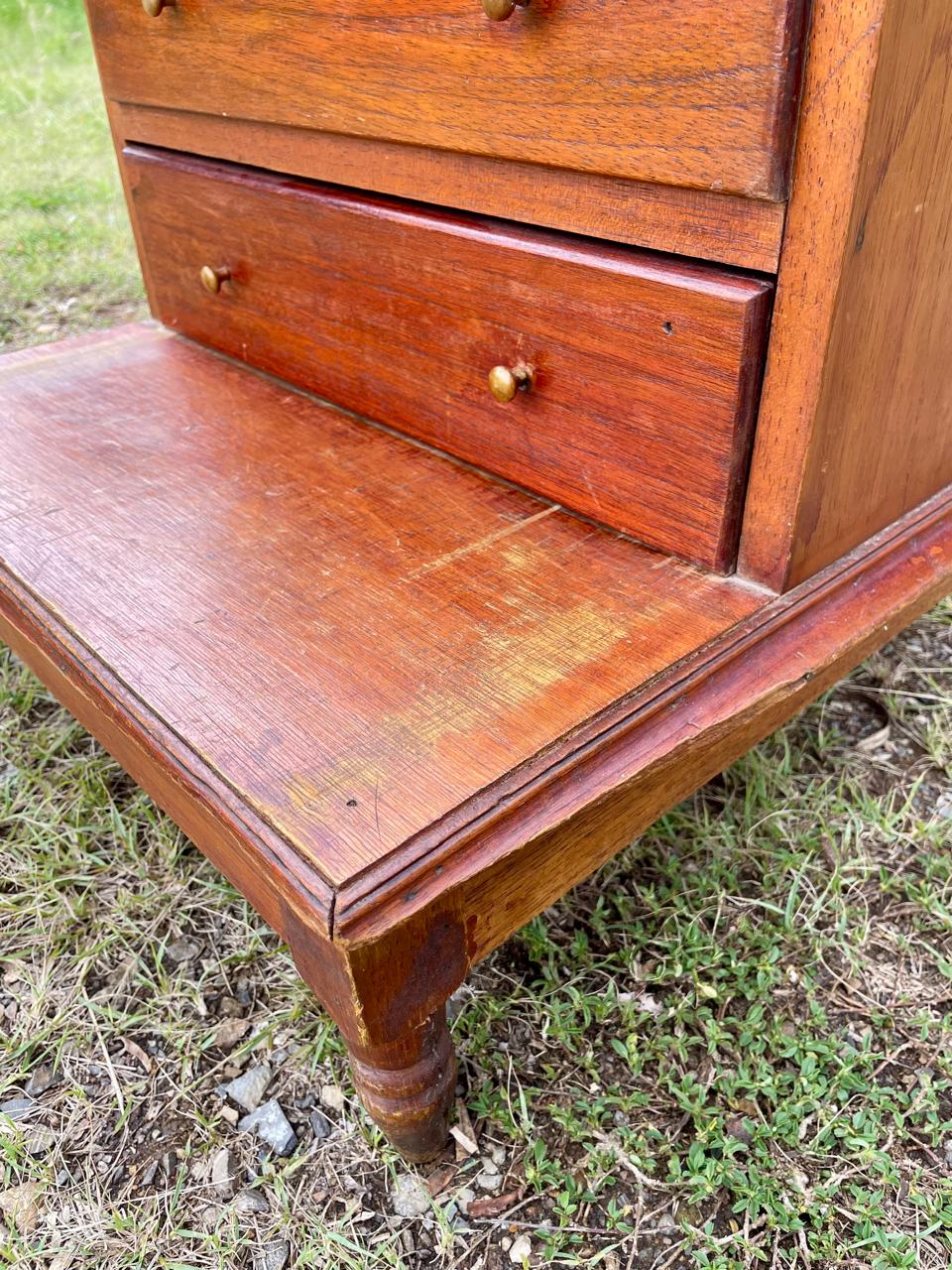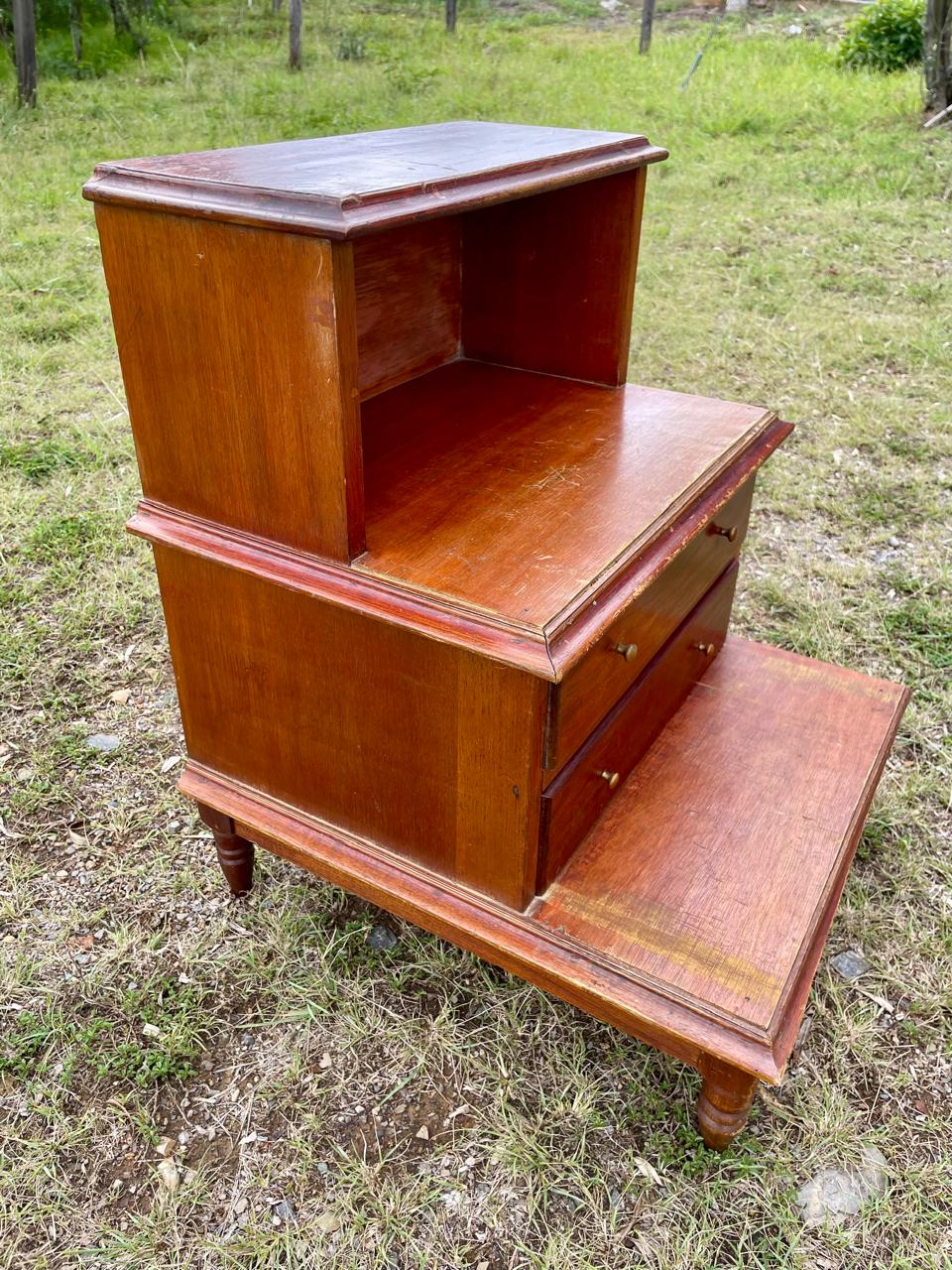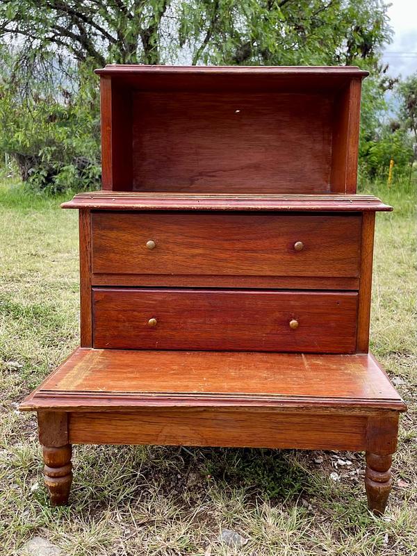 Escalera de biblioteca clásica de 3 peldaños con dos cajones en el centro. perillas de bronce y patas torneadas, elaborada en Colombia en la década de los setenta en madera maciza y fondo de triplex. Tiene desgastes en la pintura, le falta un pedazo de moldura en una de las esquinas.