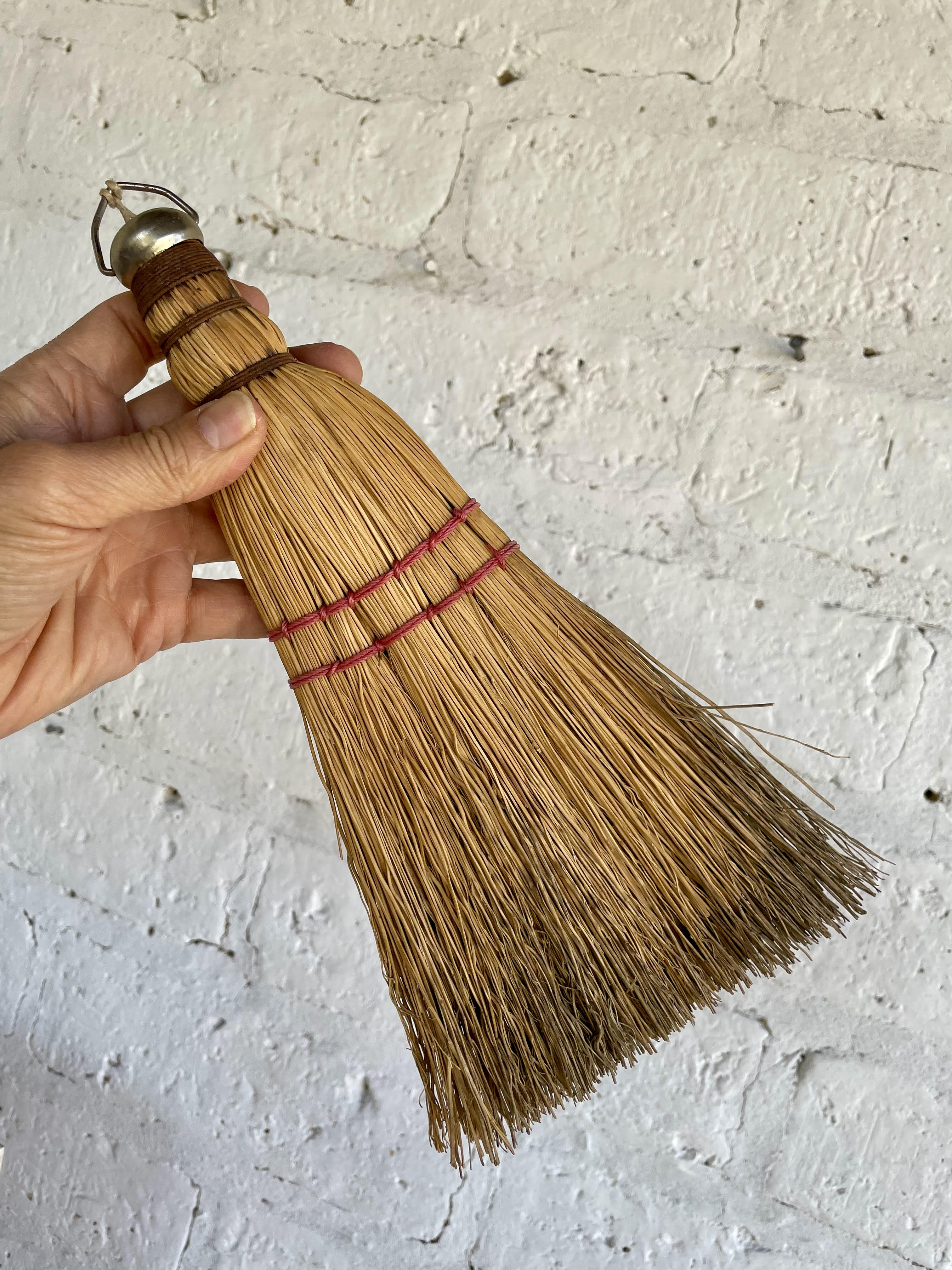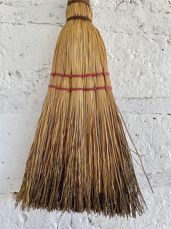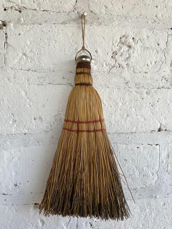Escoba artesanal elaborada por la comunidad amish de Pensilvania U.S.A. La escoba ha sido utilizada y presenta desgastes, la paja presenta color negro en una cara. Se utilza como accesorio para la chimenea.