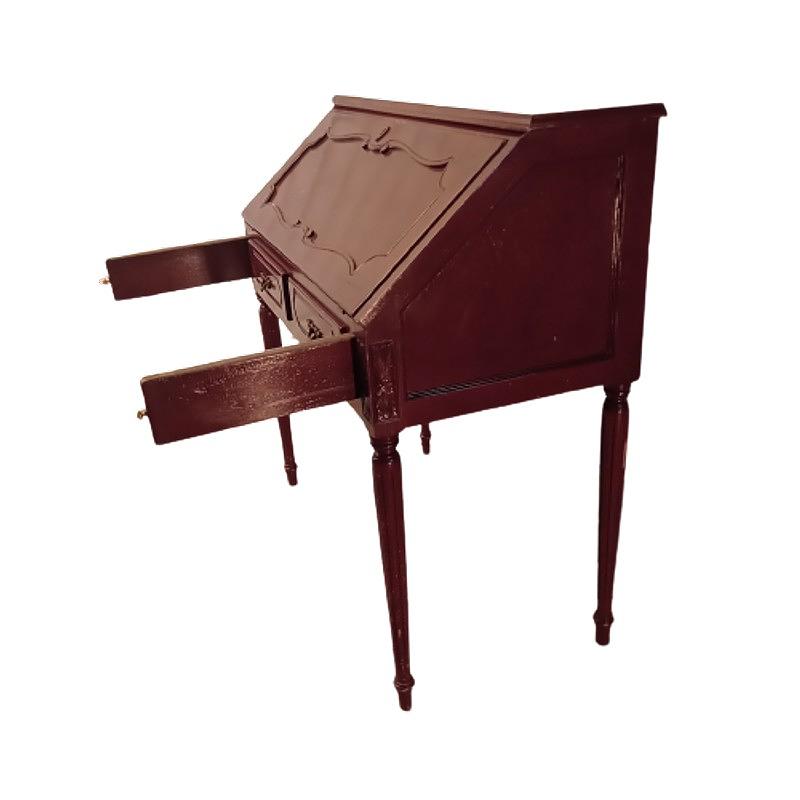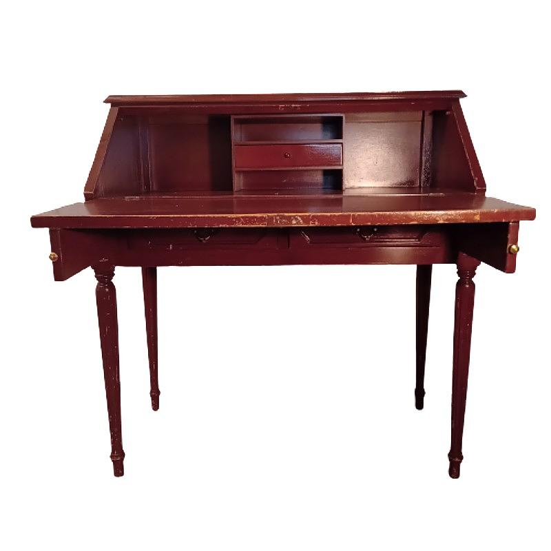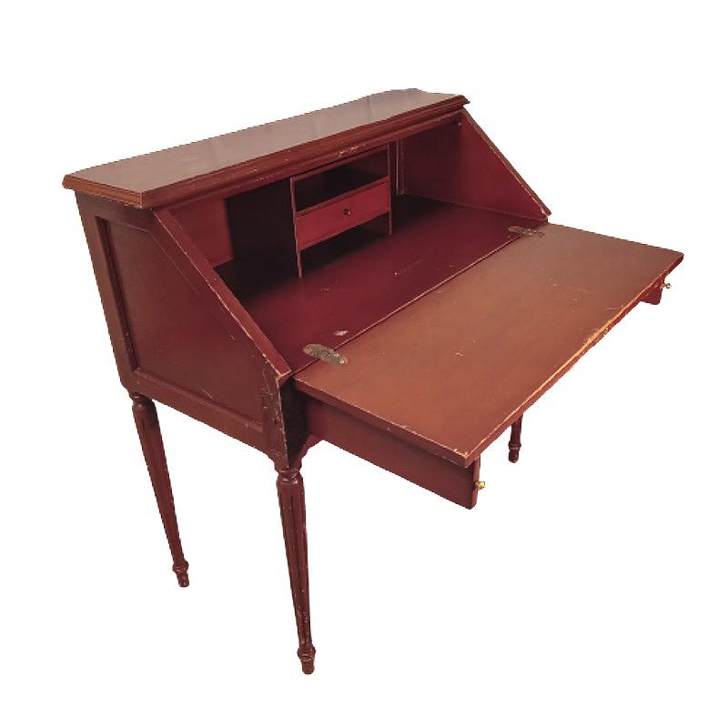 Escritorio con tapa estilo secretero, la tapa se abre y forma la superficie de trabajo. No tiene llave. Tiene algunos desgastes en la pintura y la madera.