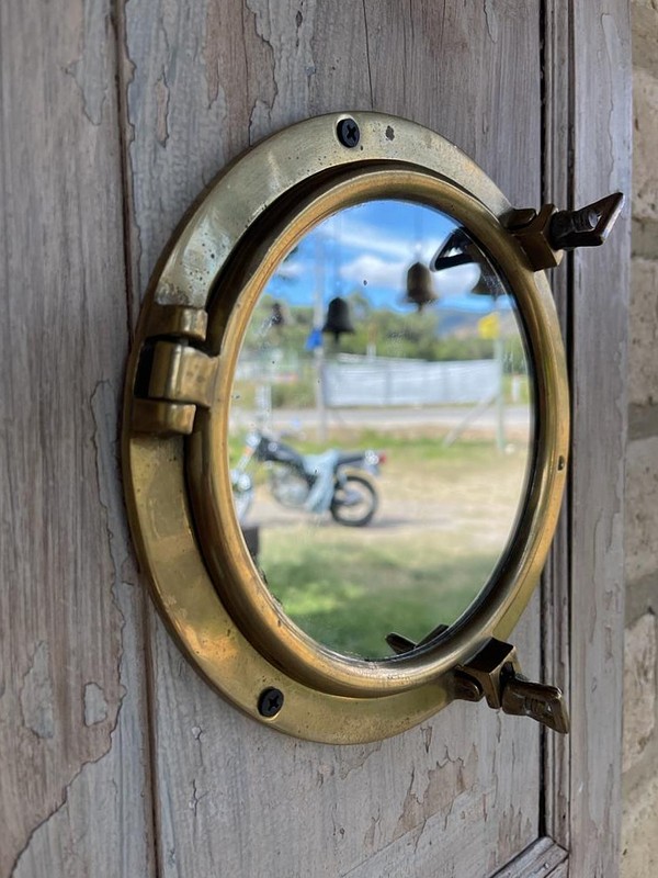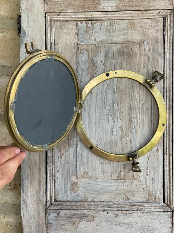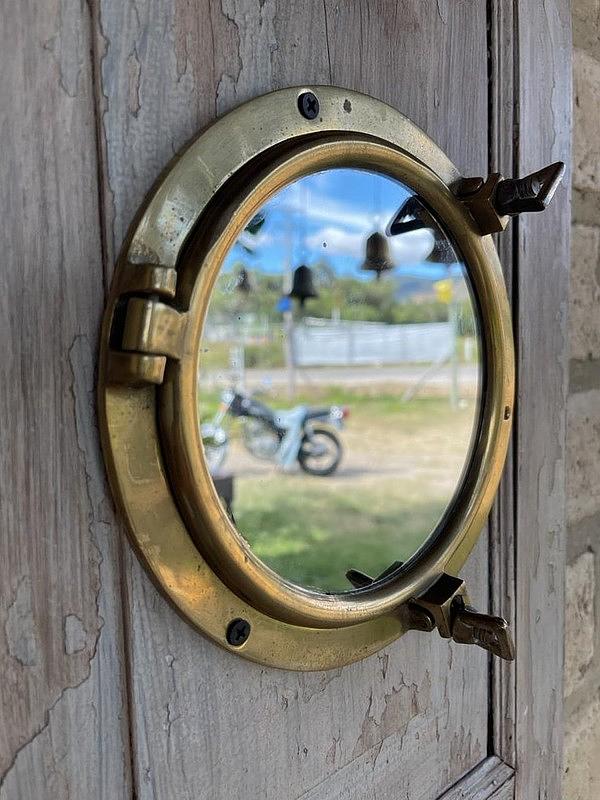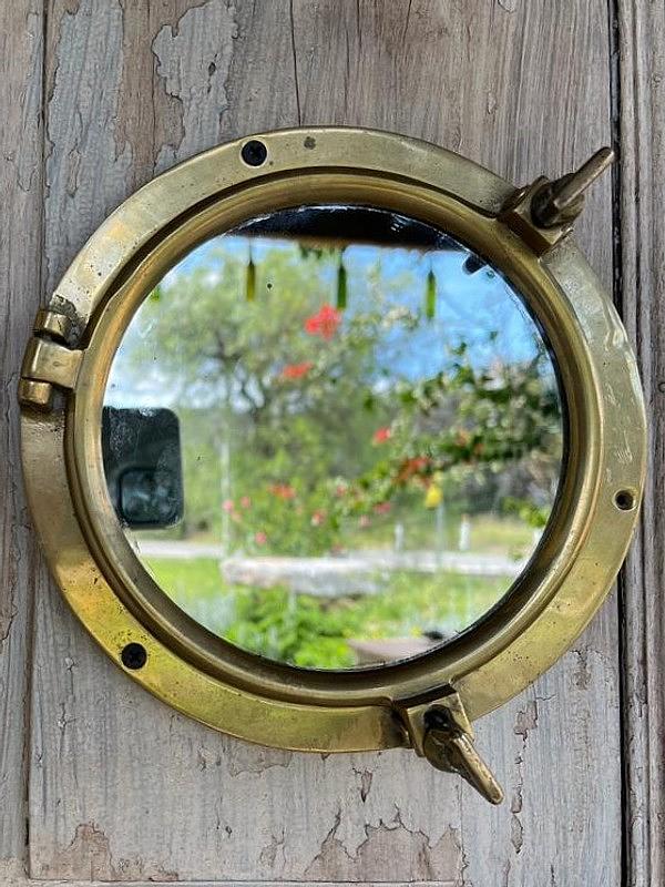 Esta pequeña escotilla perteneció a un velero que navegó por el caribe a mediados del S. XX y naufragó en Cartagena donde fue desguazado recuperando varias de sus piezas. La bisagra funciona y permite abrir la ventana del marco donde se asegura con dos tornillos mariposa. Se le agregó un espejo.