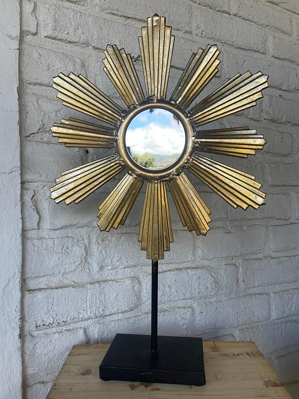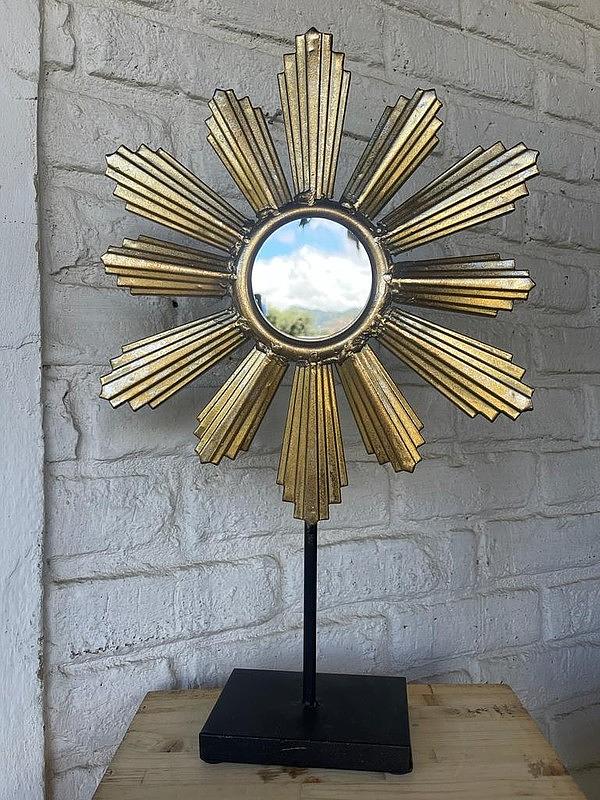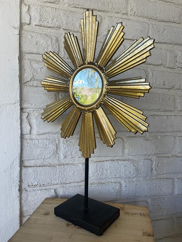 Espejo metálico con rayos dorados y soporte para apoyar sobre una mesa.