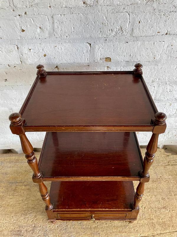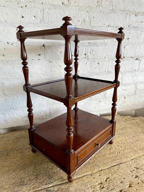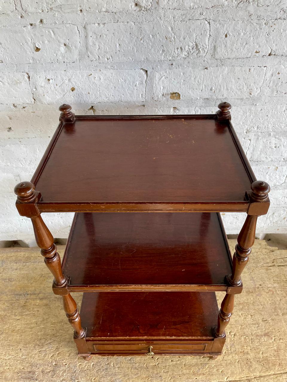 Mesa caoba estilo inglés de mediados del siglo XIX, tiene tres niveles de estanterías, soportes torneados y un cajón en la parte inferior con perilla metálica.