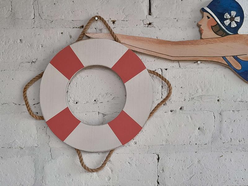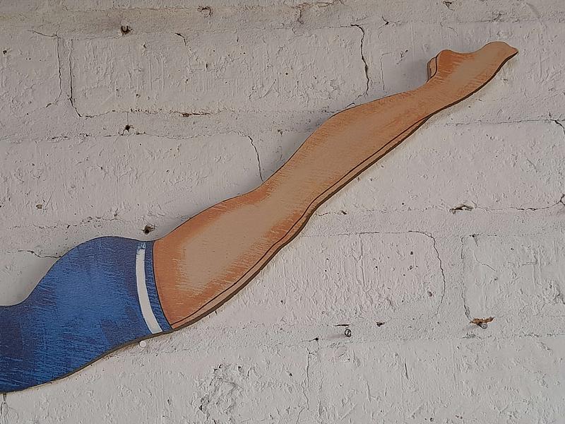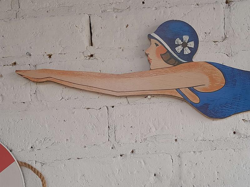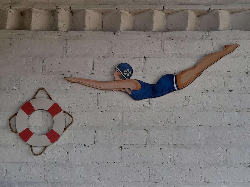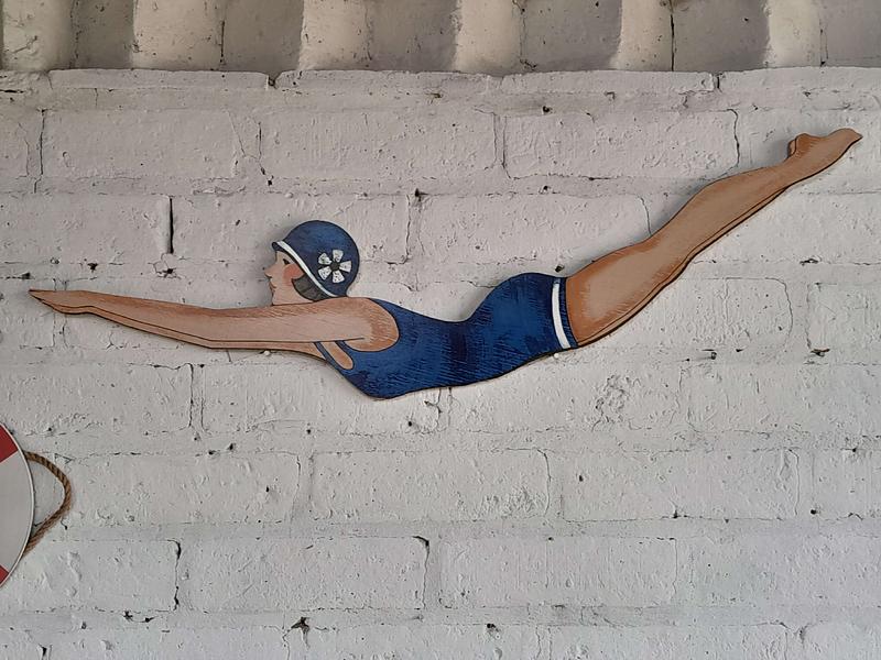 Nadadora con traje de baño de los años 70 de triplex, el salvavidas es de MDF.