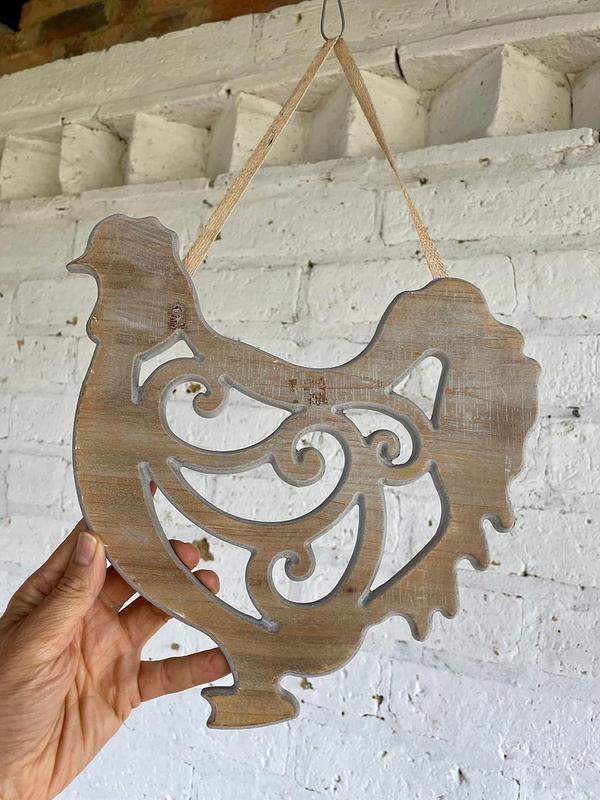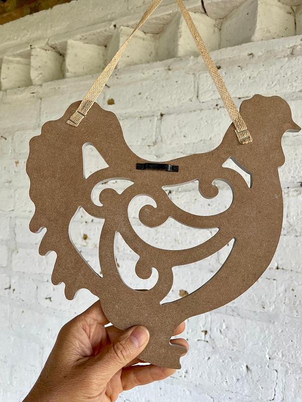 Figura de gallina tallada en madera aglomerada con calados de arabescos y decorada con pintura desgastada.