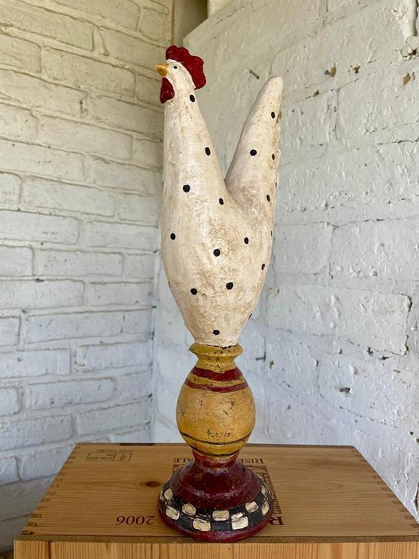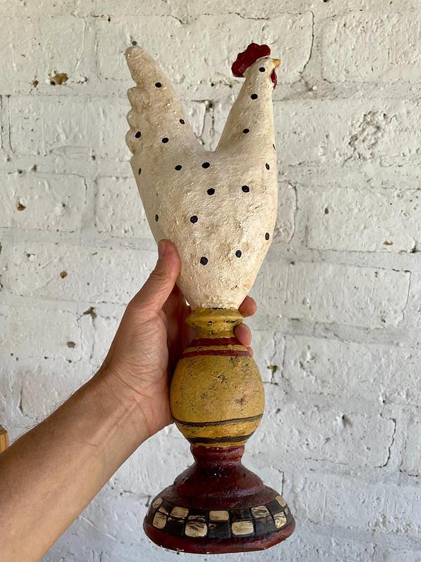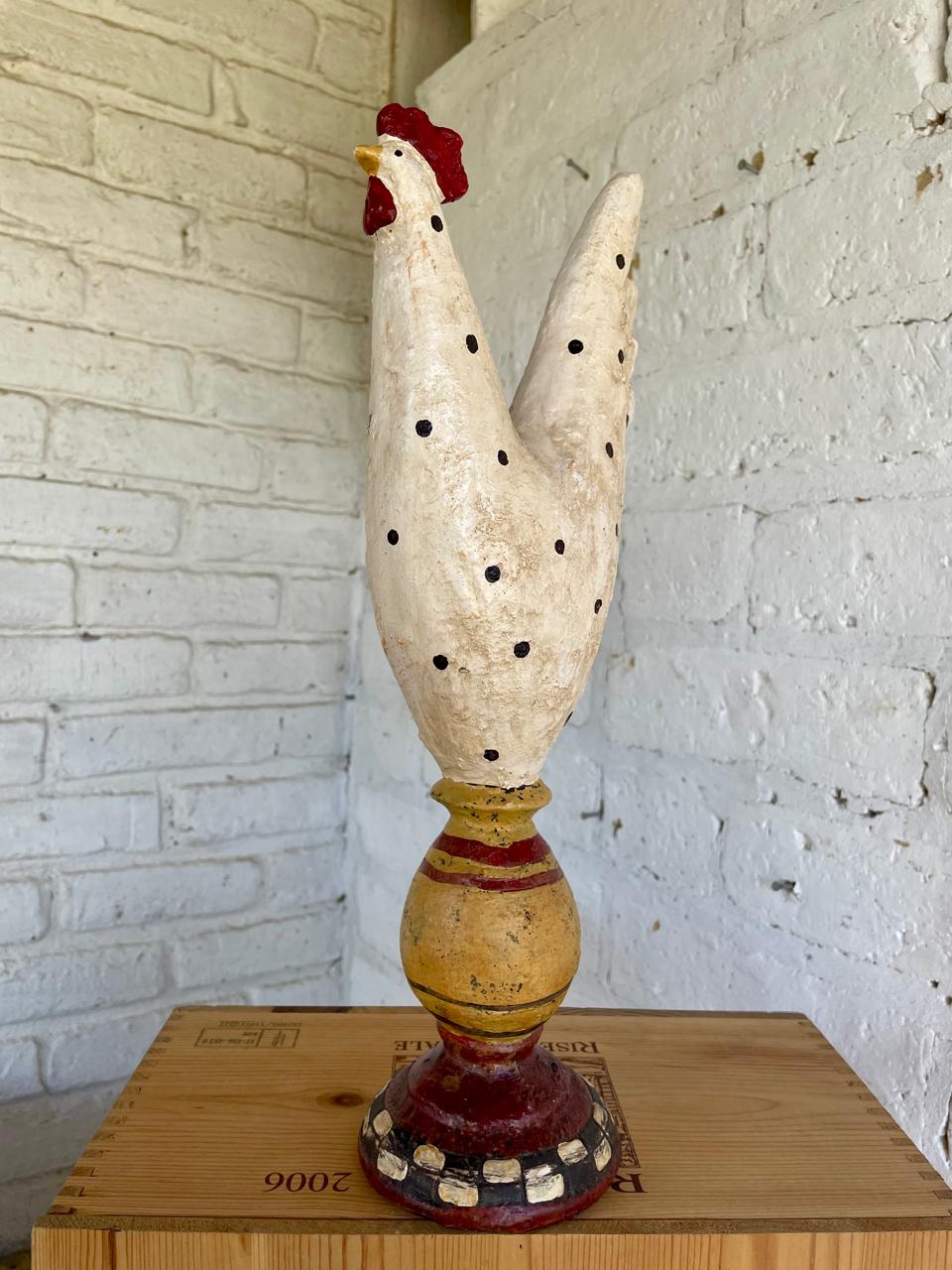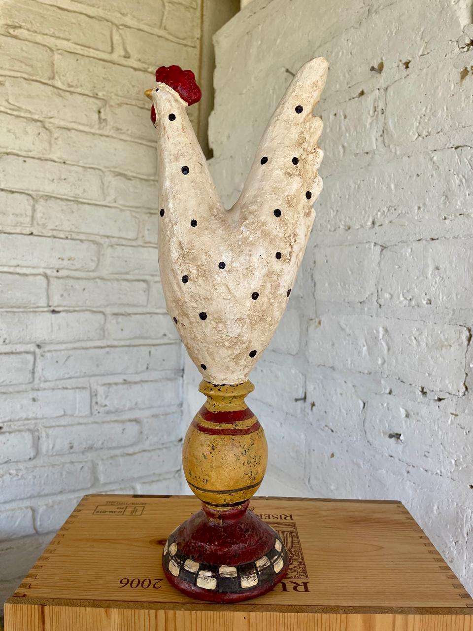 Figura de gallina elaborada en resina con apariencia rústica y decorada con pintura desgastada con apariencia antigua.