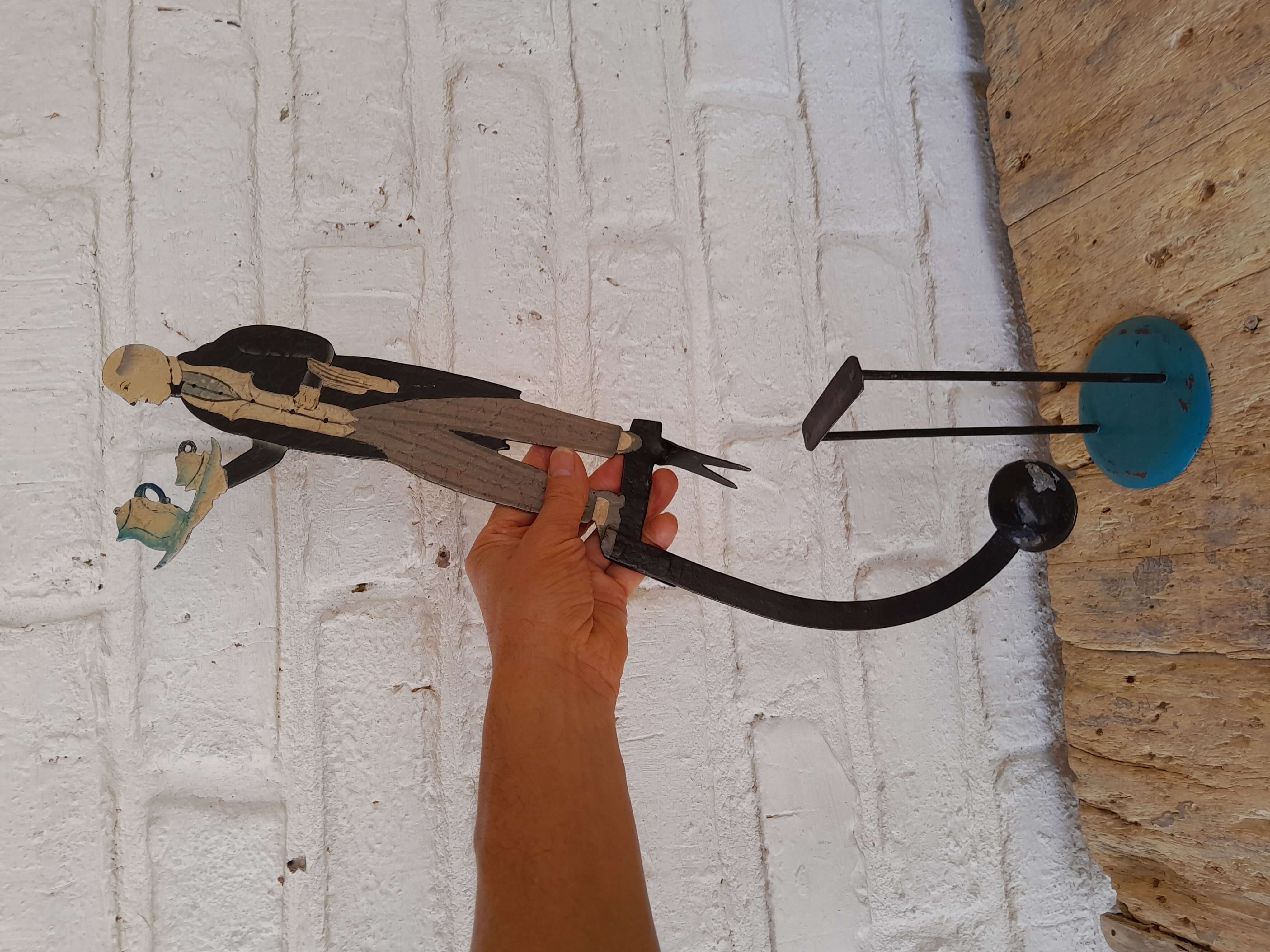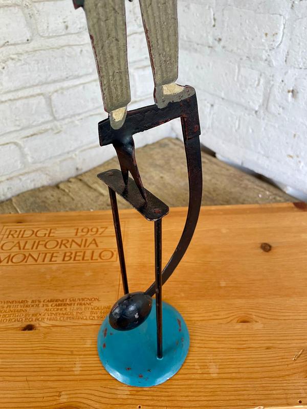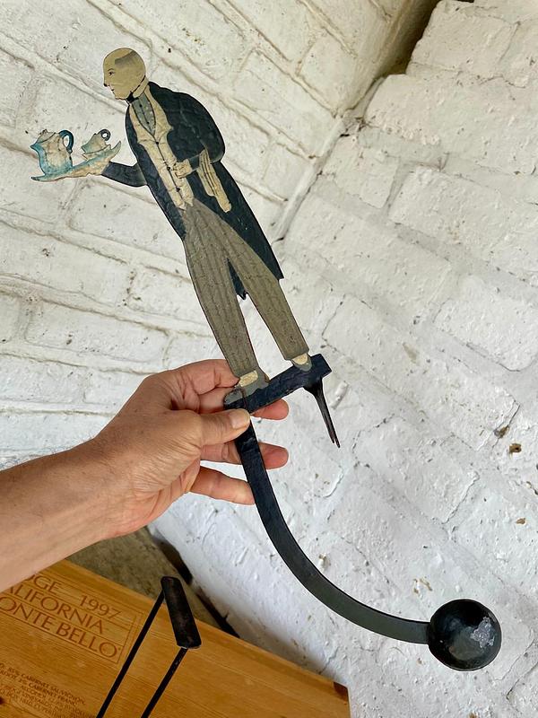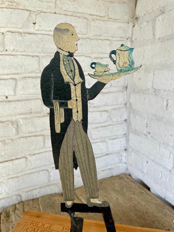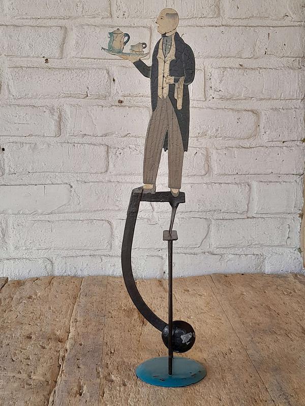 Figura de mayordomo en lámina metálica gruesa decorada con pintura desgastada dando apariencia antigua. La figura se balancea por el contrapeso del péndulo sobre el punto de apoyo, demostrando el principio del equlibrio estable. Elaborado en Indonesia en los años ochenta recreando un juguete antiguo. Se encuetra en buen estado con algunos desgastes en la pintura por el uso y el paso del tiempo.