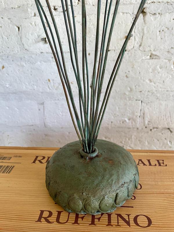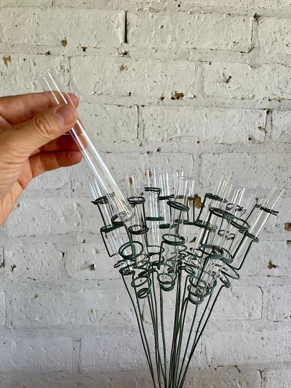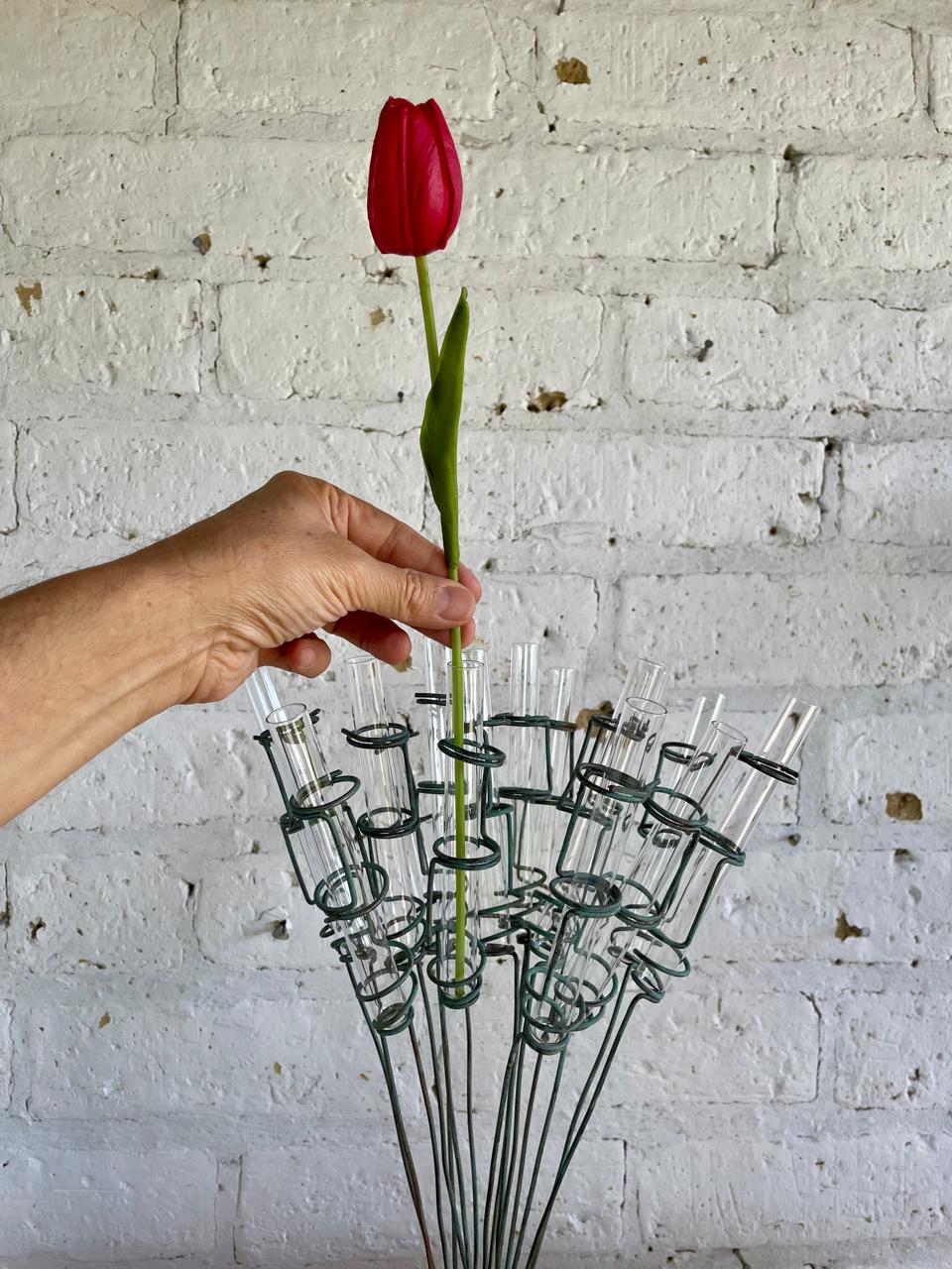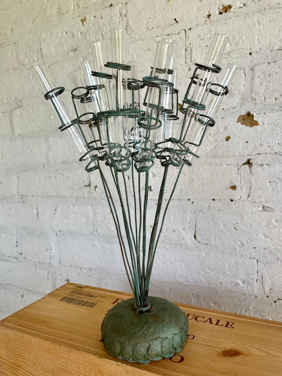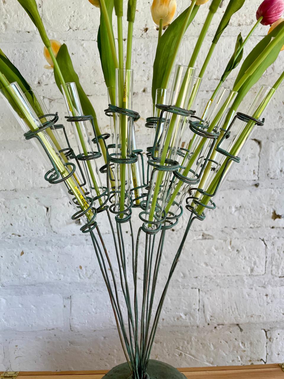 Florero inspirado en un antiguo soporte con tubos de ensayo de laboratorio. Sobre una base metálica rellena de concreto se levantan 15 soportes en espiral donde se acomodan los tubos de vidrio que sirven como soporte de las flores. Decorado con pintura verde desgastada.