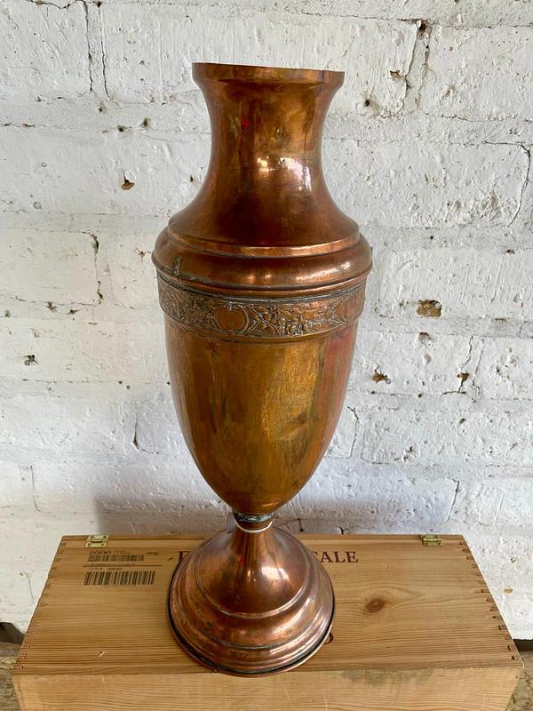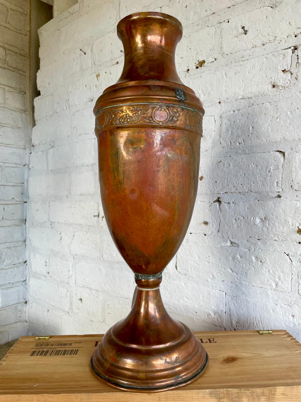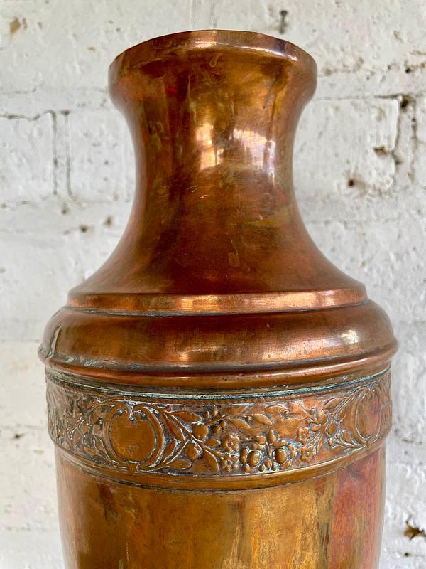 Florero antiguo de iglesia elaborado en lámina gruesa de cobre, tiena abolladuras y desgastes por el uso.