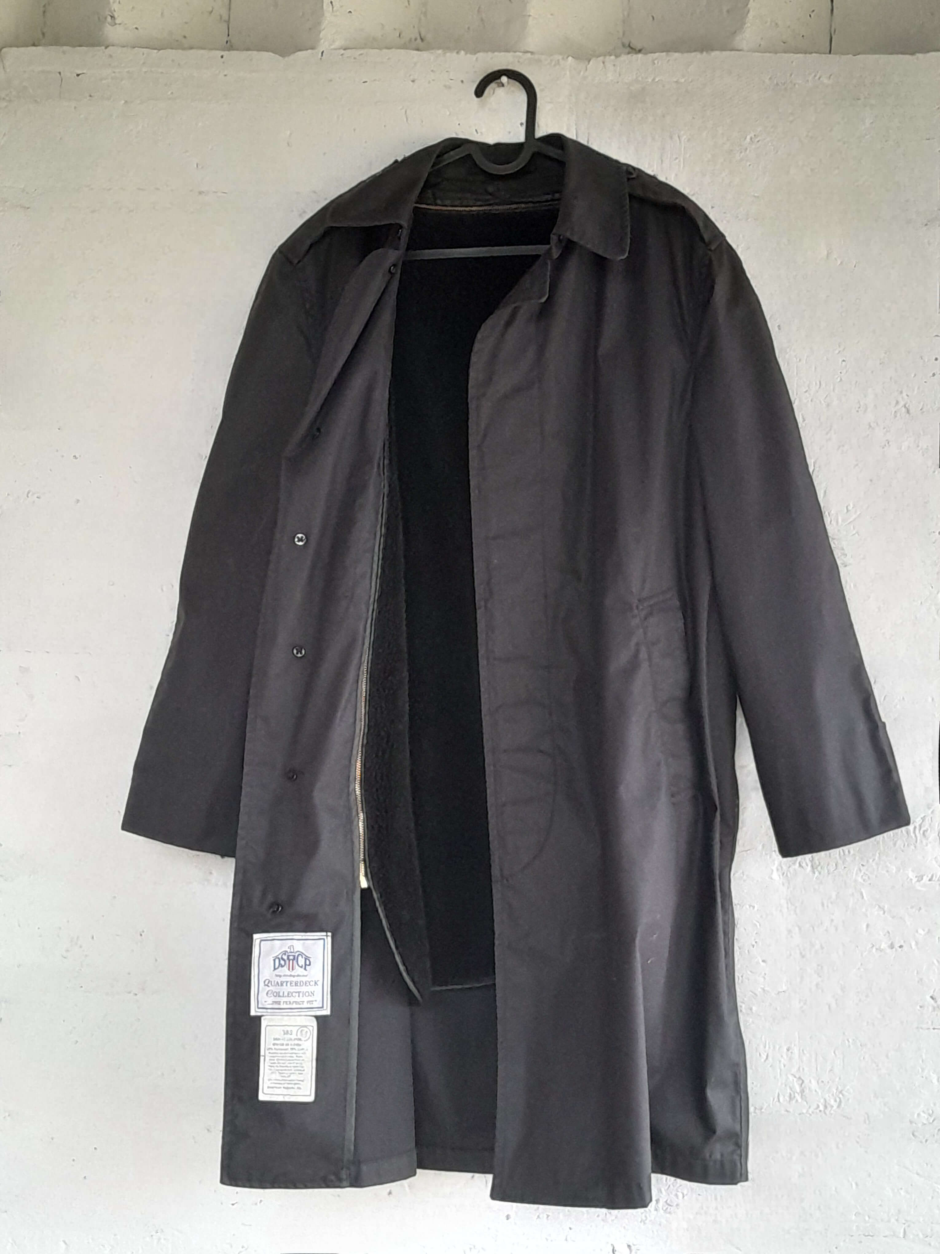 Gabardina en poliéster y algodón producida en U.S.A. por la marca American Apparel Inc como prenda militar en la década de los ochenta. Fabricada con el sello DSCP. El forro térmico se puede quitar con cremallera.