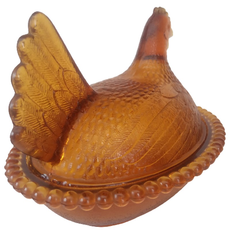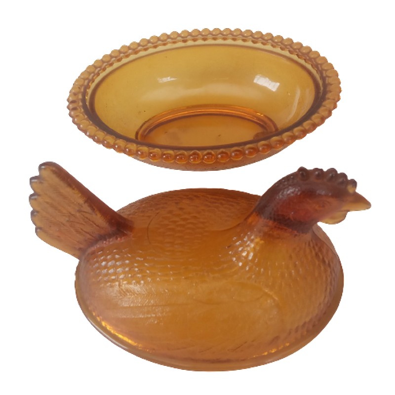 Gallina de vidrio ámbar producido en USA en 1960. La parte superior es la tapa de la base.