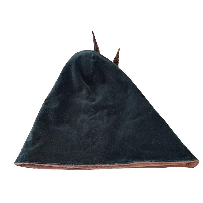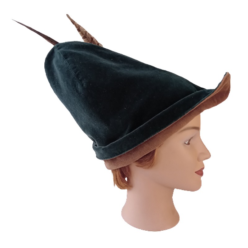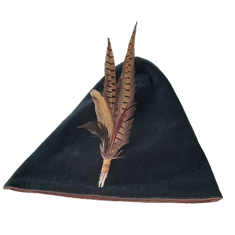 Sombrero estilo bycocket doble faz elaborado en terciopelo verde y pana café adornado con un penacho de plumas de faisan.