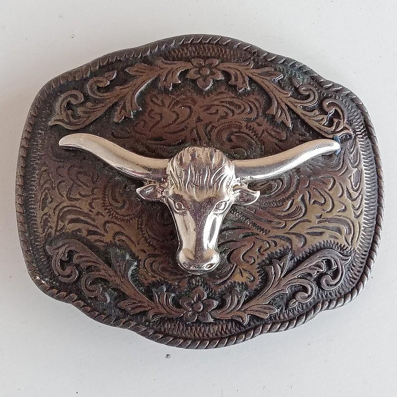 Hebilla estilo texano, en bronce y acero inoxidable.