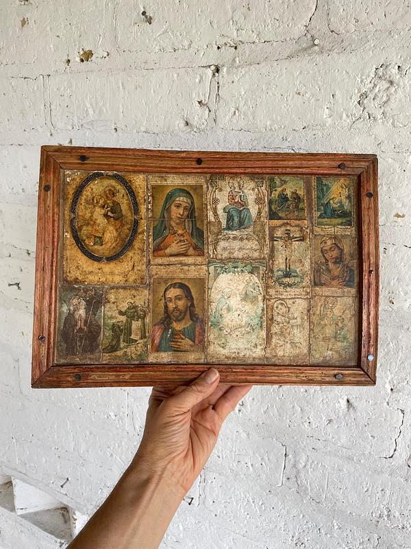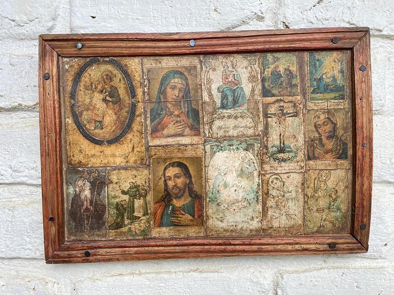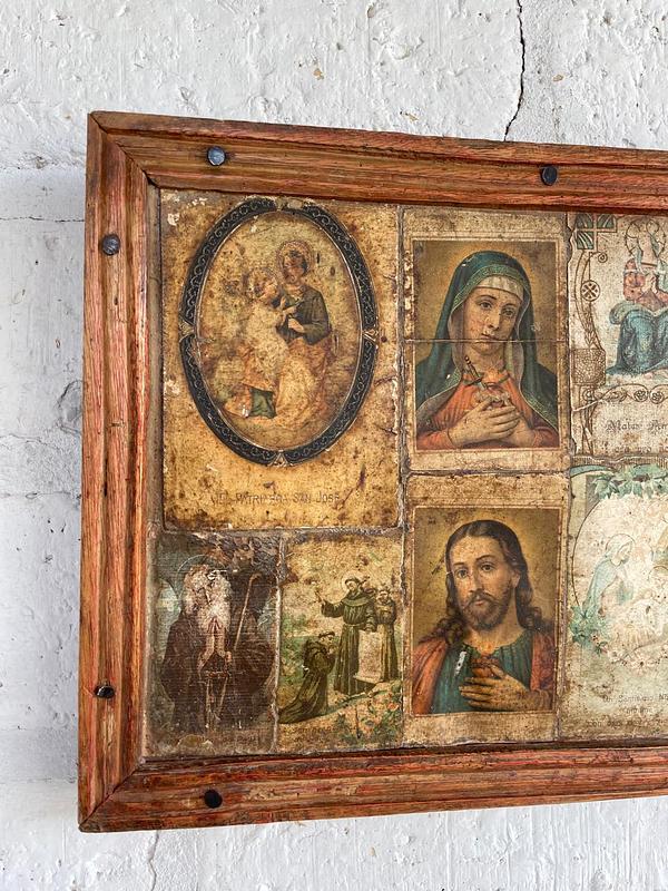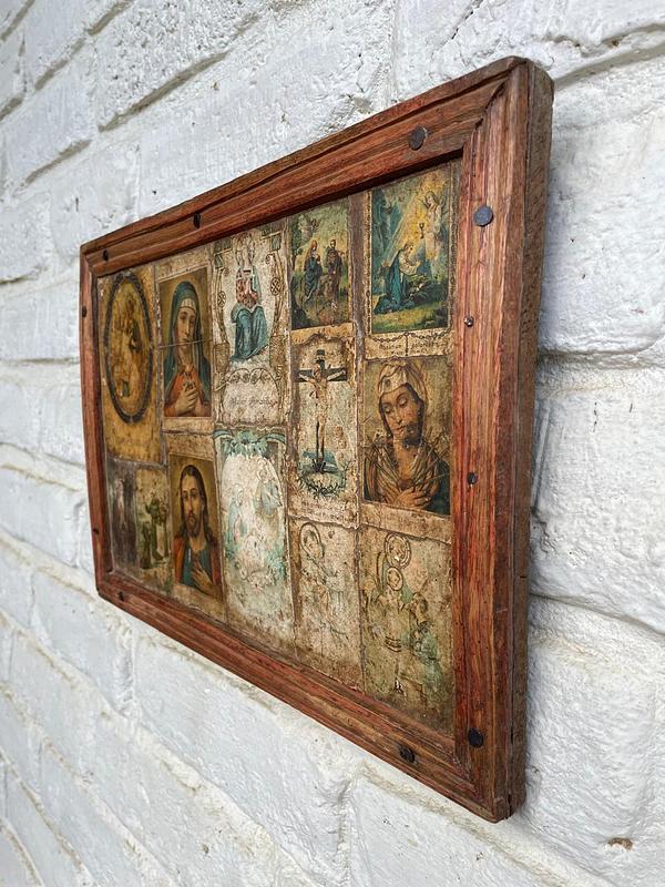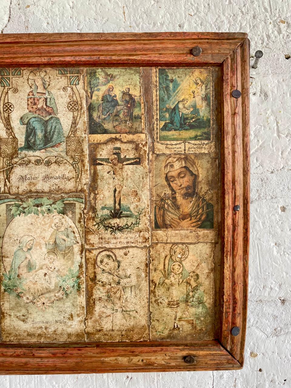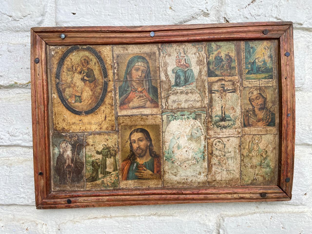 Cuadro elaborado por campesinos Boyacenses en los años 60, sobre tabla rústica están pegadas las vitelas religiosas de diferentes imágenes, una moldura artesanal hace las veces de marco. Tiene desgastes en la madera y en la imagen