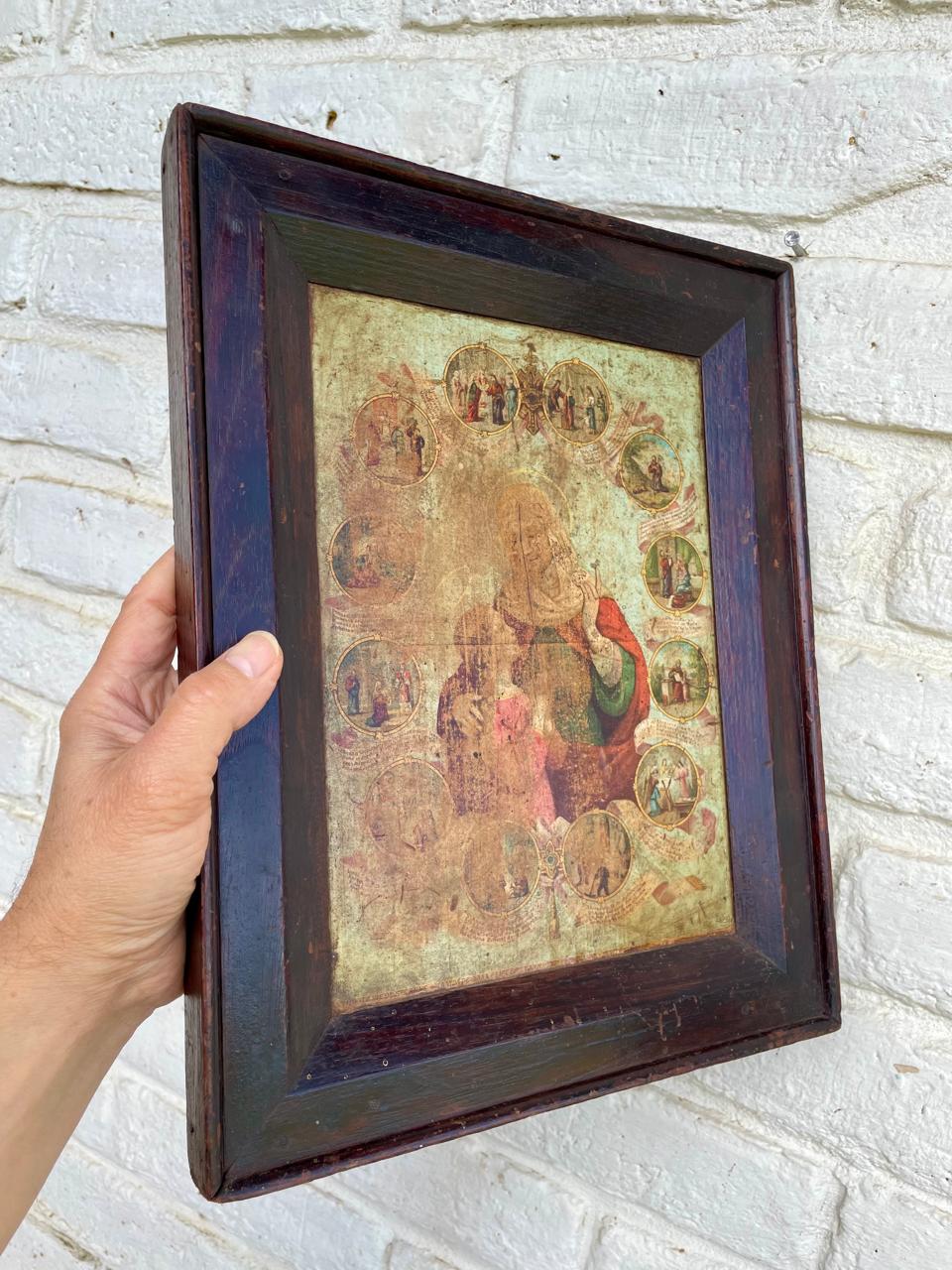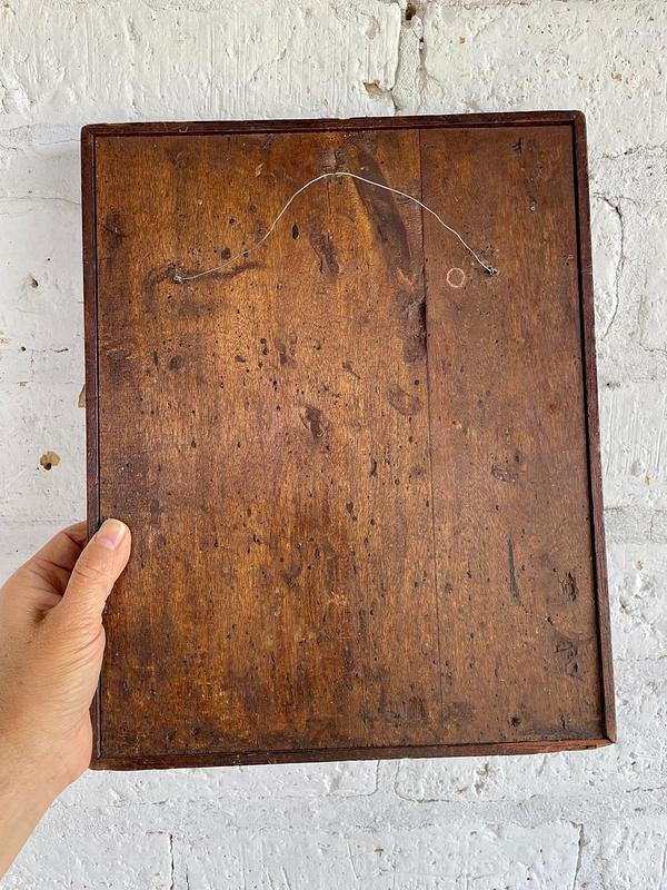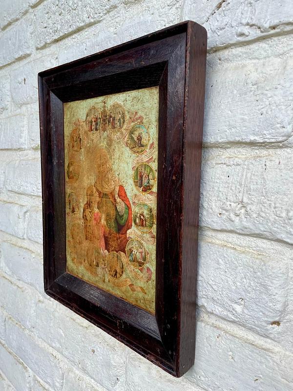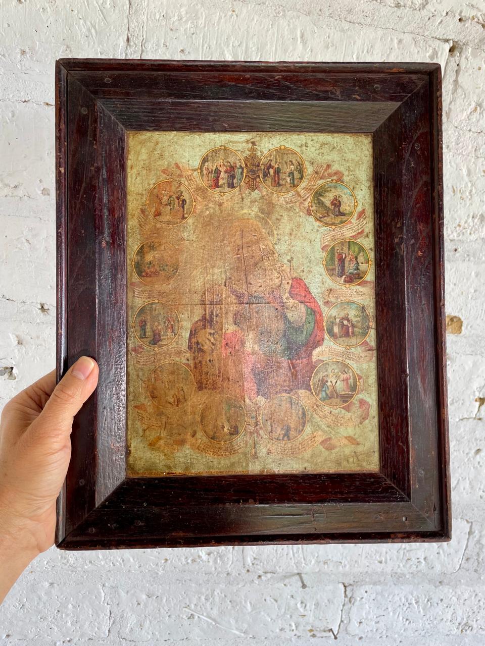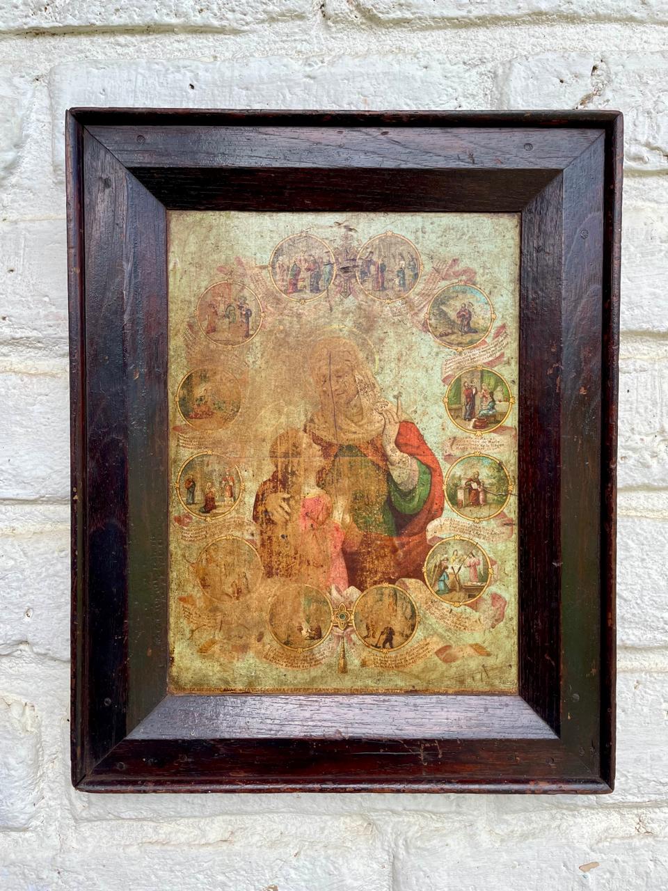 Cuadro rústico del arte popular Boyacense; lámina de Santa Ana con la Virgen María. Cuadro elaborado por campesinos Boyacenses en los años 60. Campesinos compraban en la Basílica de Chiquinquirá láminas religiosas europeas; sobre tabla rústica está pegada la lámina religiosa, una moldura artesanal hace las veces de marco. Tiene desgastes en la madera y en la imagen.