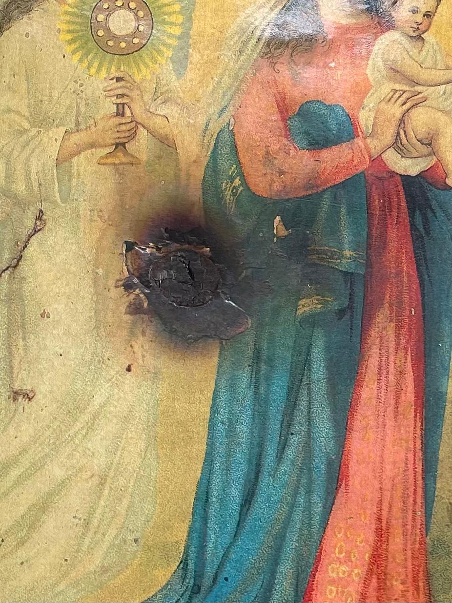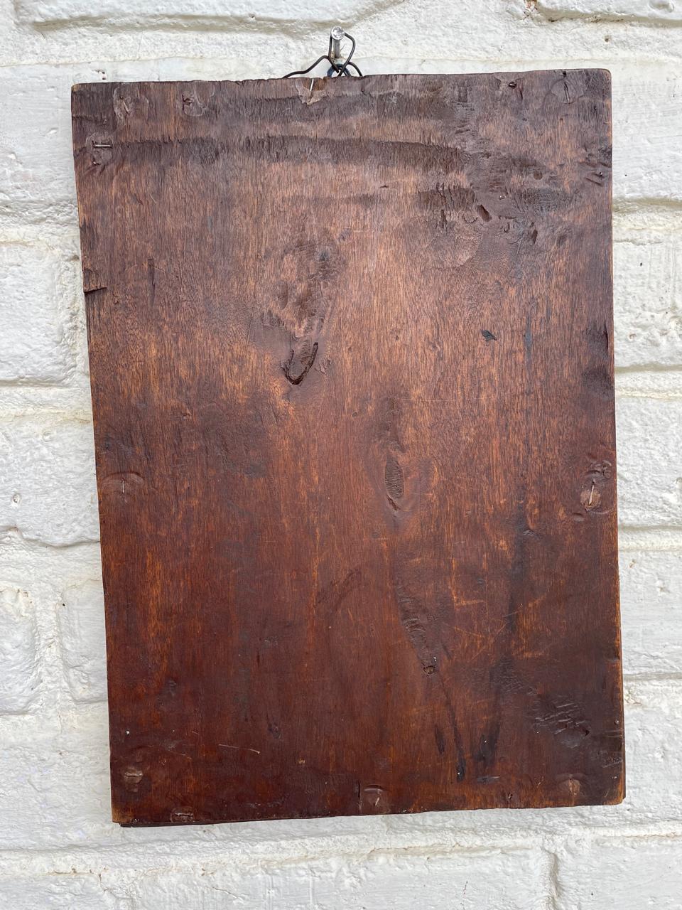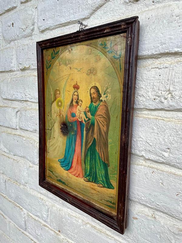 Cuadro elaborado por campesinos Boyacenses en los años 60, sobre tabla rústica está pegada la lámina religiosa de la Sagrada Familia en su milagrosa advocación de la peña. una moldura artesanal hace las veces de marco. Tiene desgastes en la madera, en la lámina está quemada y presenta desgastes y rayaduras.