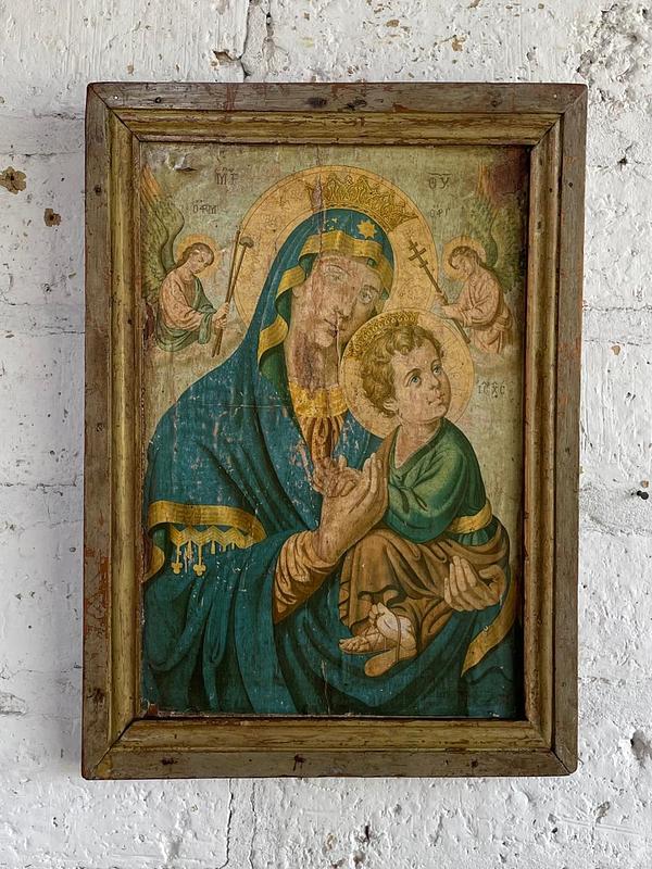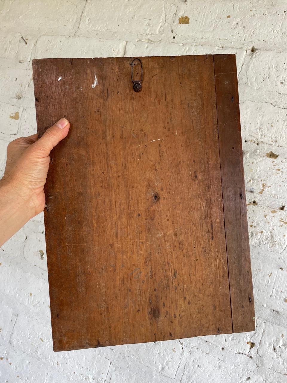 Cuadro elaborado por campesinos Boyacenses en los años 50, sobre tabla rústica está pegada la lámina religiosa importada, aquirida por locales en la Basilca de Chiquinquira. Una moldura artesanal hace las veces de marco a la tabla base. Iconografía del arte popular religioso de la región Andina de Colombia, elaborada con sencillez y rusticidad se ha conservado por varias generaciones como signo de fe. Los colores de la lámina se han desvanecido presentando manchas, desgastes y rasgaduras. La madera está libre de termitas.