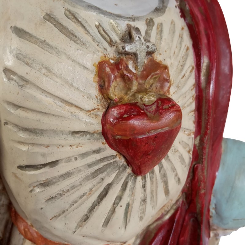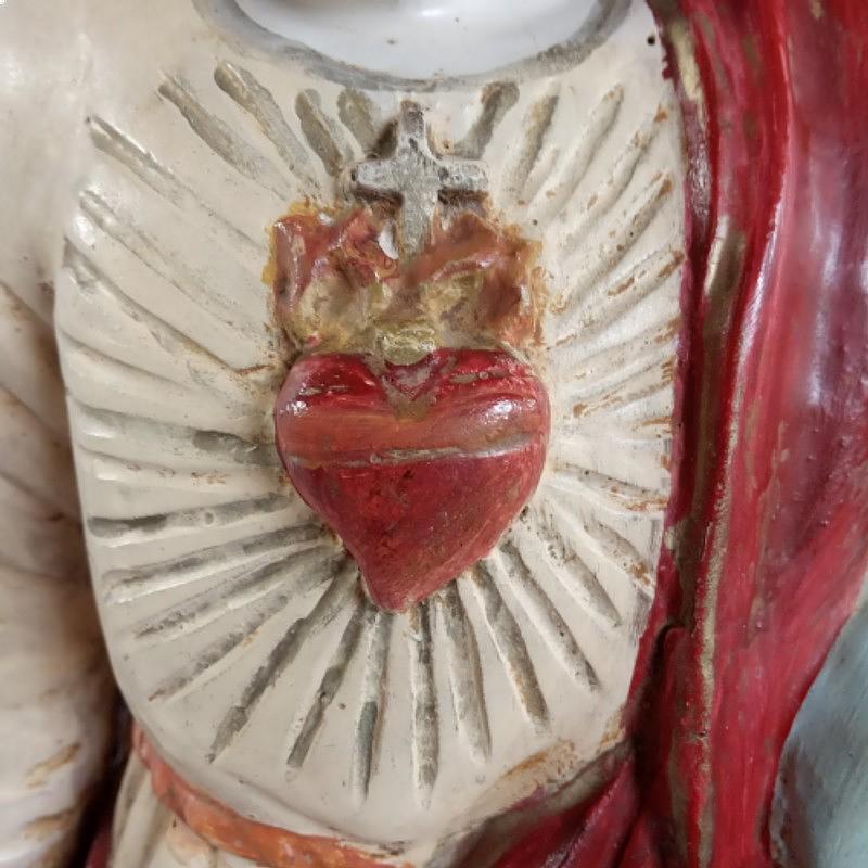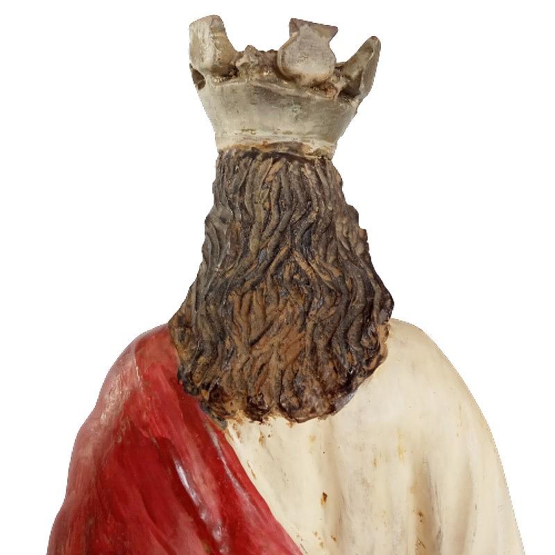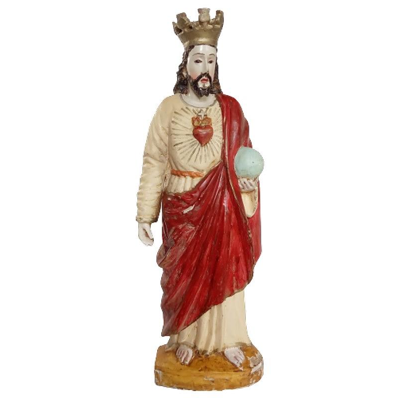 Antigua imagen rústica en madera tallada, ojos en cristal. Representa a Cristo Rey con el orbe en la mano izquierda, el corazón rodeado de llamas y la corona en la cabeza.