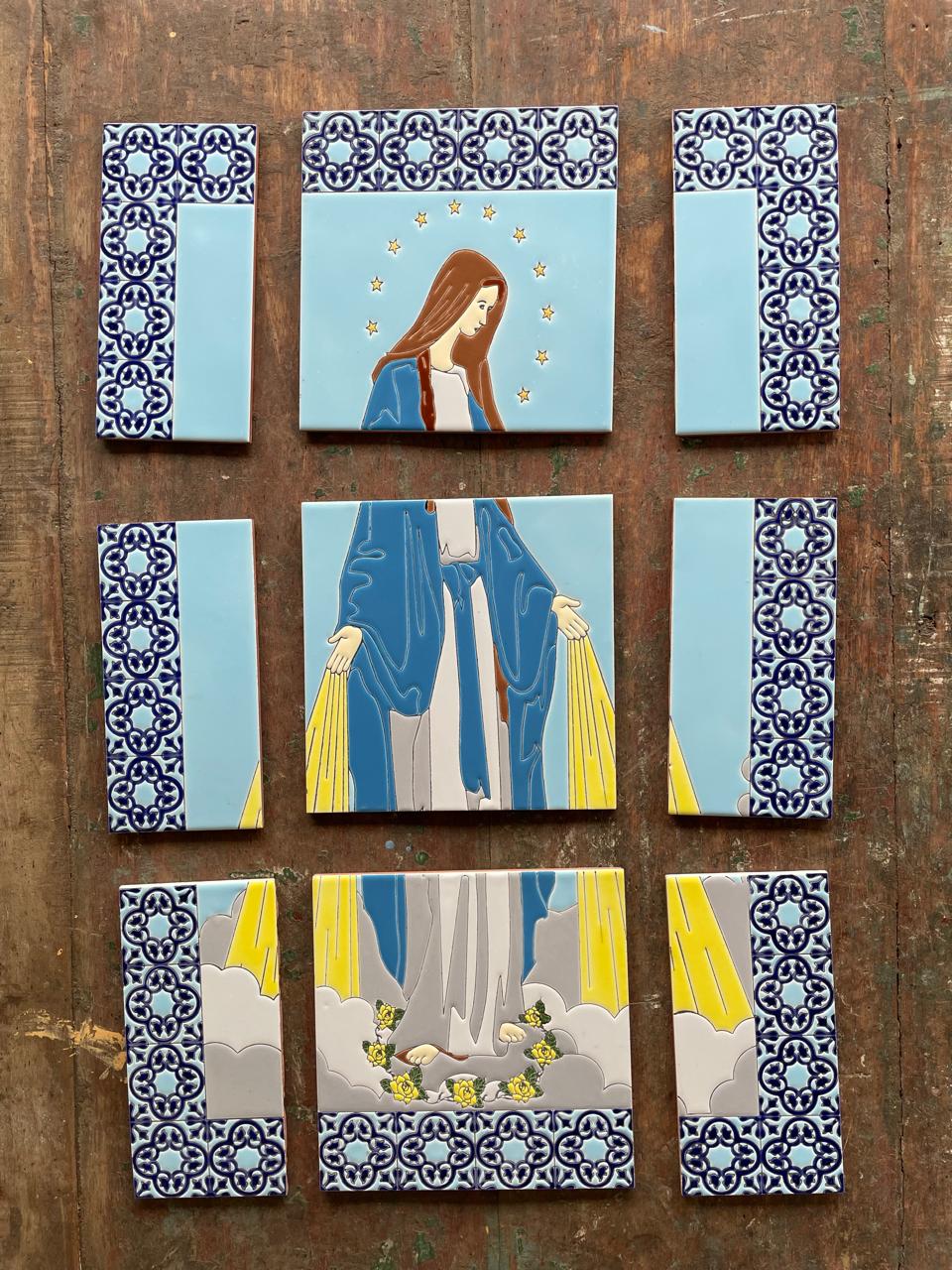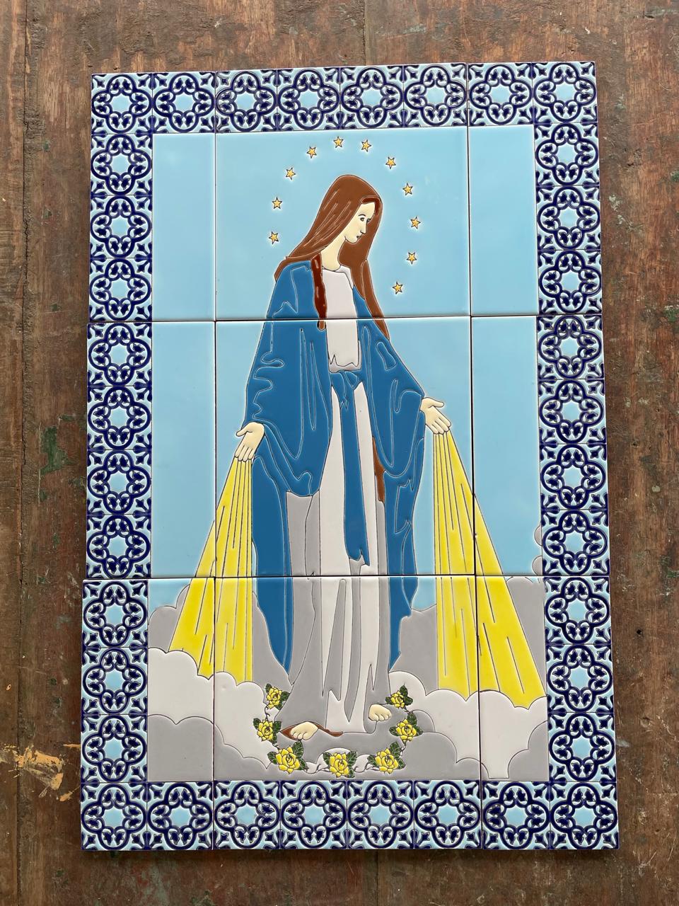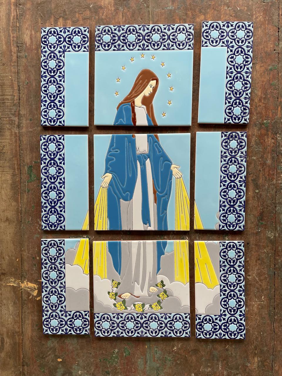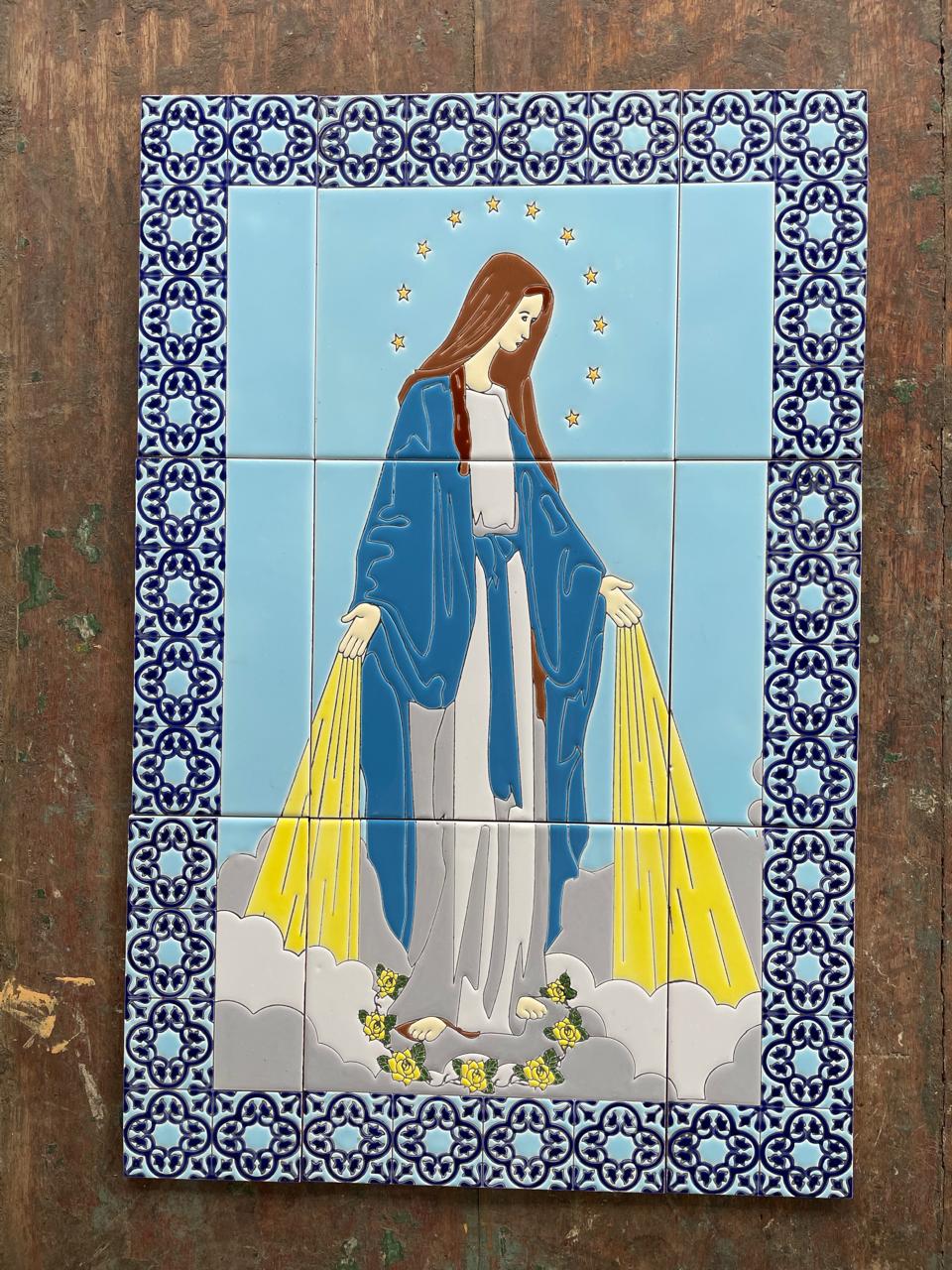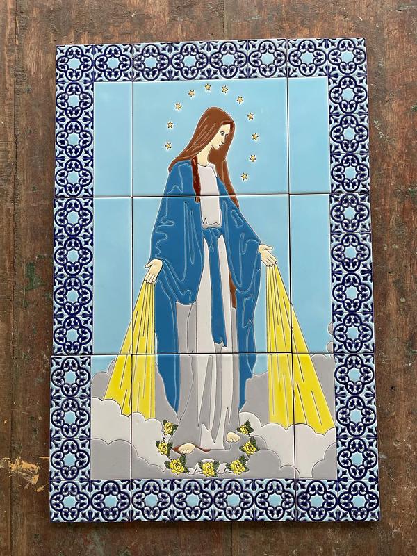 Pintada a mano sobre baldosa y quemada a alta temperatura. Apta para exteriores. Elaborada con barnices de calidad para garantizar su exposición a la intemperie, sol, lluvia, etc., sin desteñirse. Colores garantizados de por vida. Ideal para empotrar en la pared, decorar fachadas y portales.