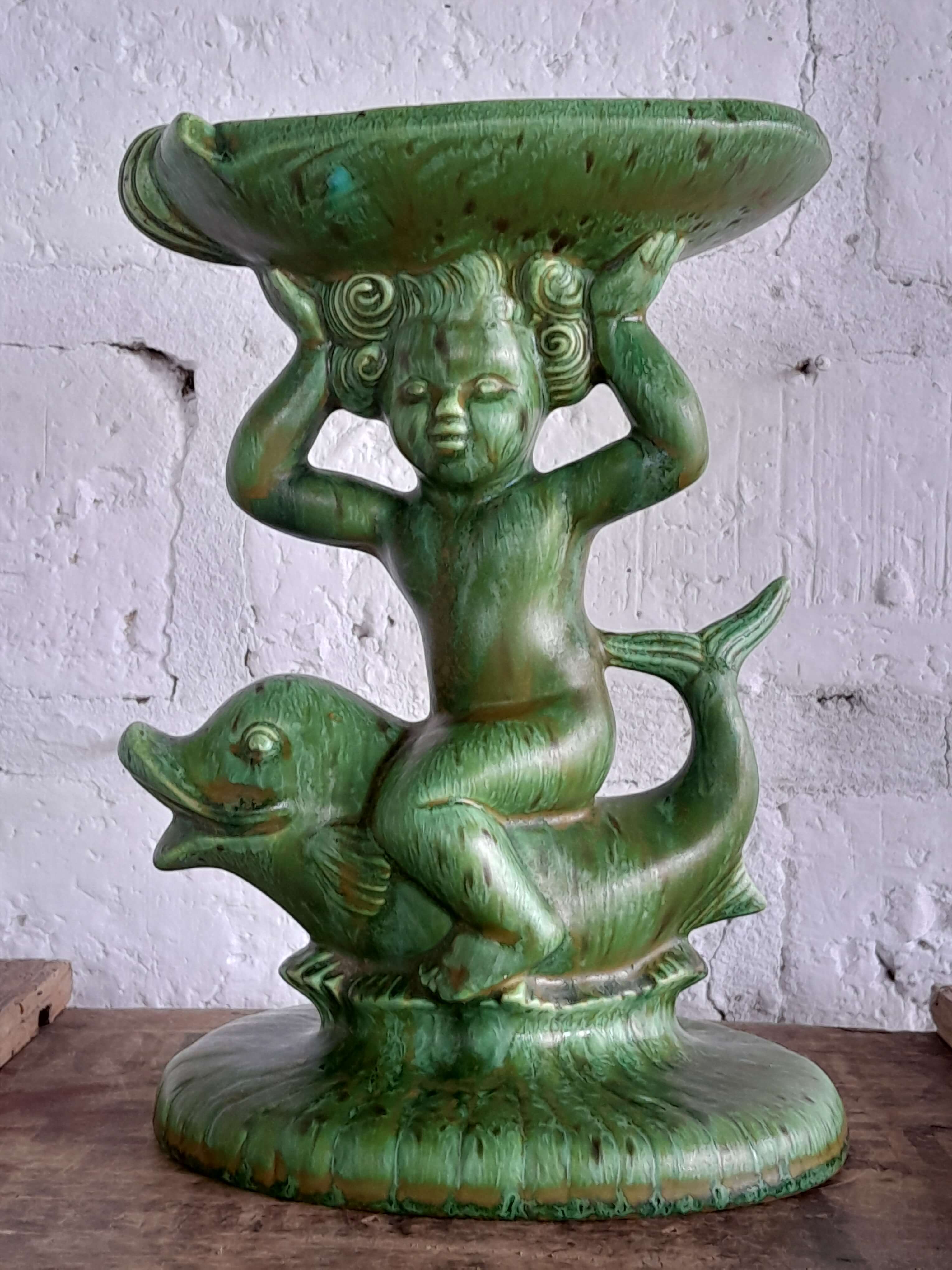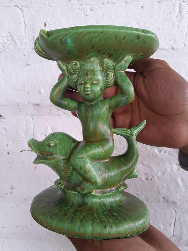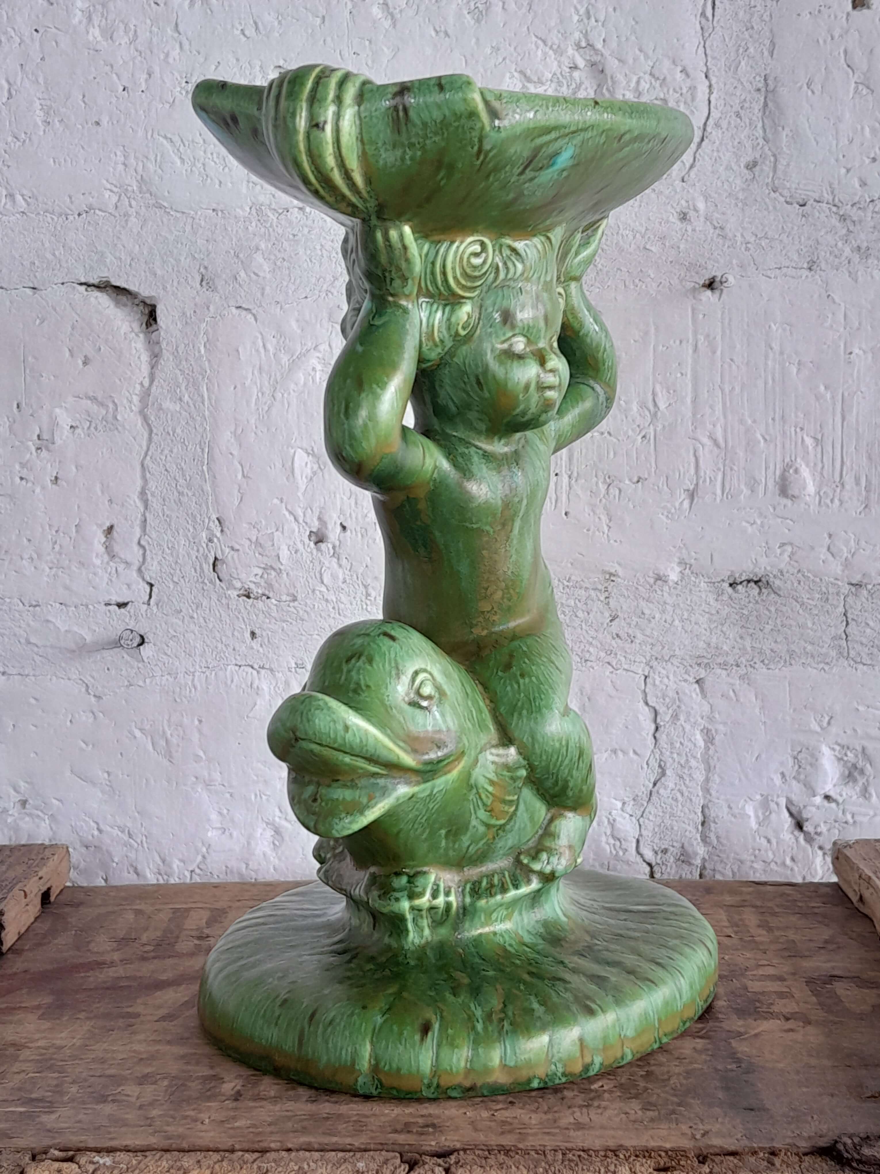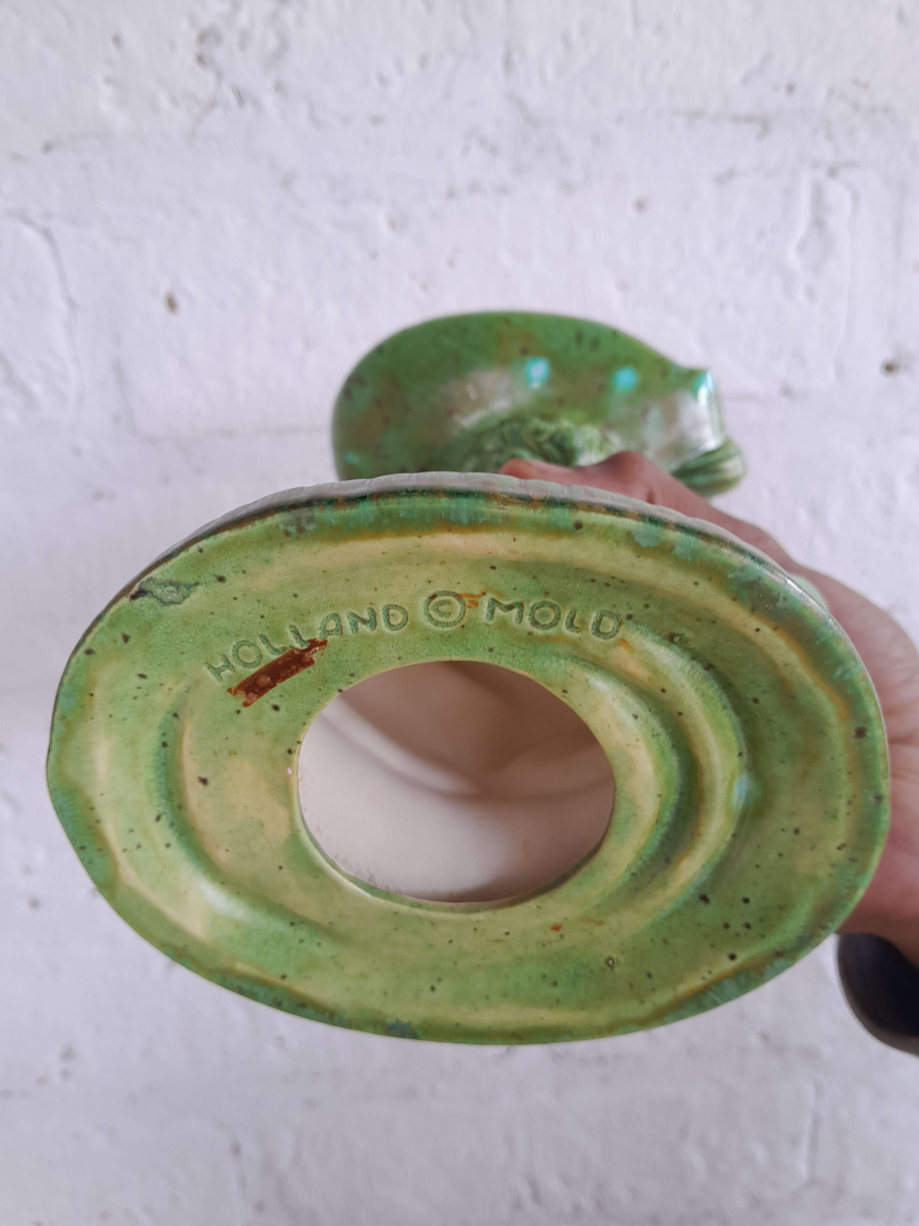 Pedestal de porcelana producida en Holanda decorada con pintura vitrificada verde desgastada.Una figura decorativa impactante por el color y la forma; se puede utilizar como plato porta anillos o jabonera