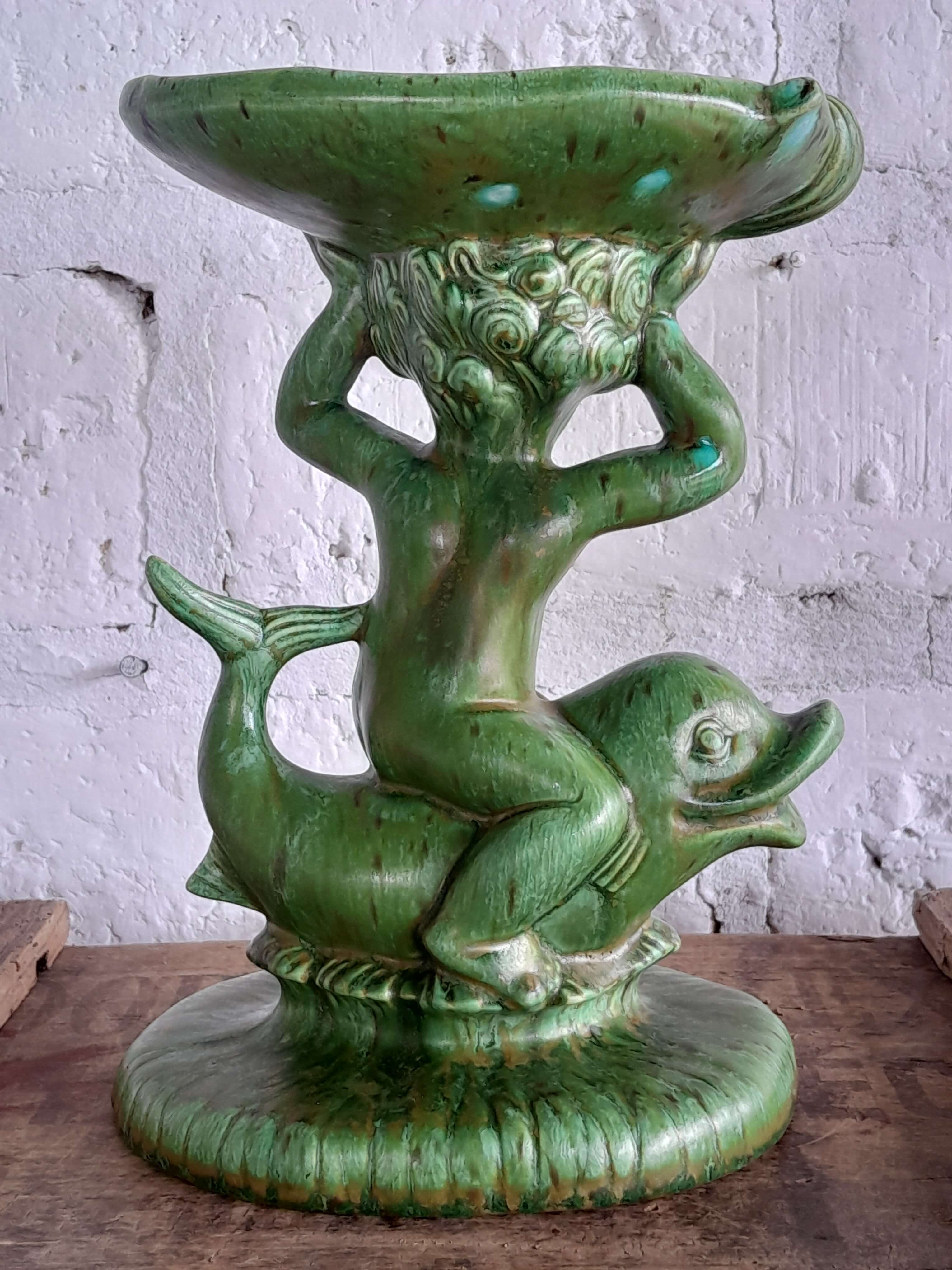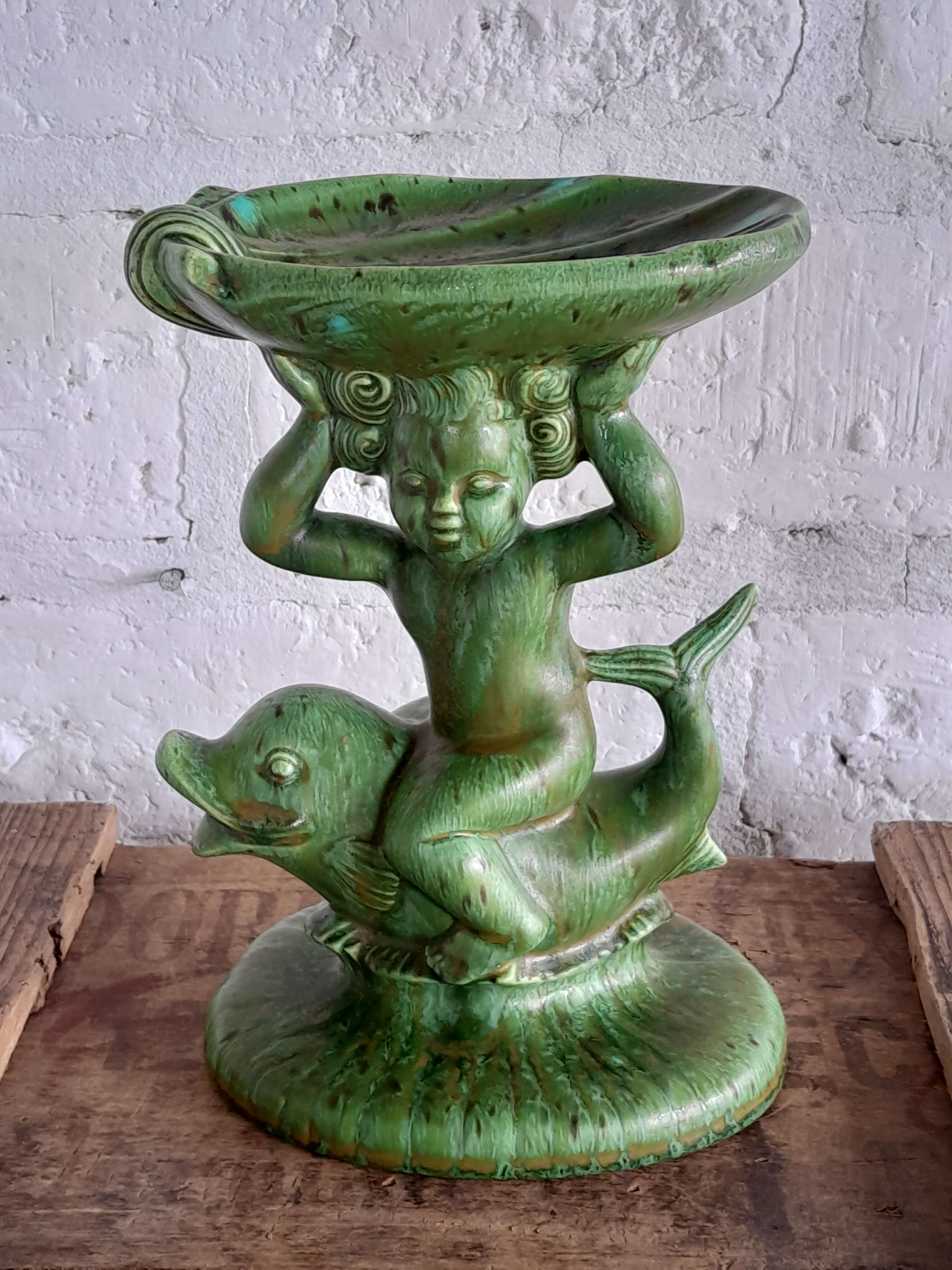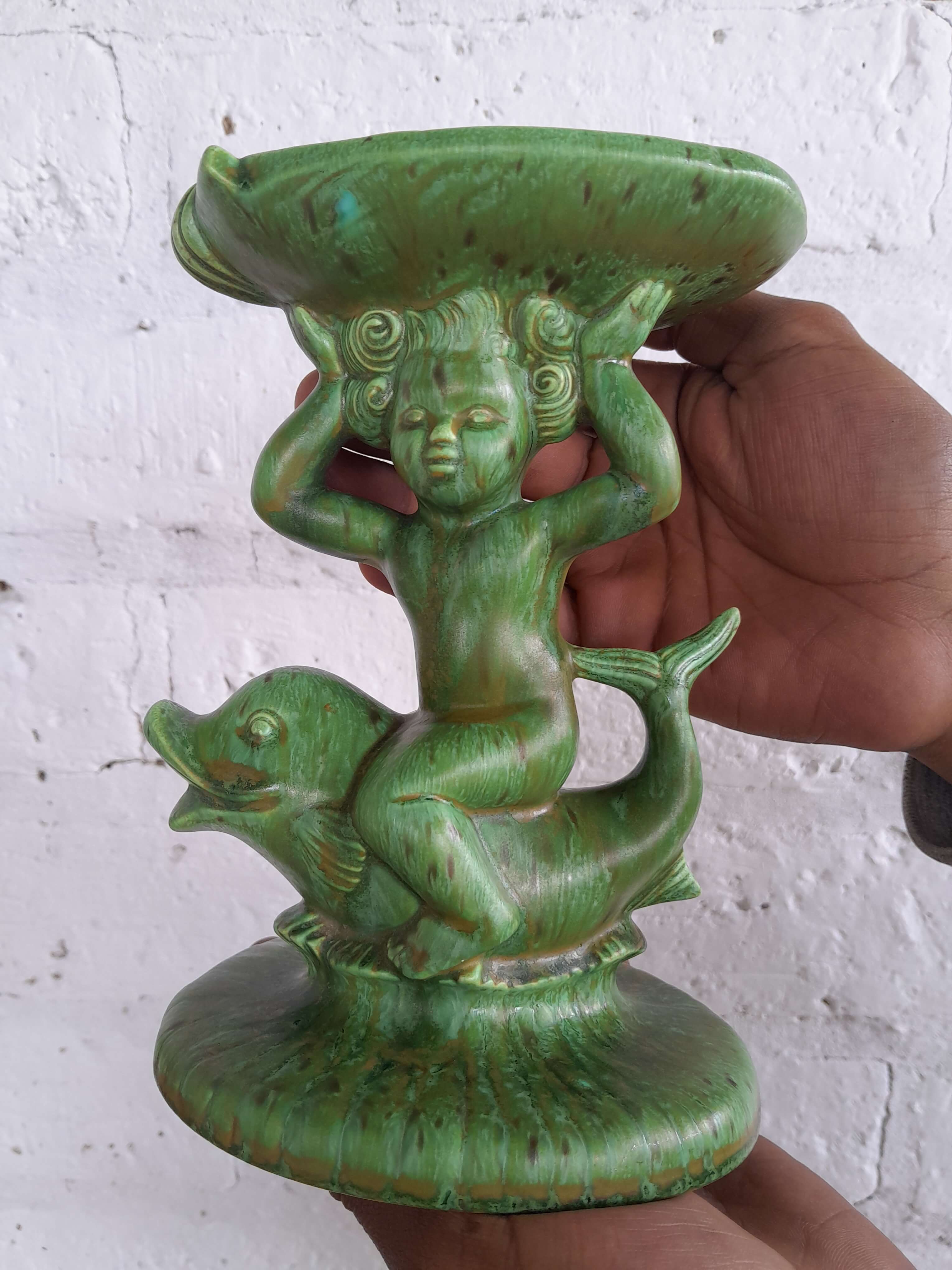Pedestal de porcelana producida en Holanda decorada con pintura vitrificada verde desgastada.Una figura decorativa impactante por el color y la forma; se puede utilizar como plato porta anillos o jabonera