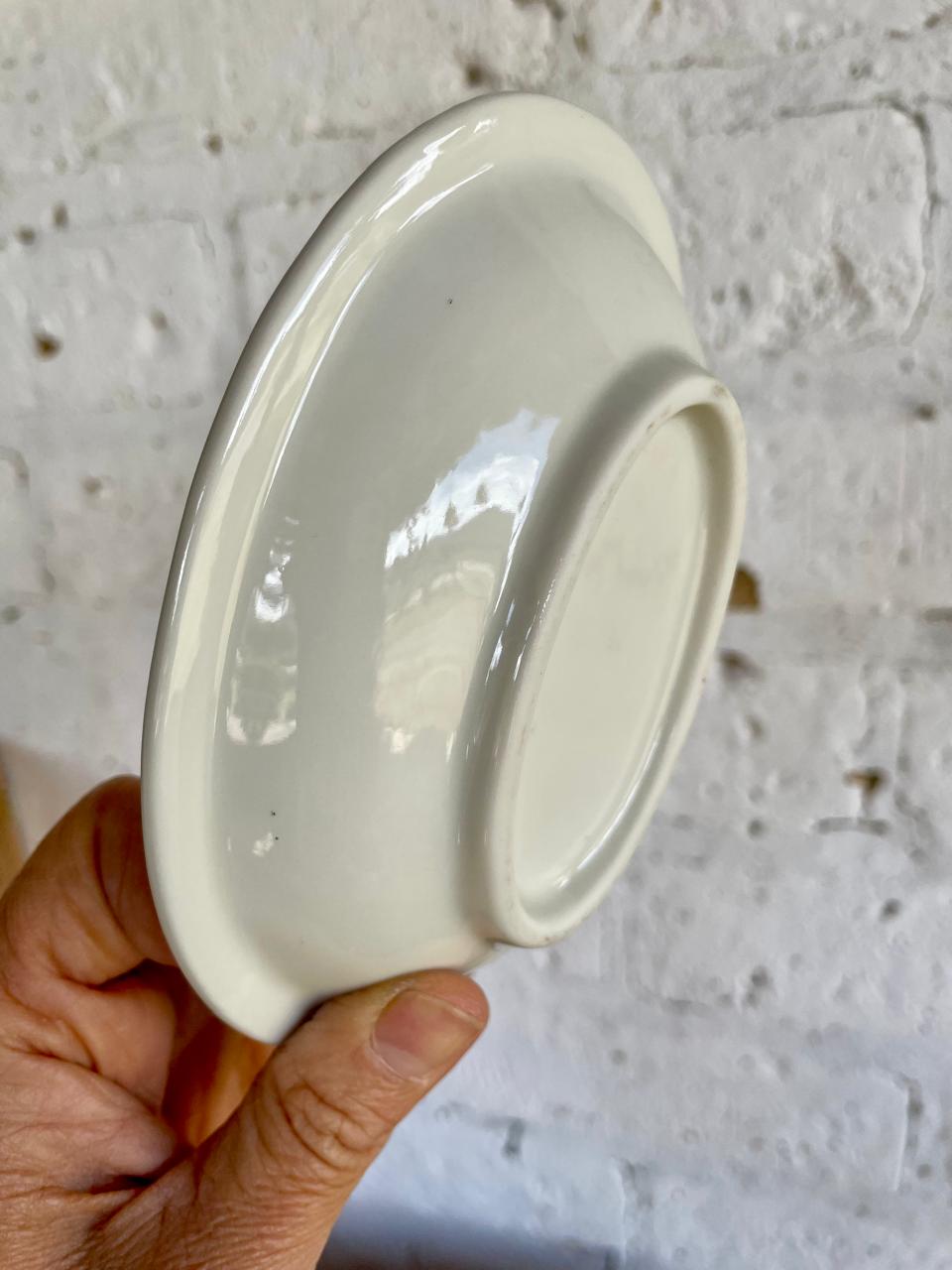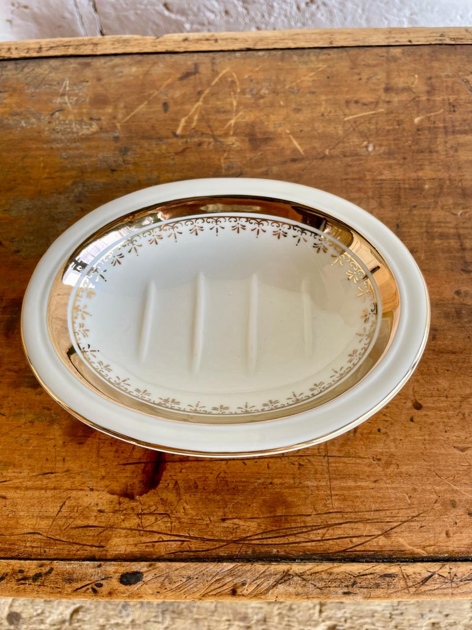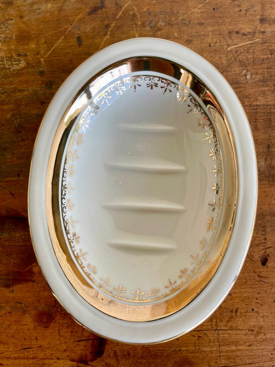 Jabonera de porcelana decorada con bordes dorados. Se encuentra en buen estado.