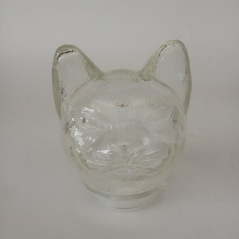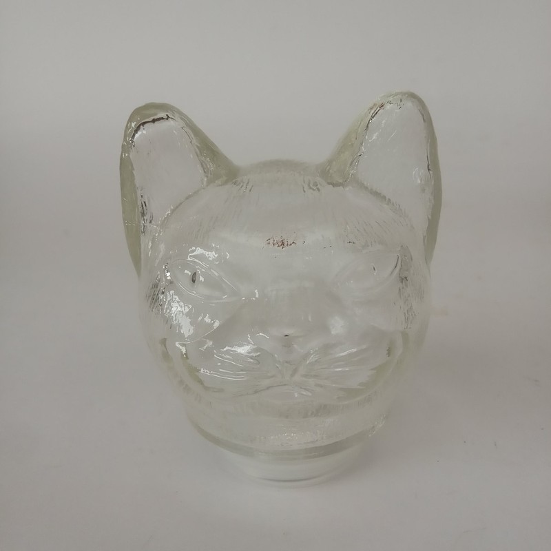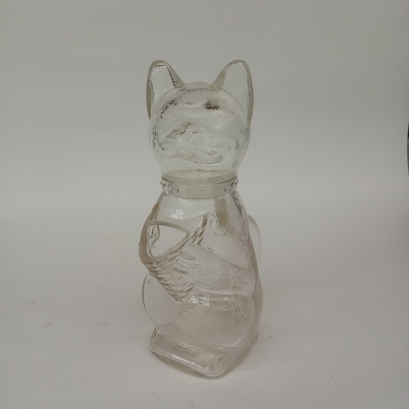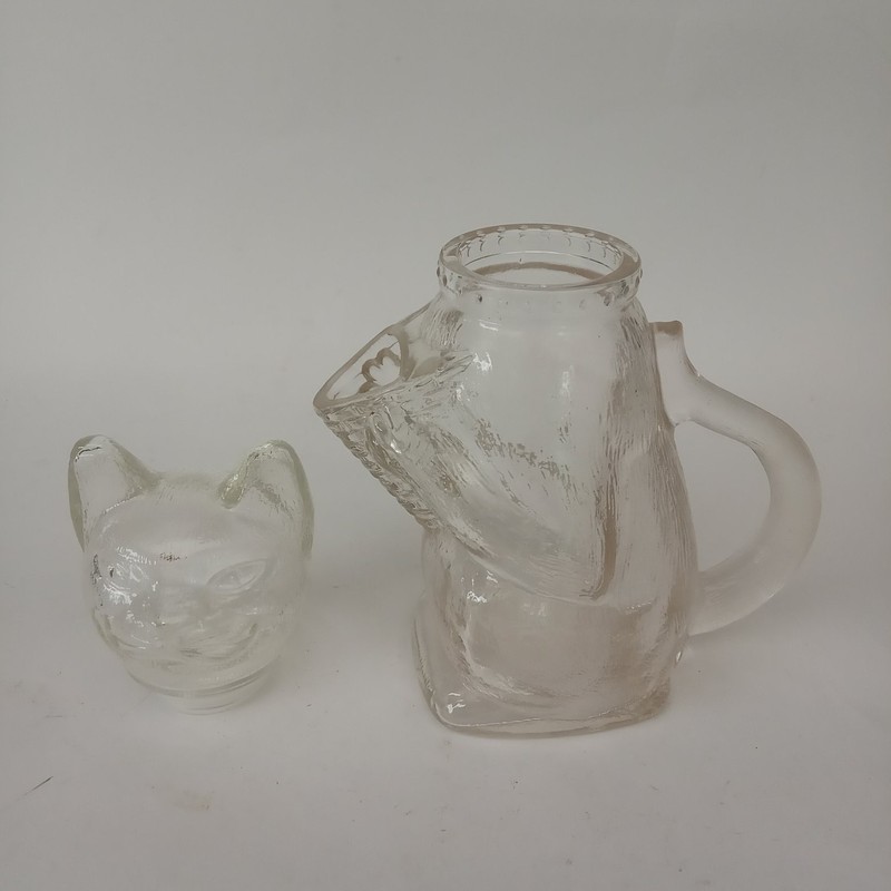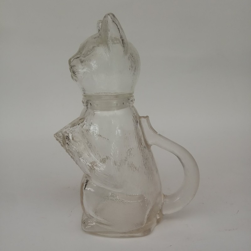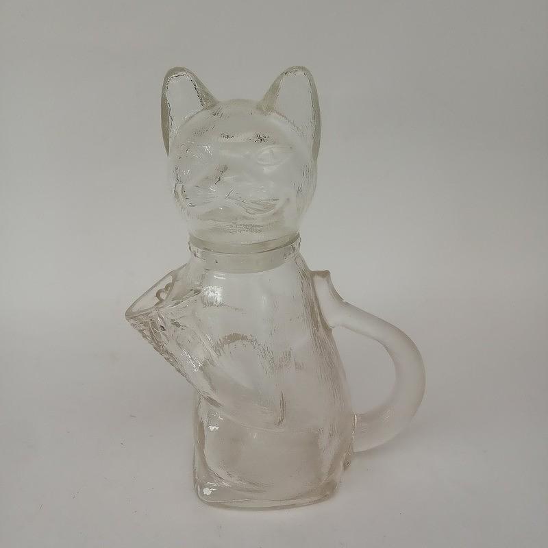 Curioso recipiente de vidrio transparente en forma de gato, la cabeza hace las veces de tapa y se puede desmontar del cuerpo, las manos forman el pico vertidor y la cola es el asa. Marcada en alto relieve en la base.