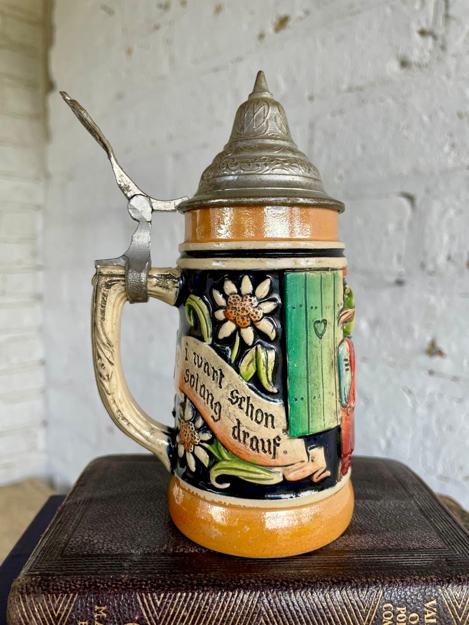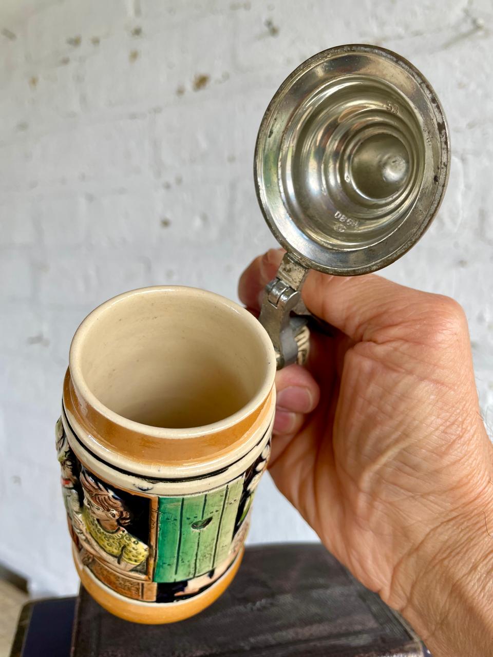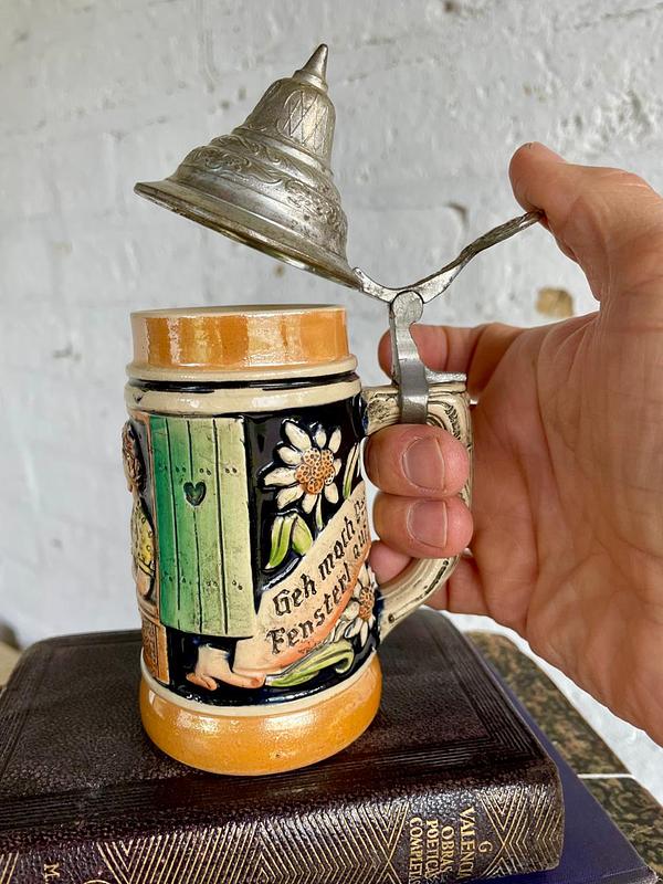 Jarro típico cervecero fabricado en Alemania Occidental en la década de los setenta, elaborado en porcelana con figuras en alto relieve y frases en alemán decoradas con pintura vidriada, la tapa es metálica. La base tiene escrito "made in West Germany". La capacidad del jarro es de 250 ml. Se encuentra en buen estado.